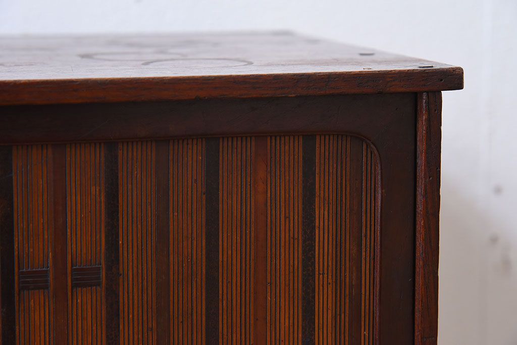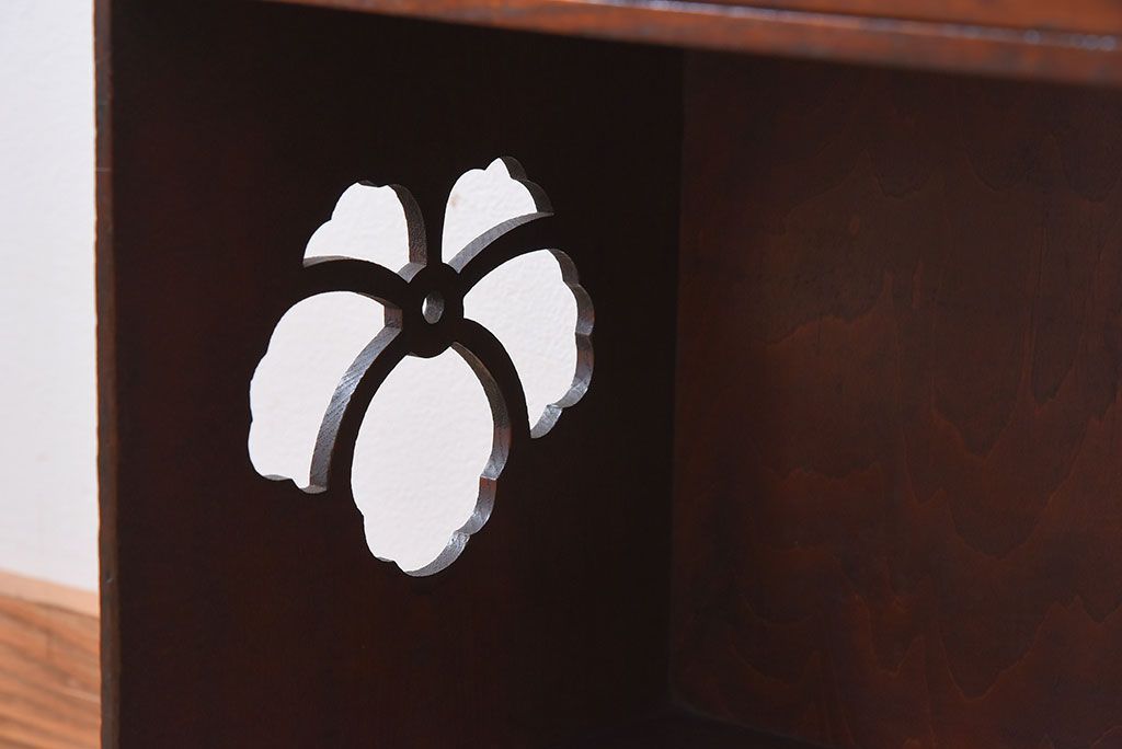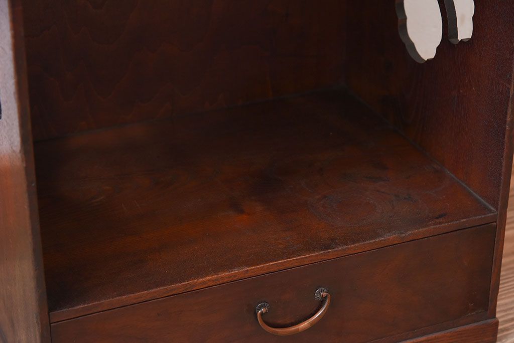 桑材製 透かし彫り 上品な意匠の小さなアンティーク収納棚です。
