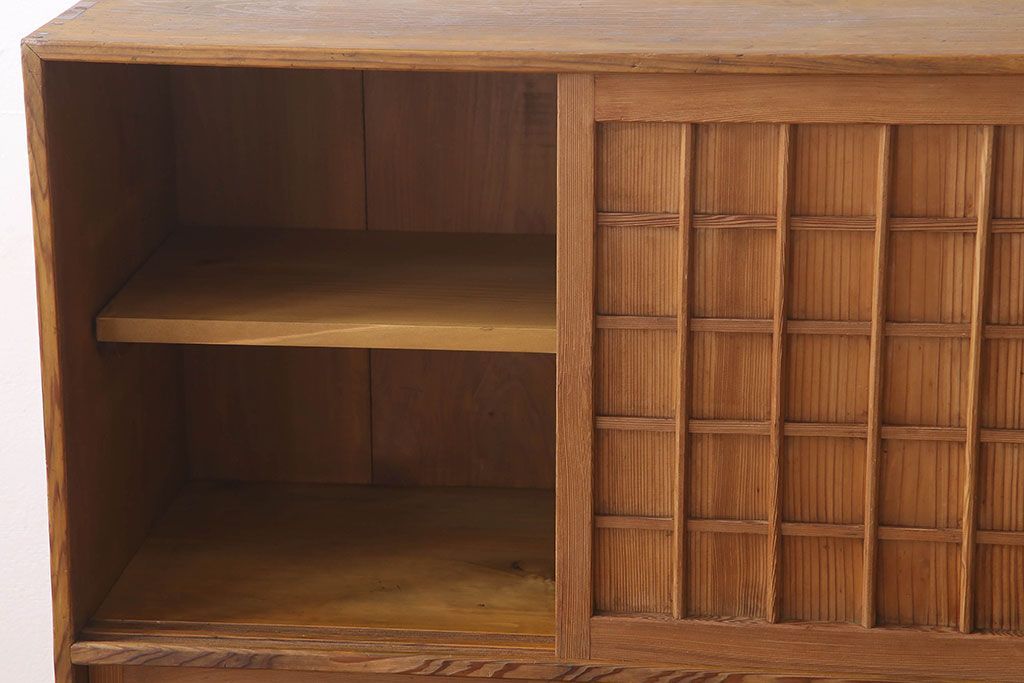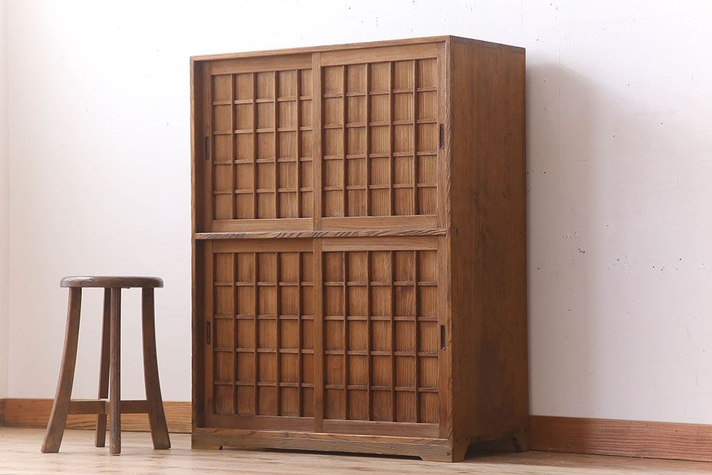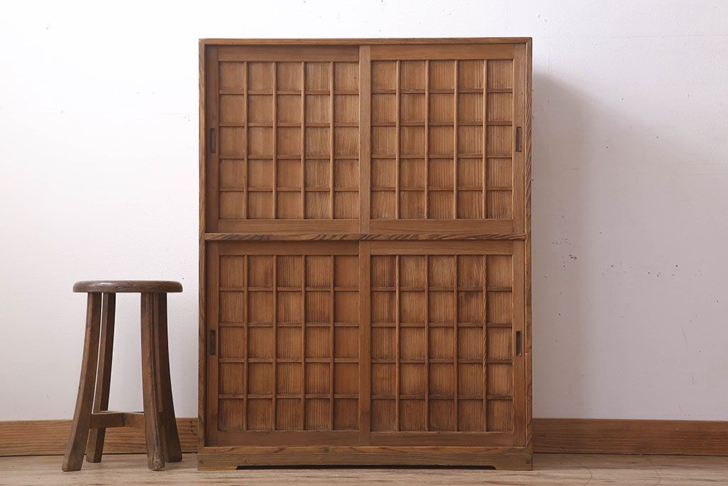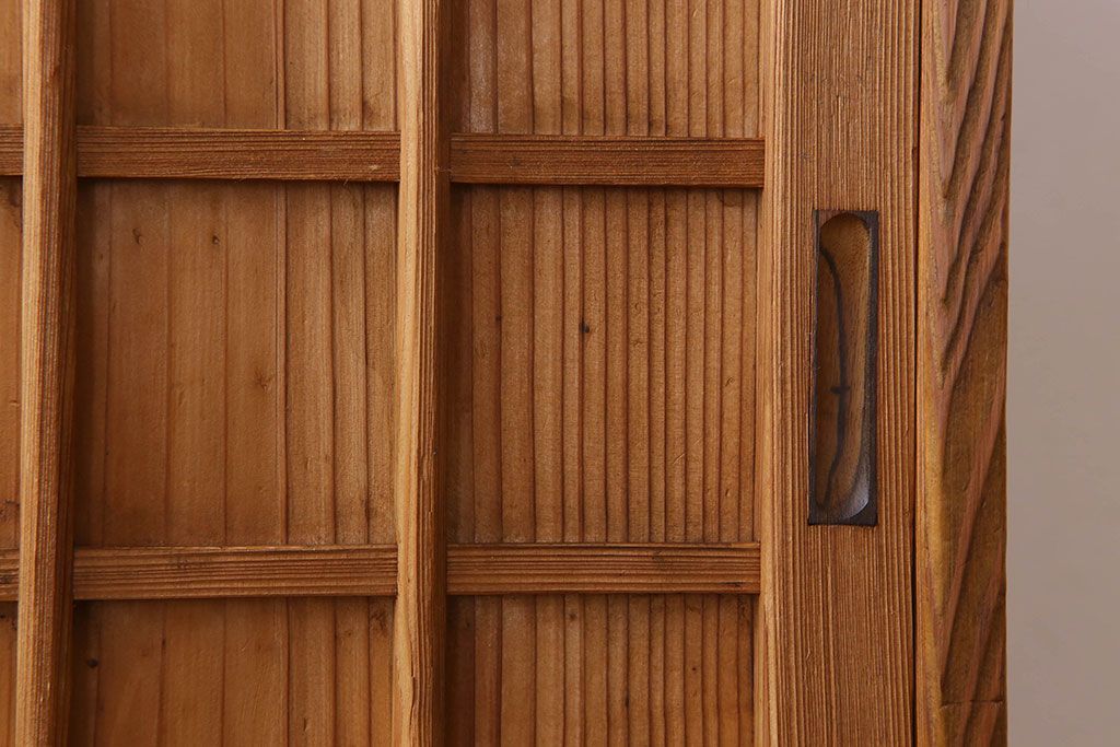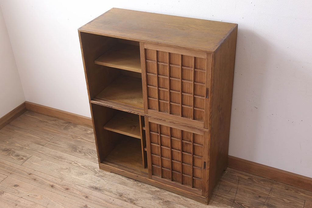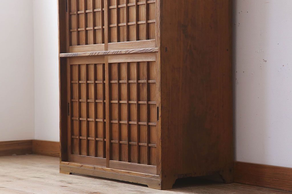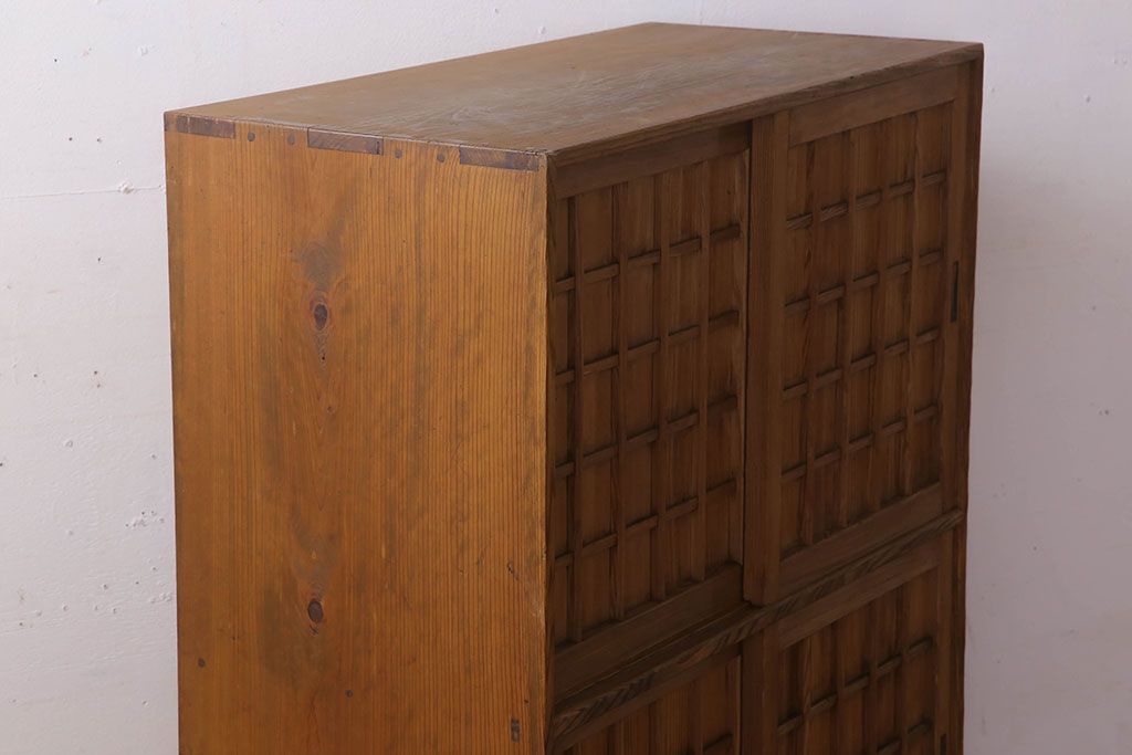アンティーク家具 大正昭和期 檜材製 格子引き戸の小ぶりな収納棚(下駄箱)