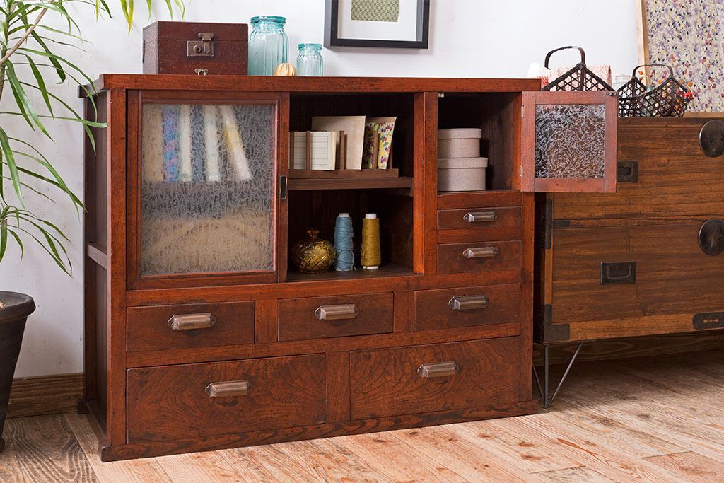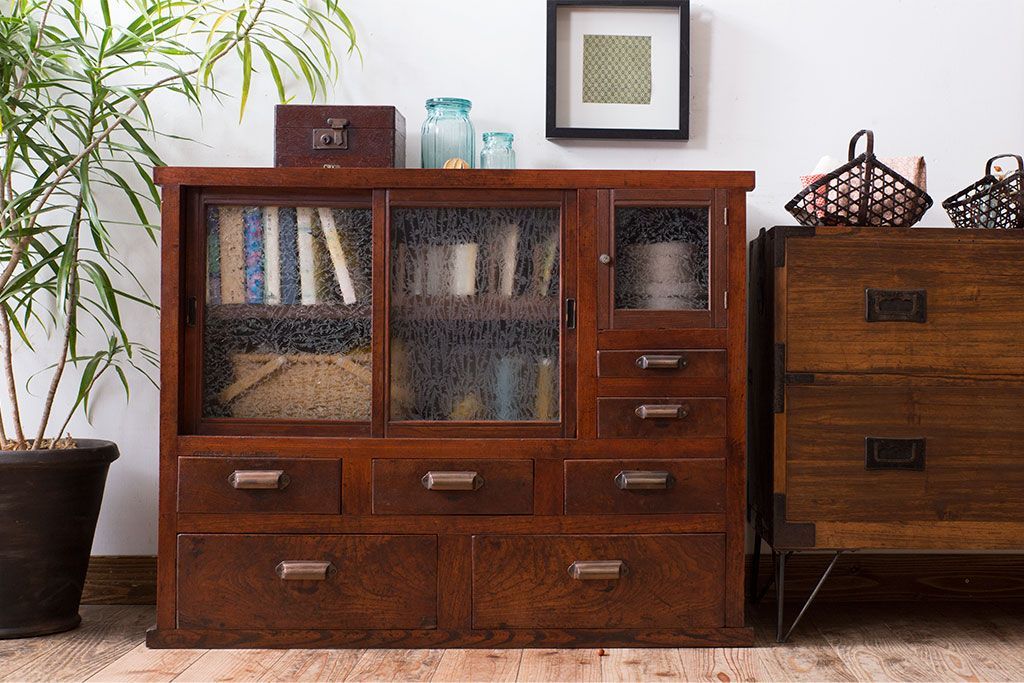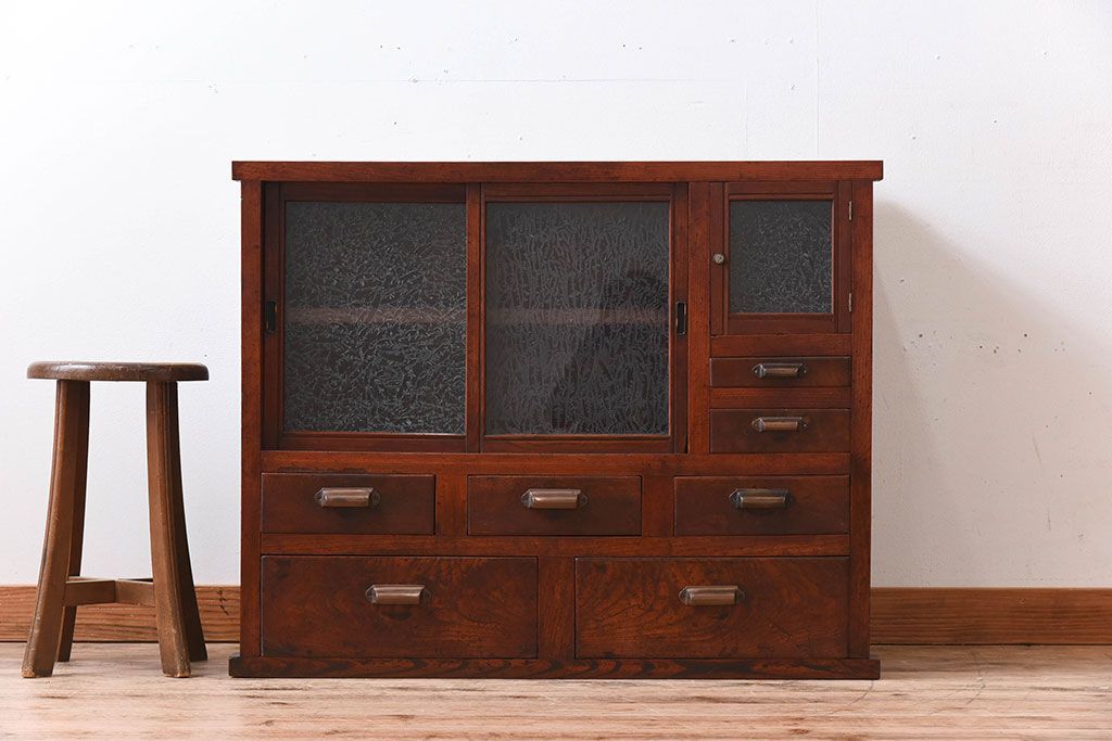 アンティーク家具 結霜ガラス入り!前面欅材の小ぶりなアンティーク収納棚(2)です。