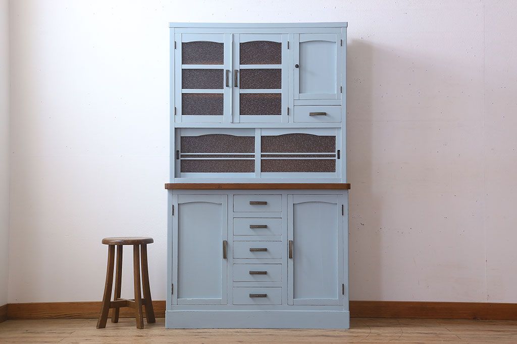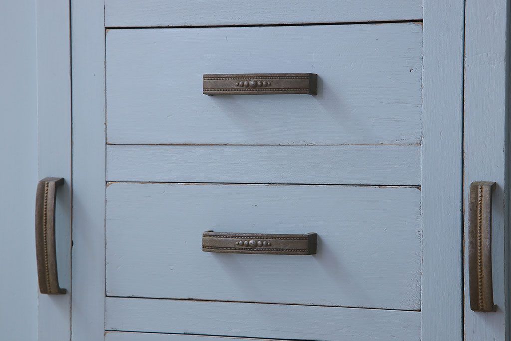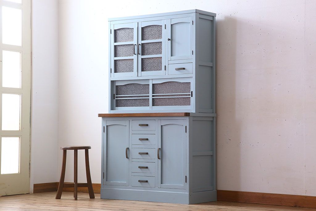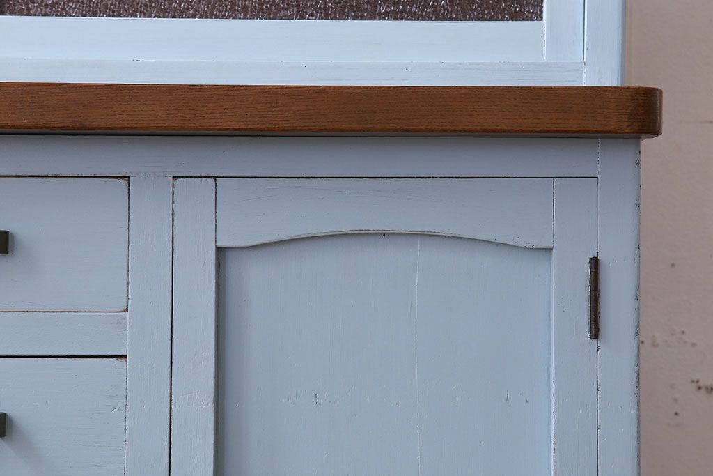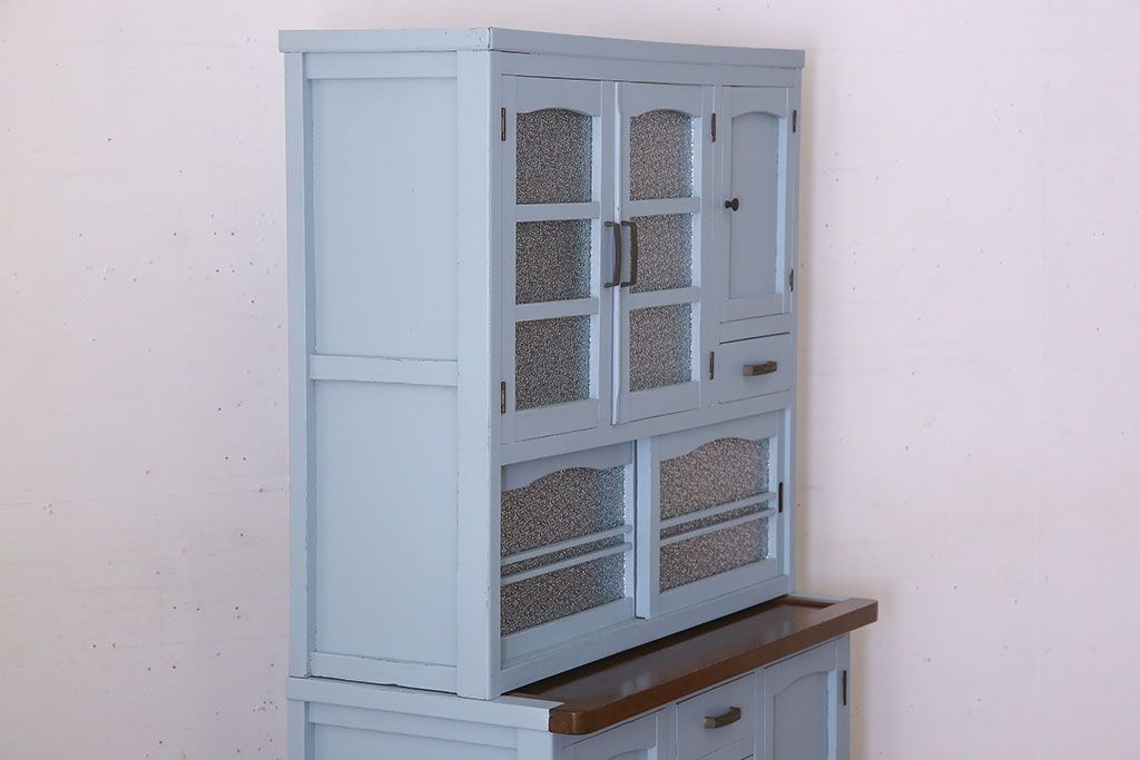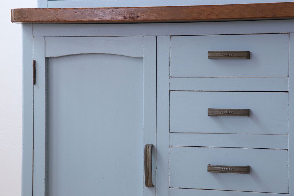 アンティーク家具 作業台付き 水色ペイントのおしゃれなアンティークカップボード