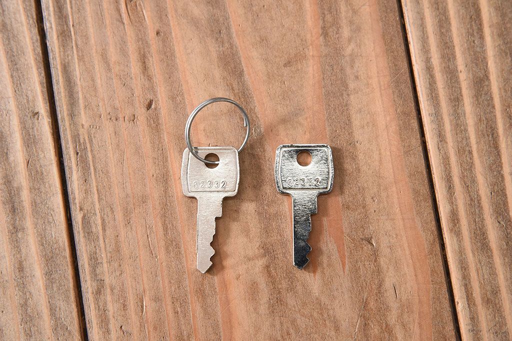 鍵は付属します。画像にありますように、袋に入れお付けします。スムーズに動くように調整していますが、あくまでも 古いもの/中古品 ですので、長期の使用保証は出来かねます。ご購入後不具合が発生した場合は、当店でサポートさせていただきますので、お気軽にご相談くださいませ。