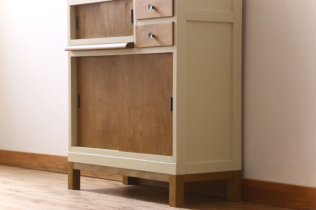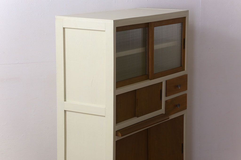 ラフジュ工房> キャビネット・戸棚> 食器棚・カップボード > アンティーク家具 アンティークペイント 脚付き!モールガラス引き戸の小振りな食器棚(2)
