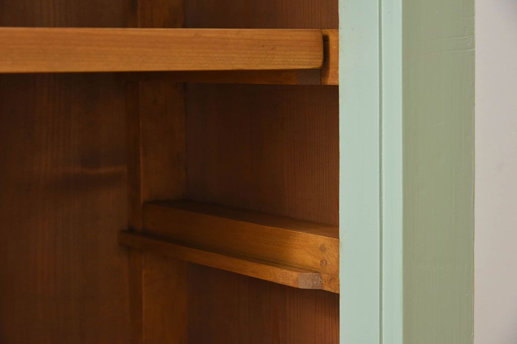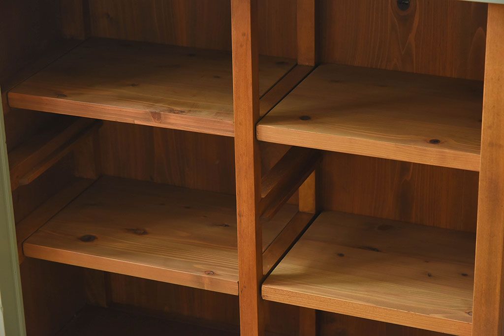 棚板は取り外しできます。130mm毎に調整できます。棚板はわかれています。棚幅の1/4ごとに取り外しが可能です。