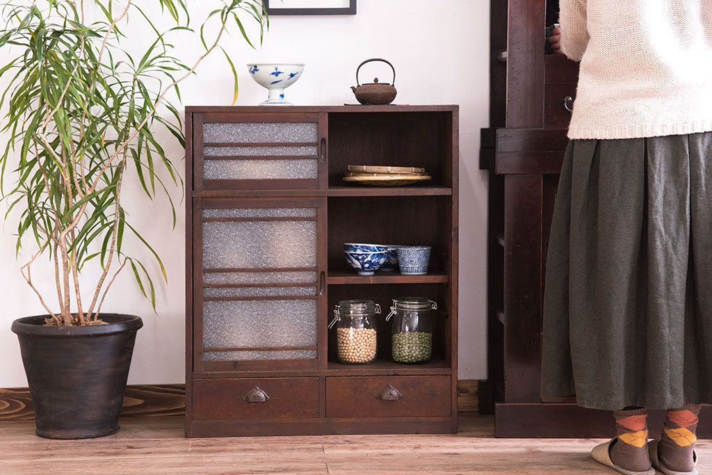 ラフジュ工房> キャビネット・戸棚> 食器棚・カップボード > レトロ家具 昭和期 レトロ ダイヤガラス!アンティーク収納棚