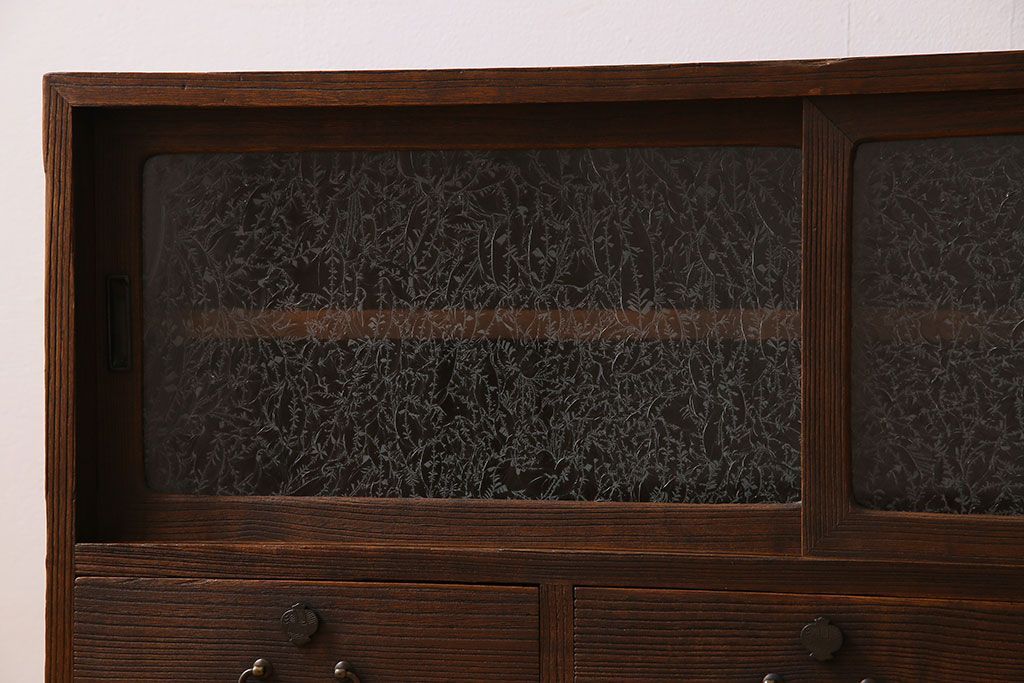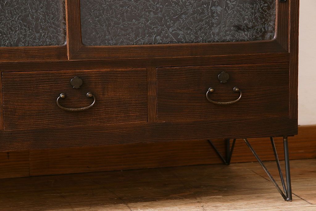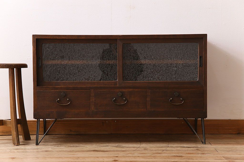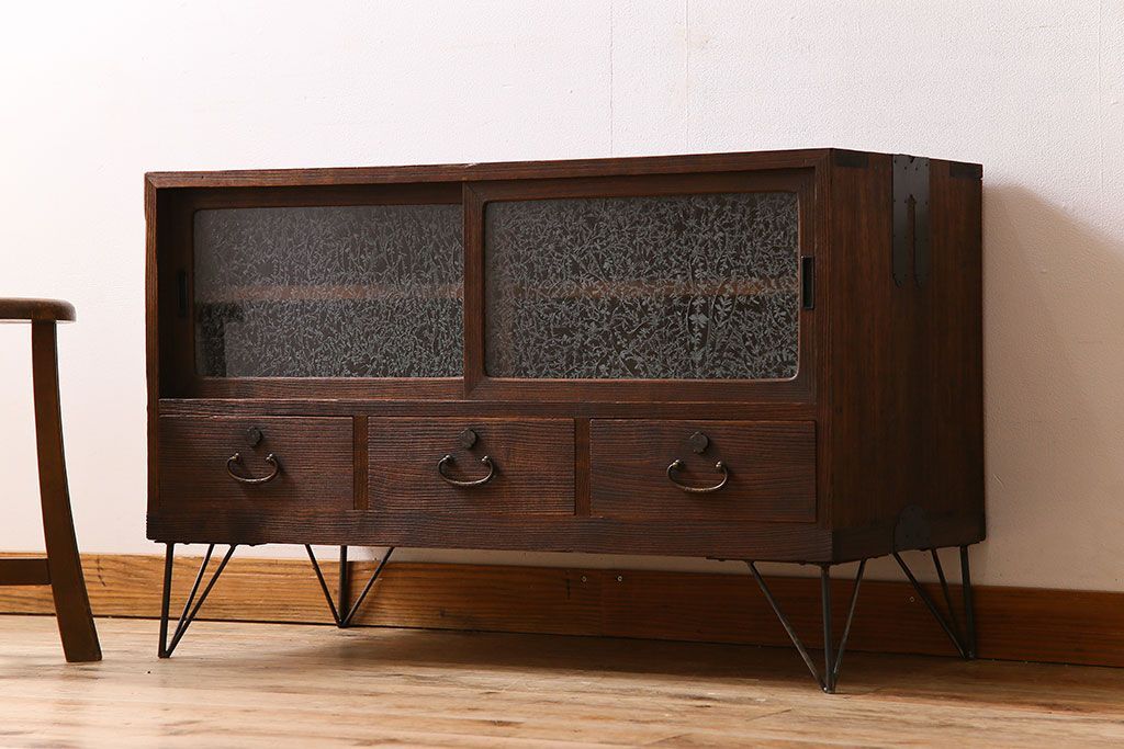アンティーク家具 和製アンティーク 結霜ガラス入り!和モダンな鉄脚付きタンスローボード(箪笥)