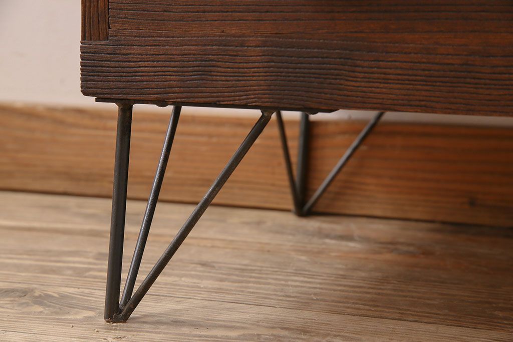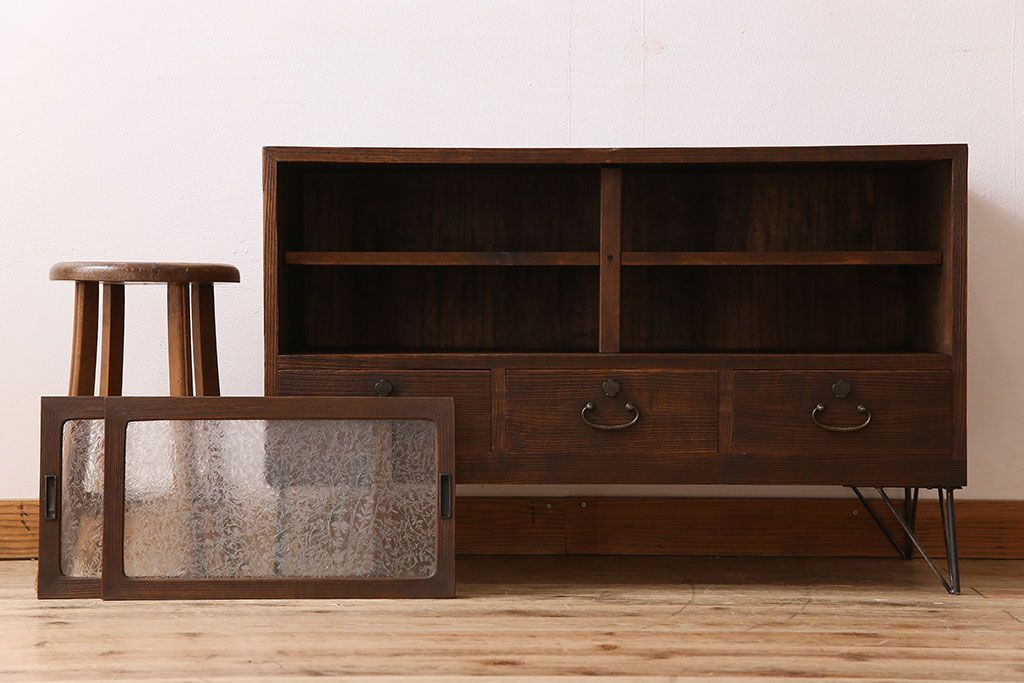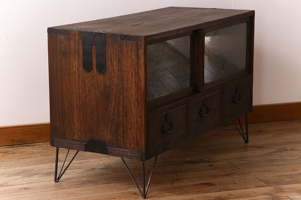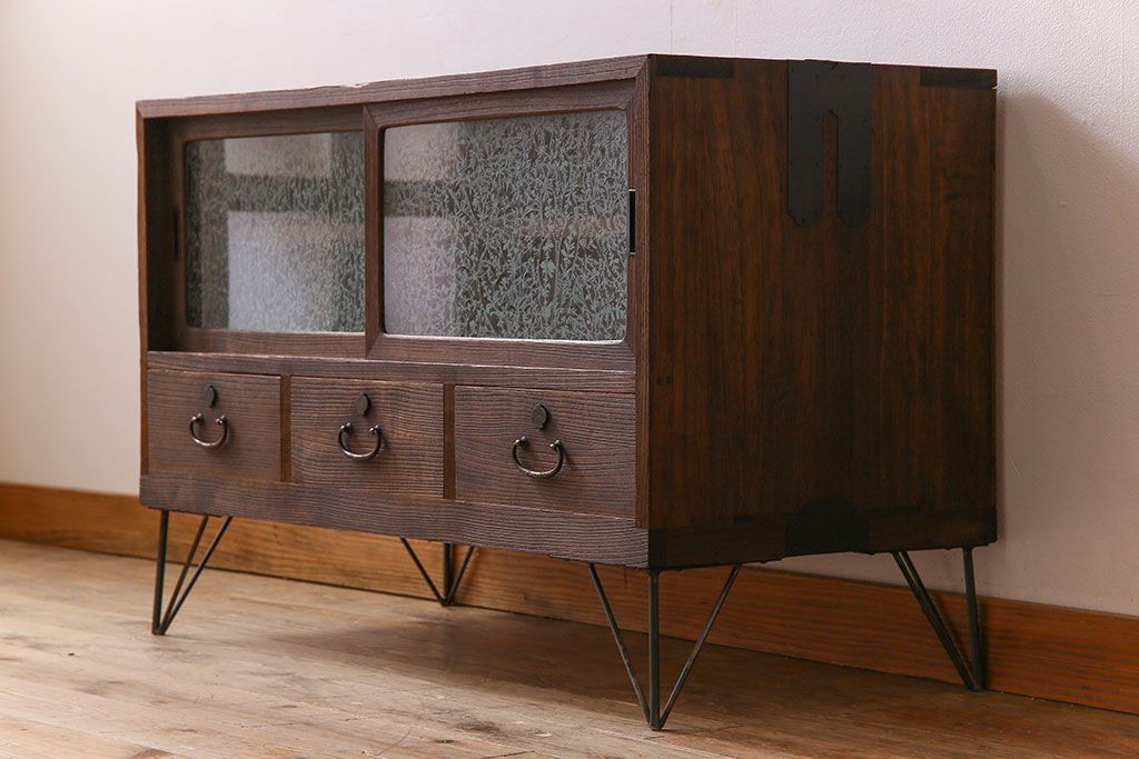 ラフジュ工房> キャビネット・戸棚> テレビ台・ローボード > アンティーク家具 和製アンティーク 結霜ガラス入り!和モダンな鉄脚付きタンスローボード(箪笥)