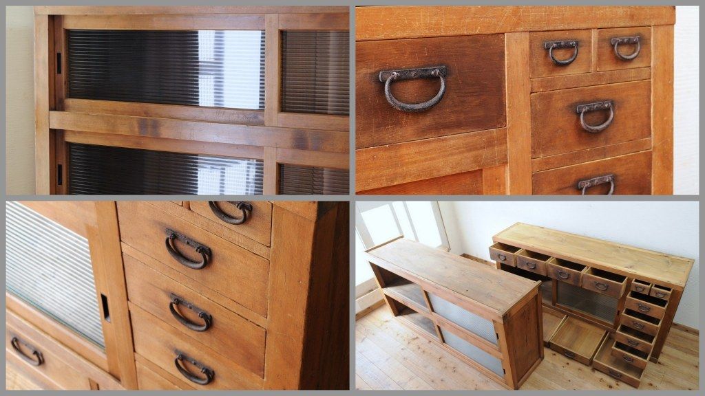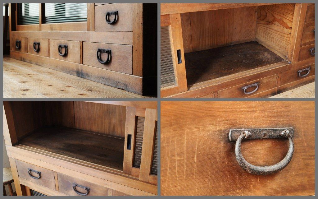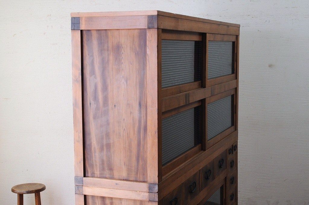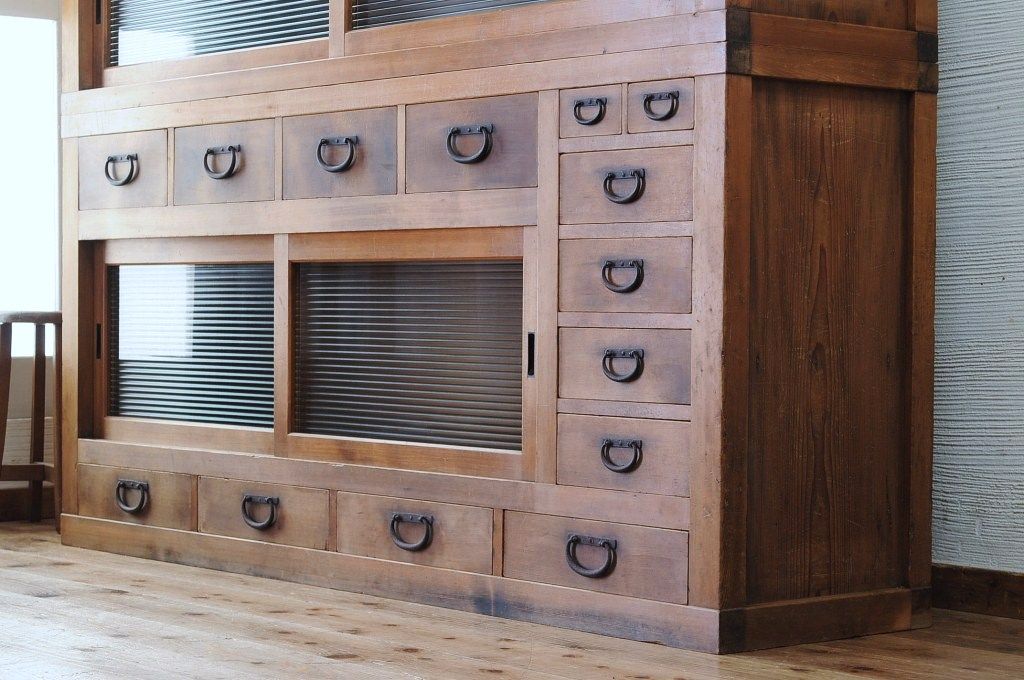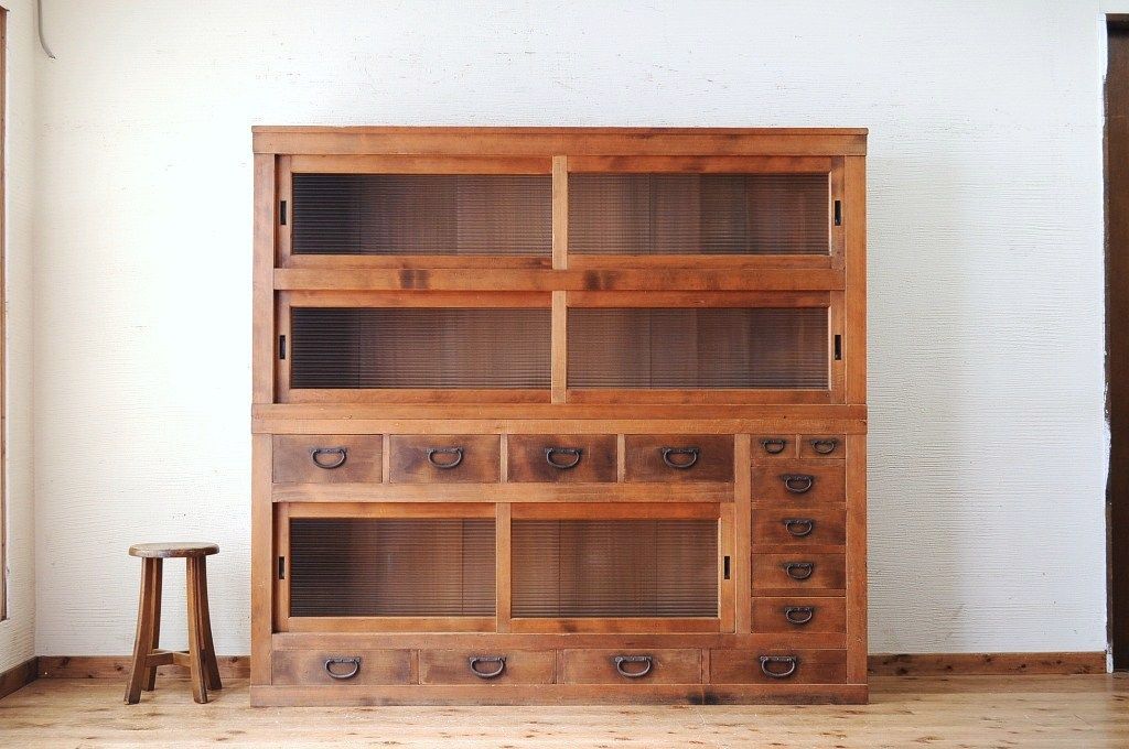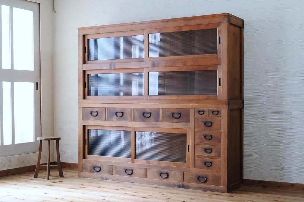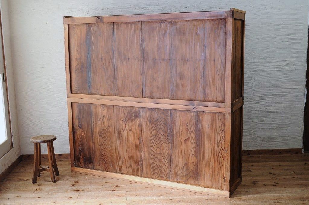 アンティーク家具 ◇特大!古い木味の二段重ねモールガラス収納棚