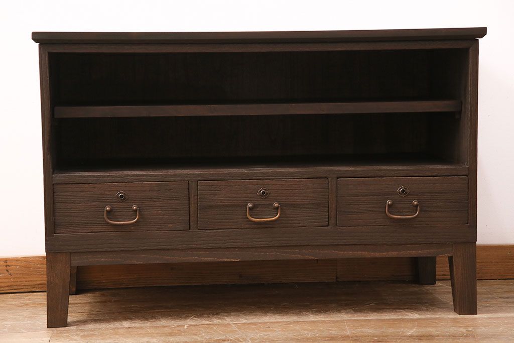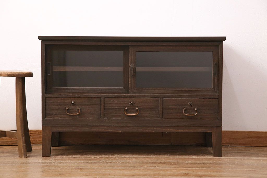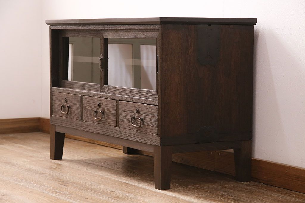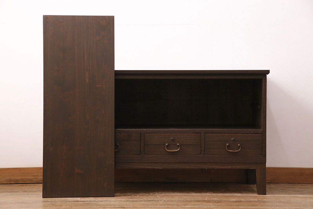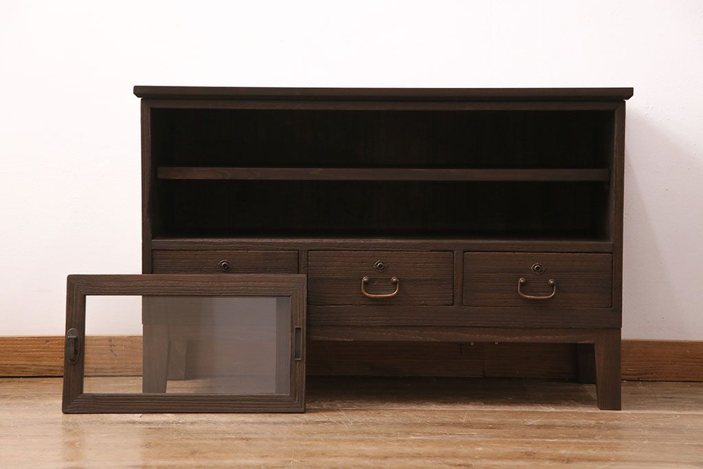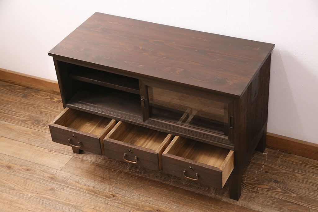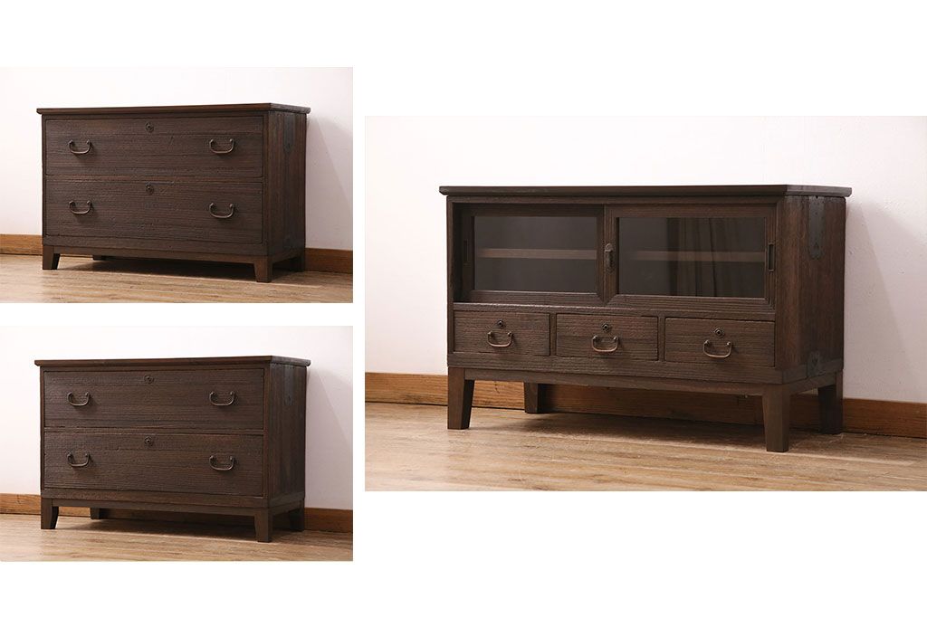 3段重ね桐箪笥をテレビボード、チェスト、ローボードにリメイク!上段は引き戸にクリアガラスをはめ込み、引手を取り付け。既存の棚板は撤去し、新たに棚板を製作。下段は引き出しをフリップダウン扉に変更。いずれも天板と木脚を取り付け、濃茶に着色仕上げ。