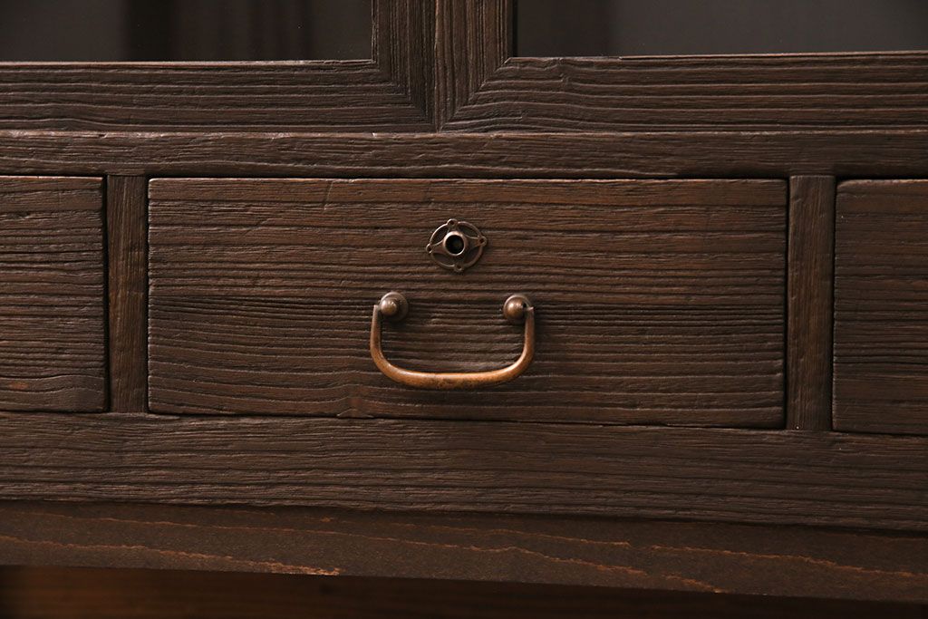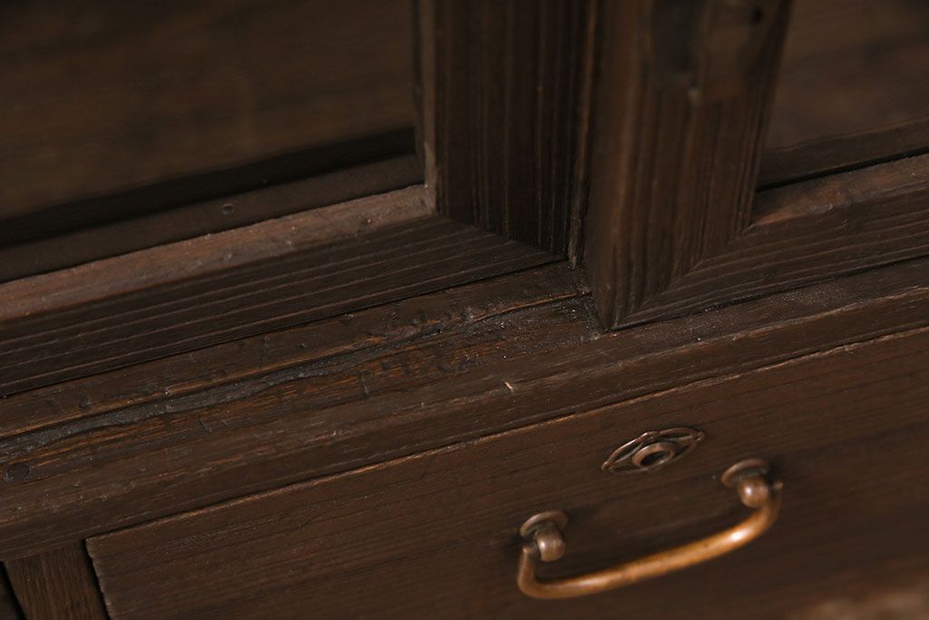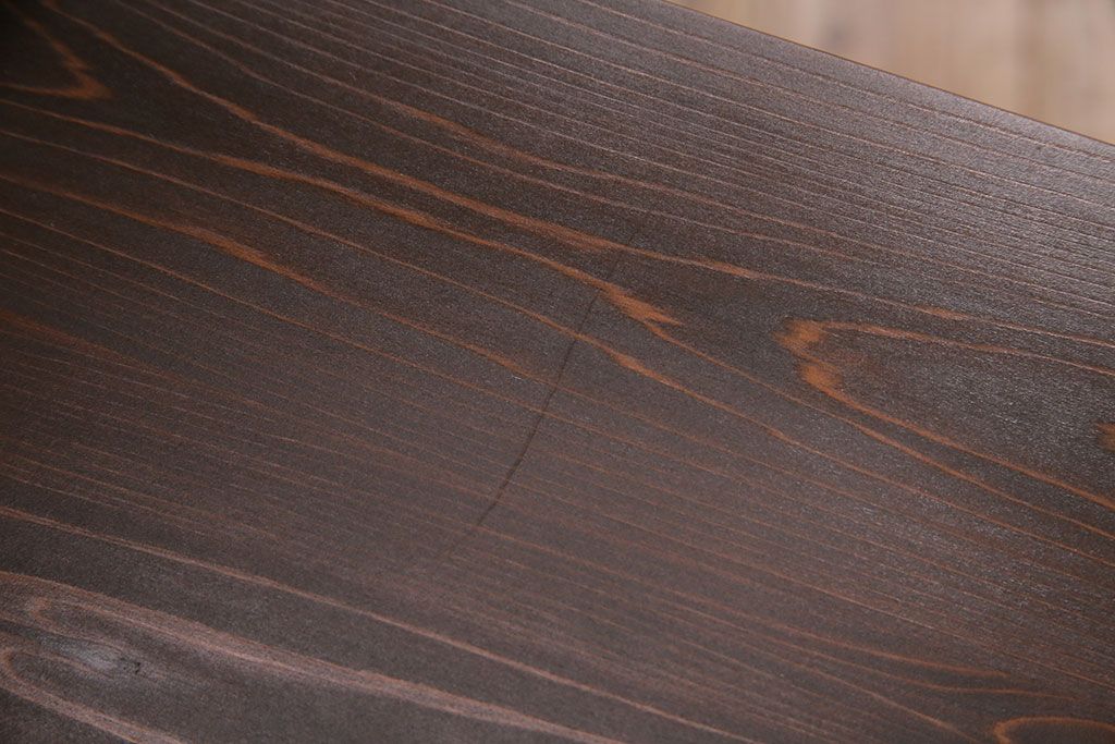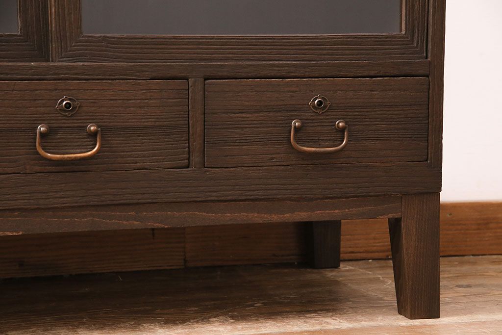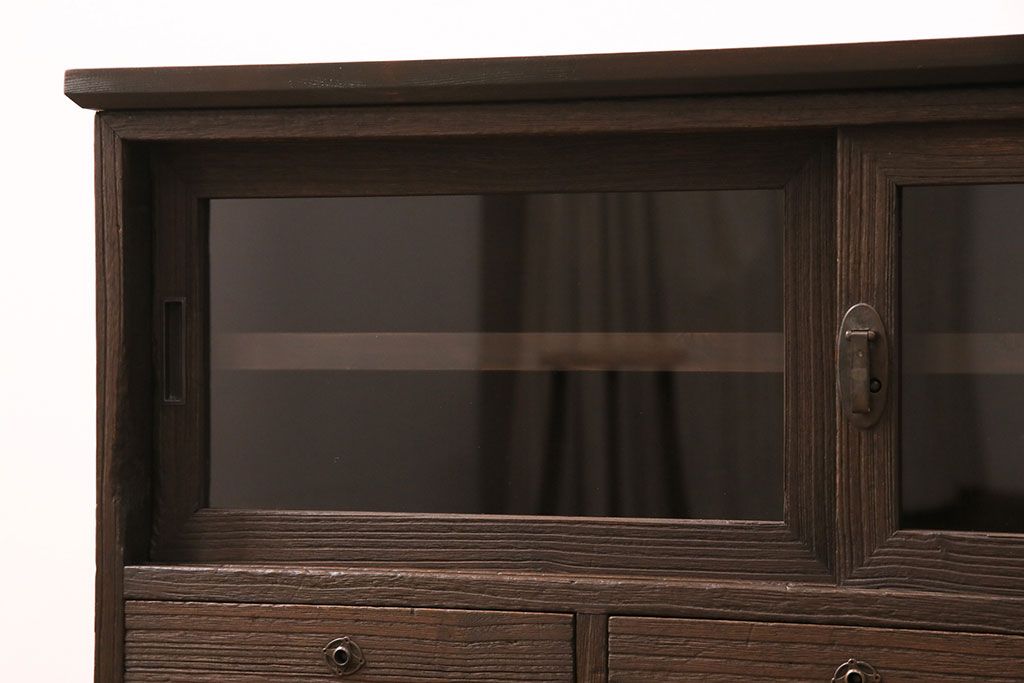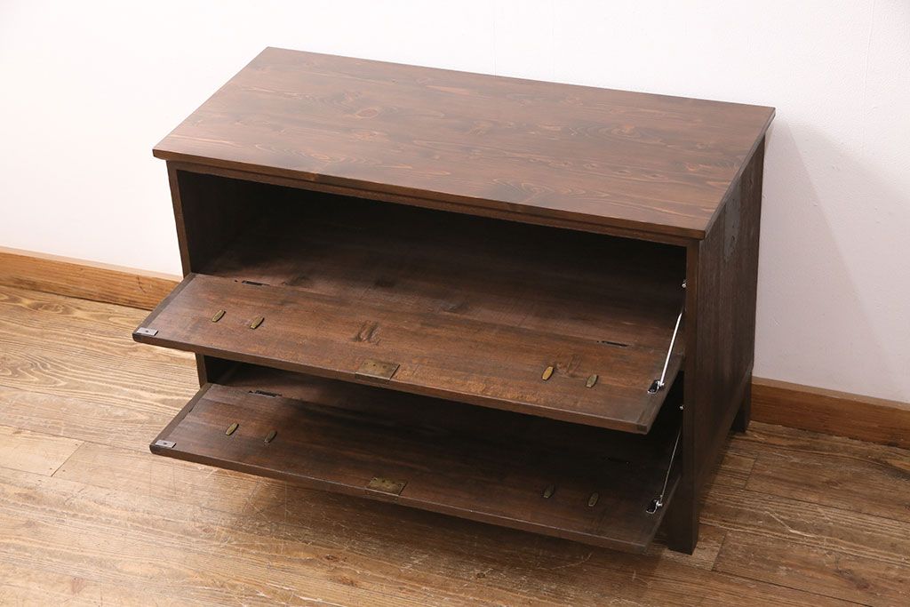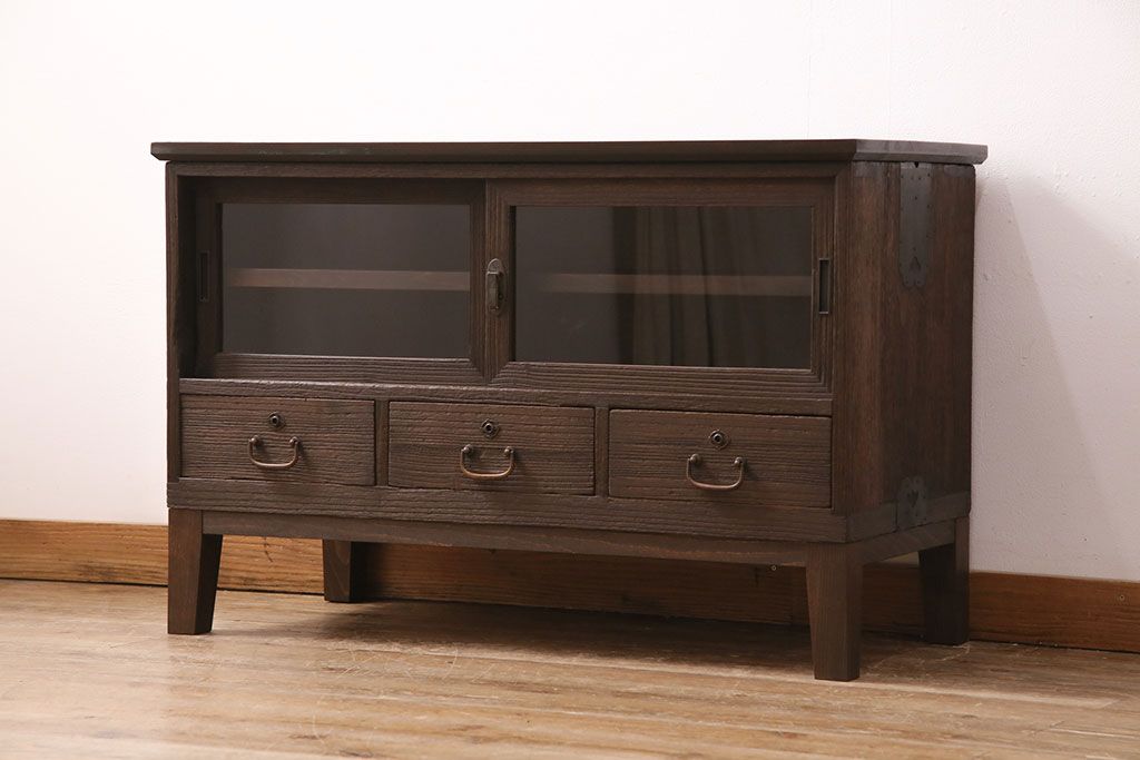 3段重ね桐箪笥をテレビボード、チェスト、ローボードにリメイク!上段は引き戸にクリアガラスをはめ込み、引手を取り付け。既存の棚板は撤去し、新たに棚板を製作。下段は引き出しをフリップダウン扉に変更。いずれも天板と木脚を取り付け、濃茶に着色仕上げ。