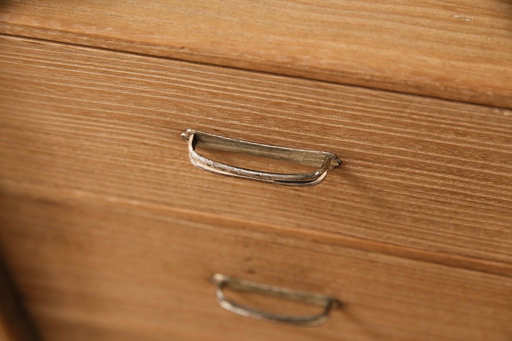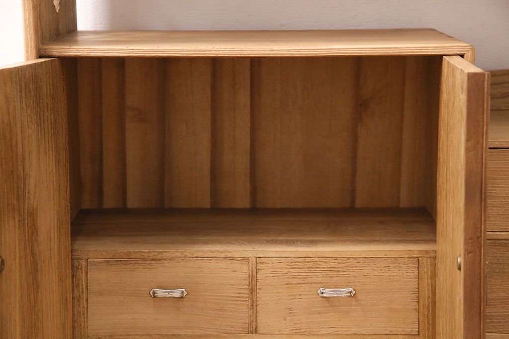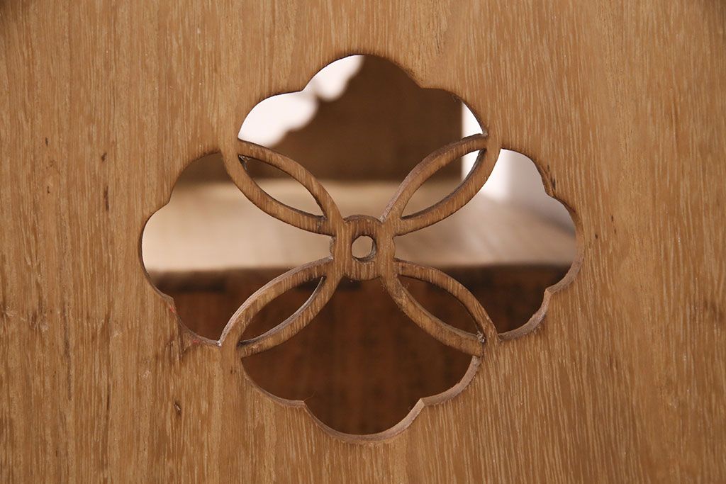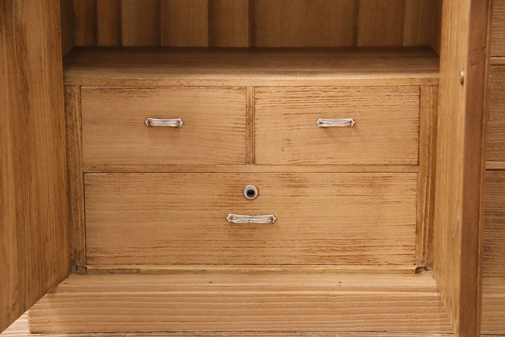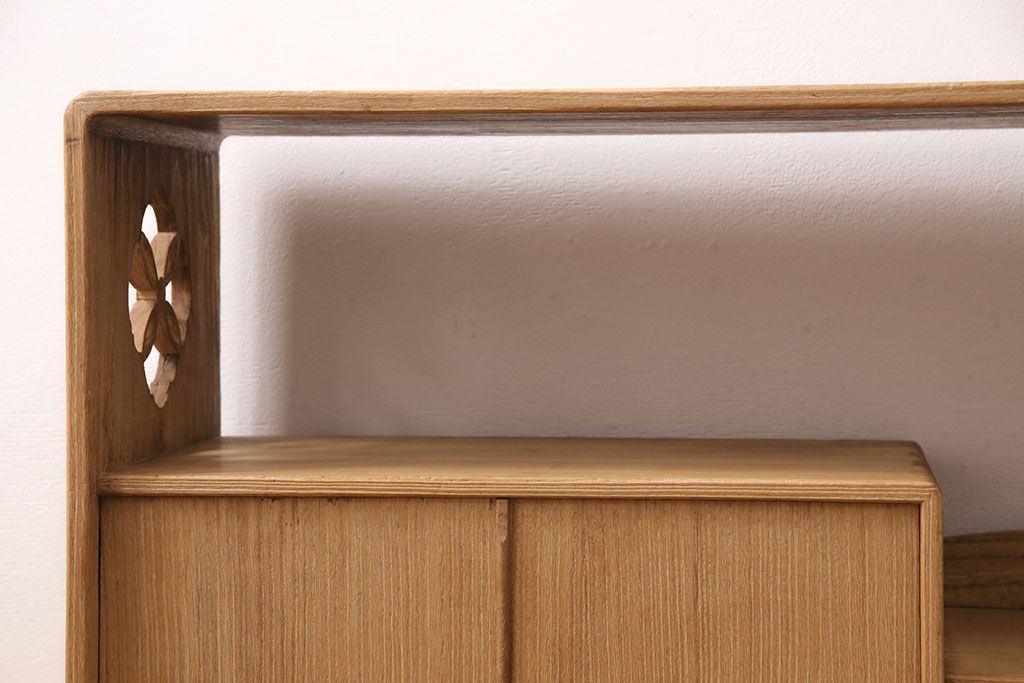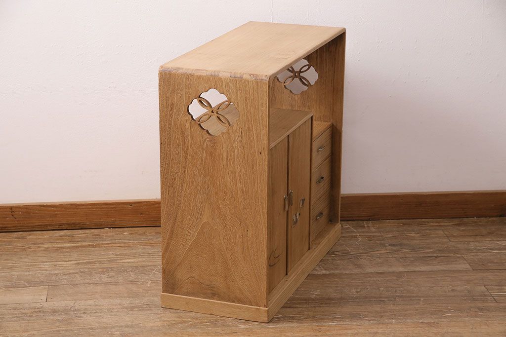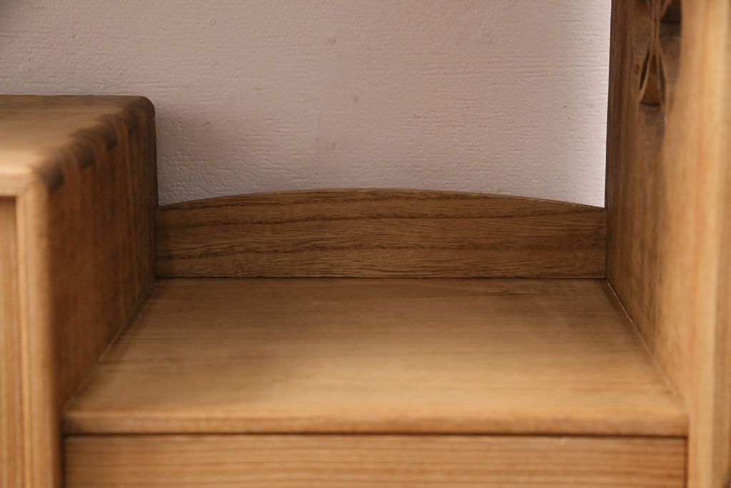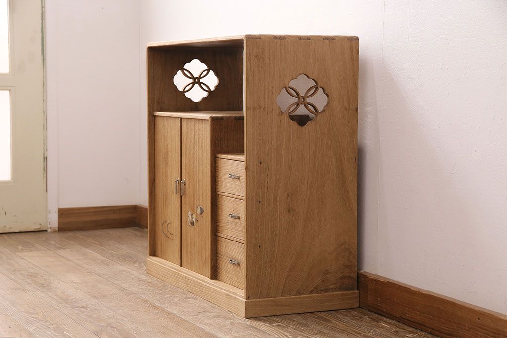 桐材収納棚を茶棚にリメイク!棚下のローラーを取り外し、透かし彫りを復元。右側引き出し上部に渡し板を取り付け。蜜蝋ワックス仕上げに。