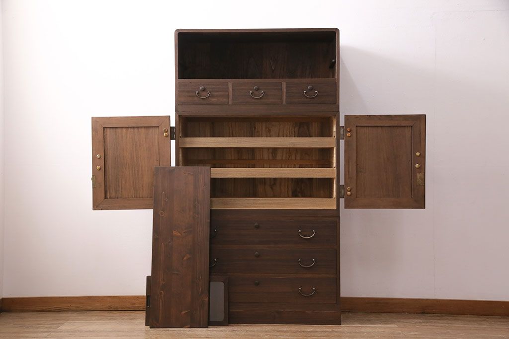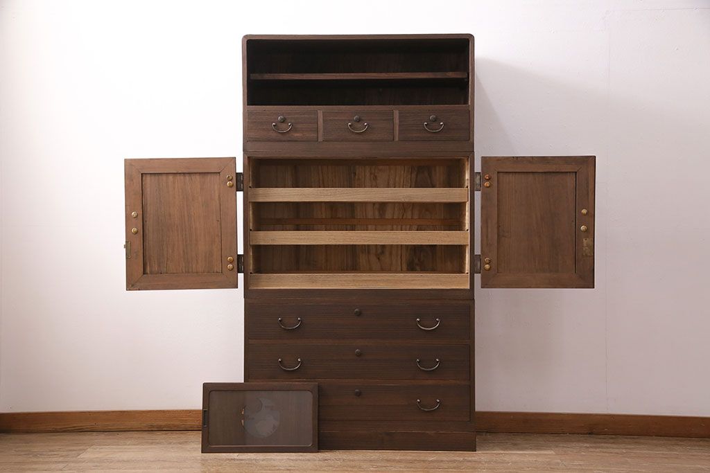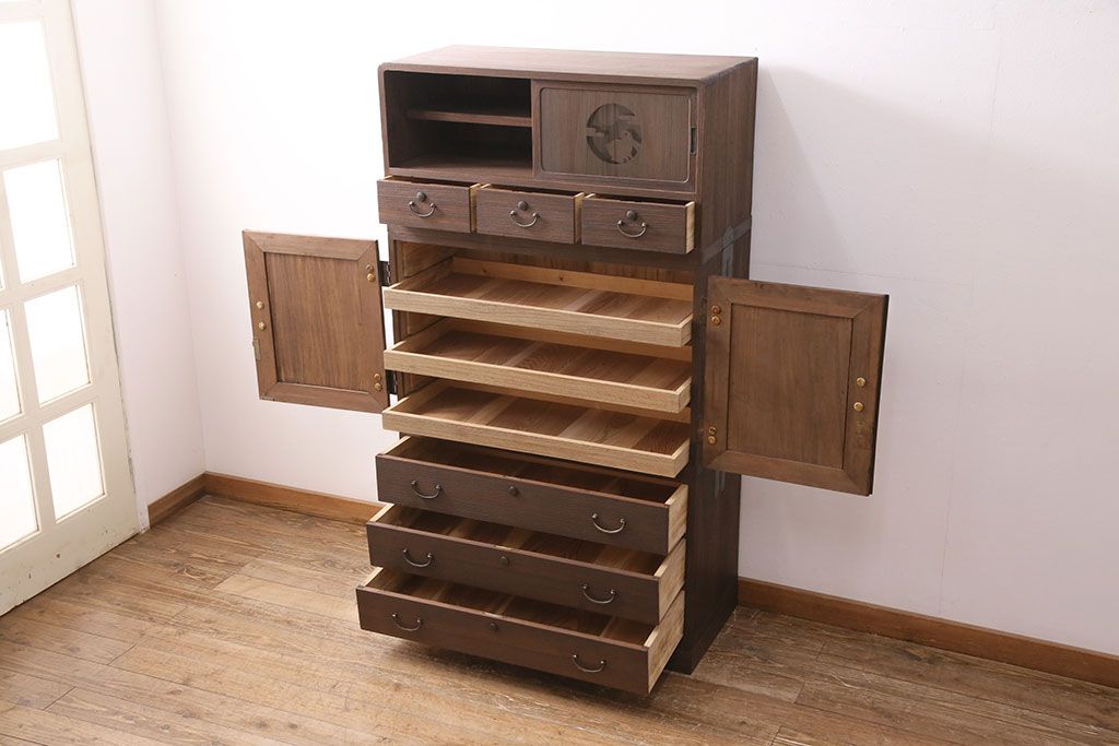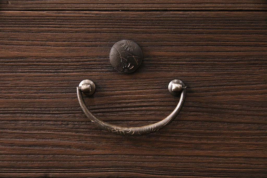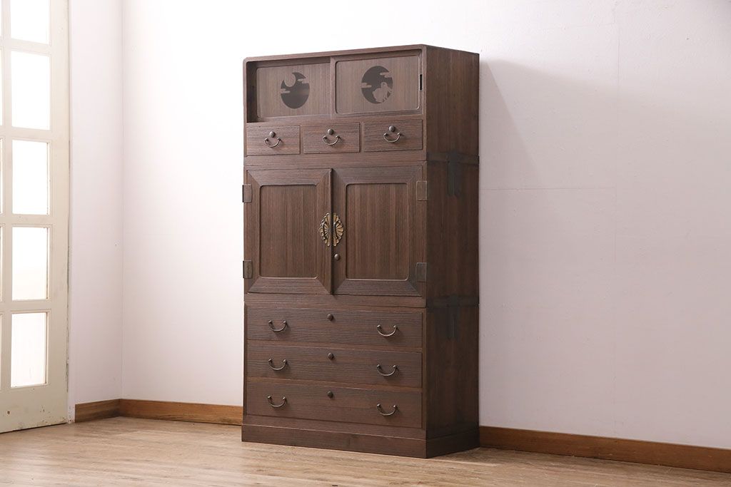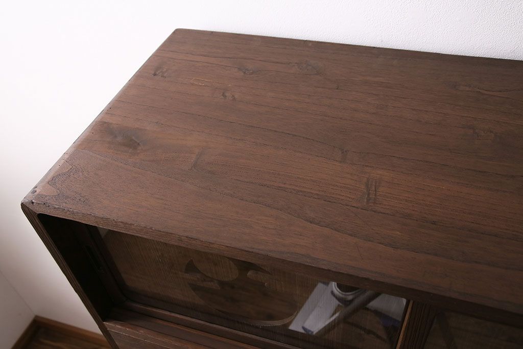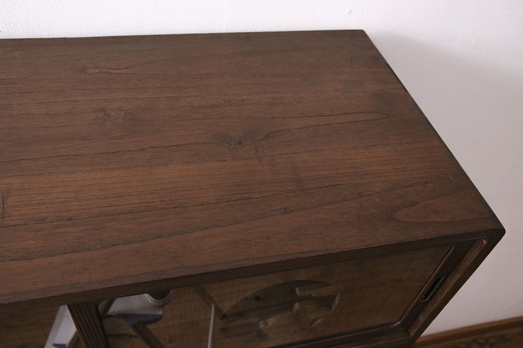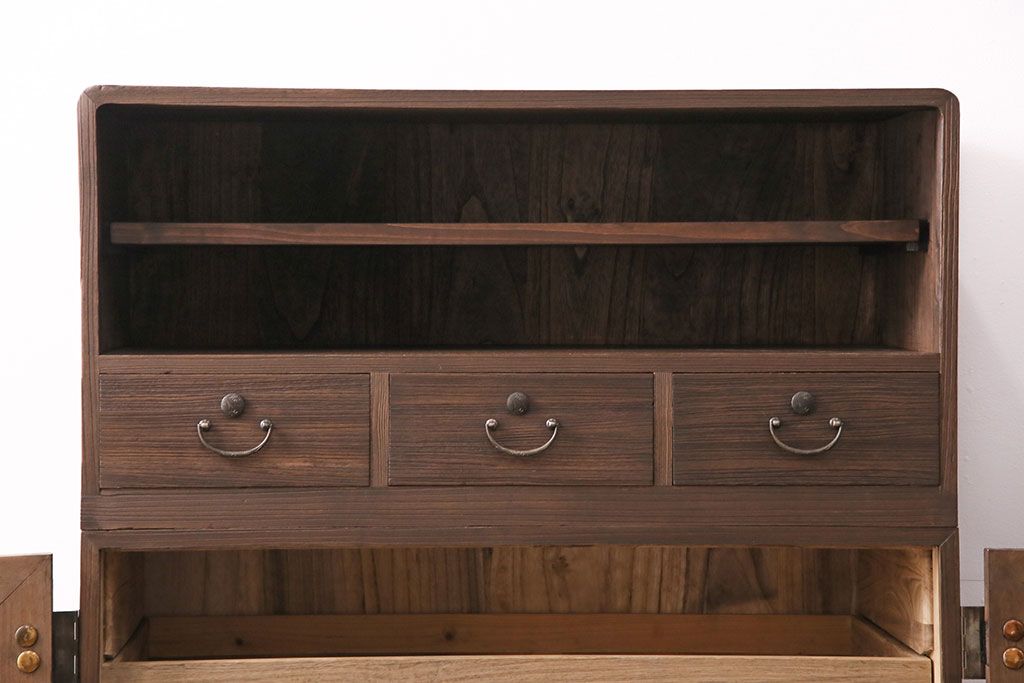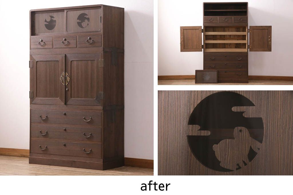 3段重ね桐箪笥をお好みのデザインにリメイク!上段の引き戸に透かし彫りとクリアガラスを追加、引手を交換。飾り棚を1枚の棚板に変更。高品質リペアを施し、着色仕上げ。