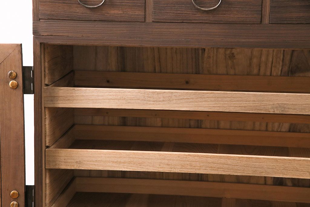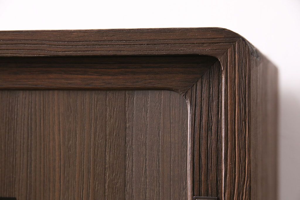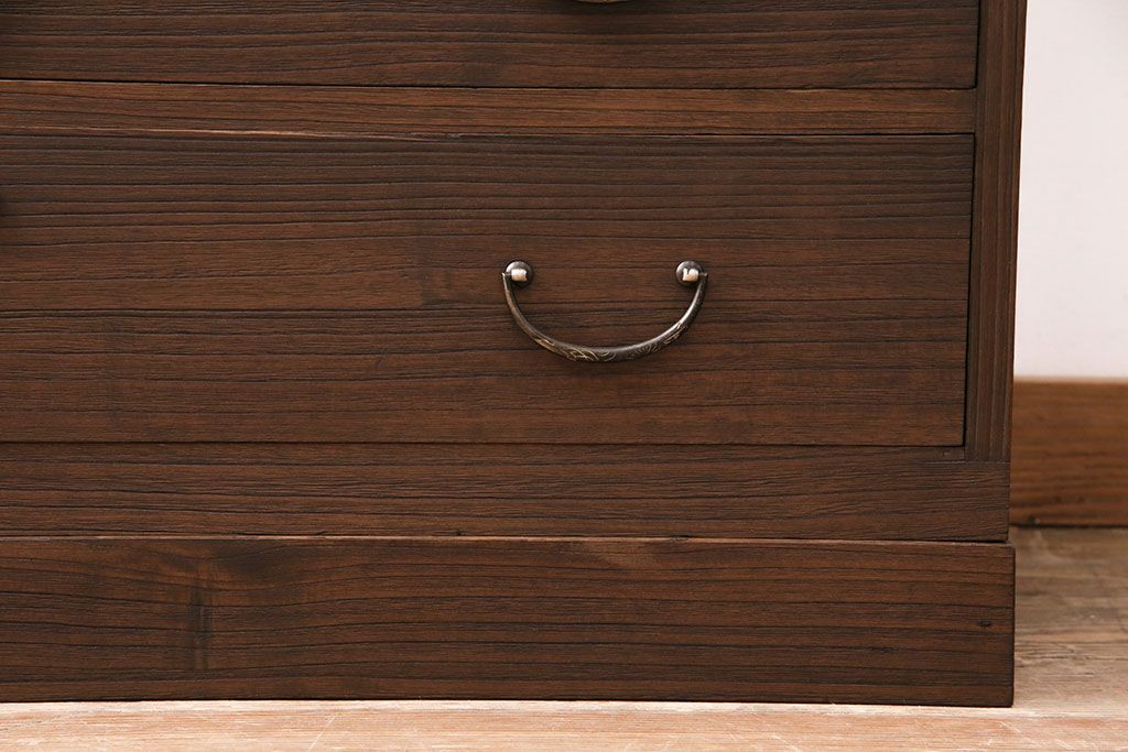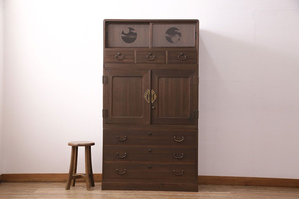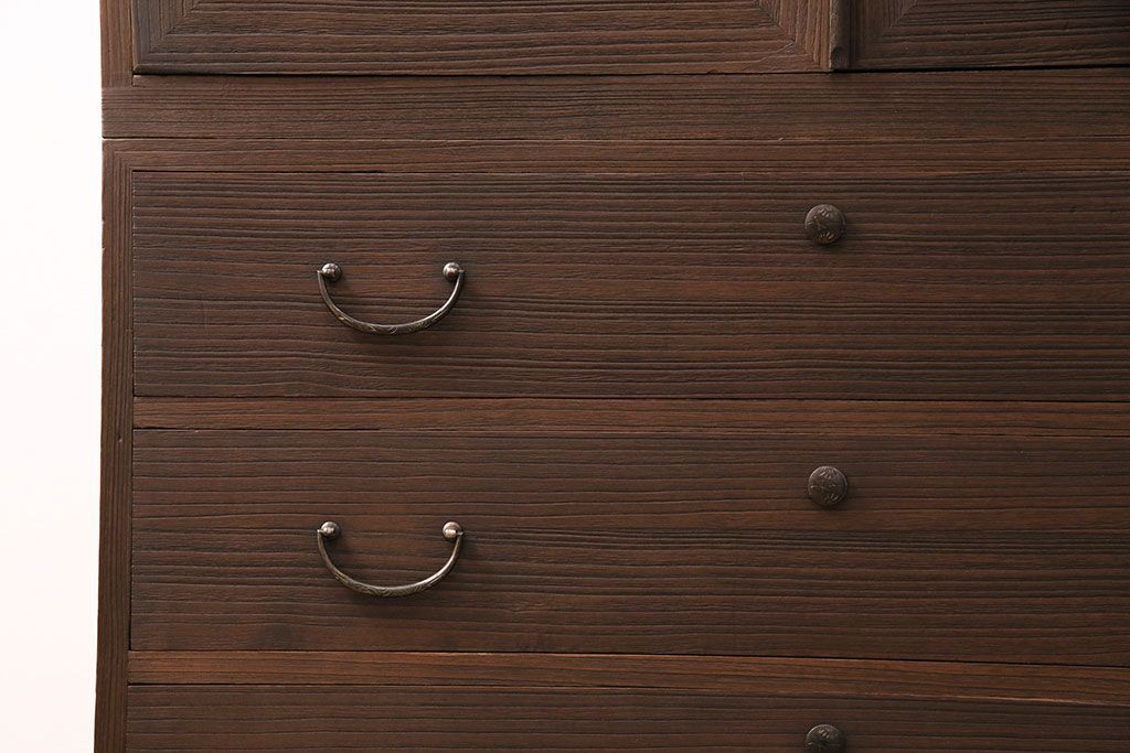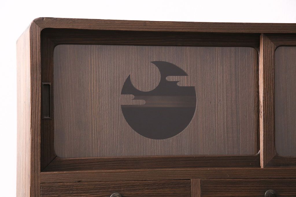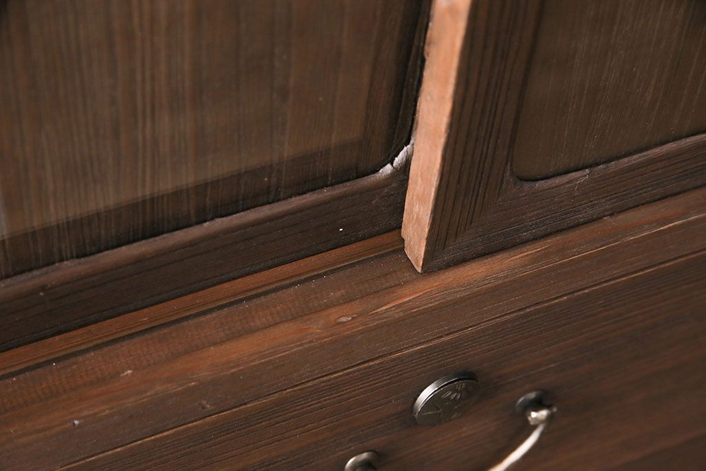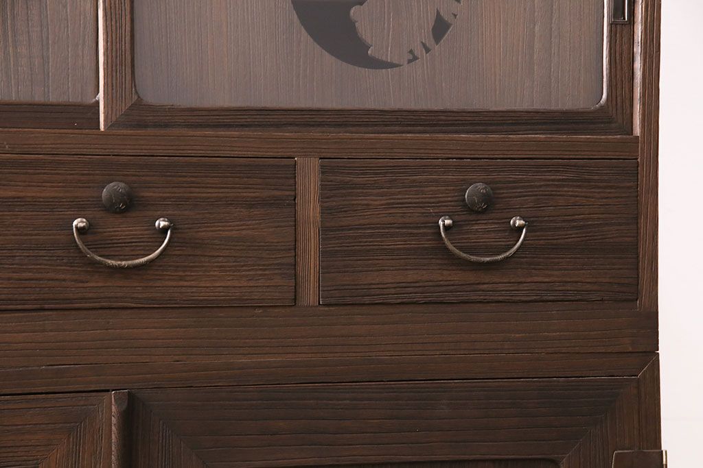 3段重ね桐箪笥をお好みのデザインにリメイク!上段の引き戸に透かし彫りとクリアガラスを追加、引手を交換。飾り棚を1枚の棚板に変更。高品質リペアを施し、着色仕上げ。