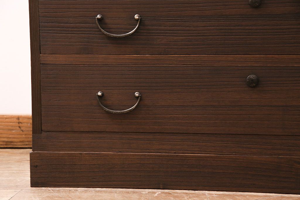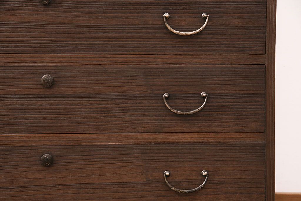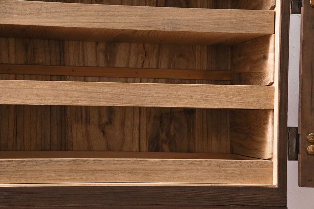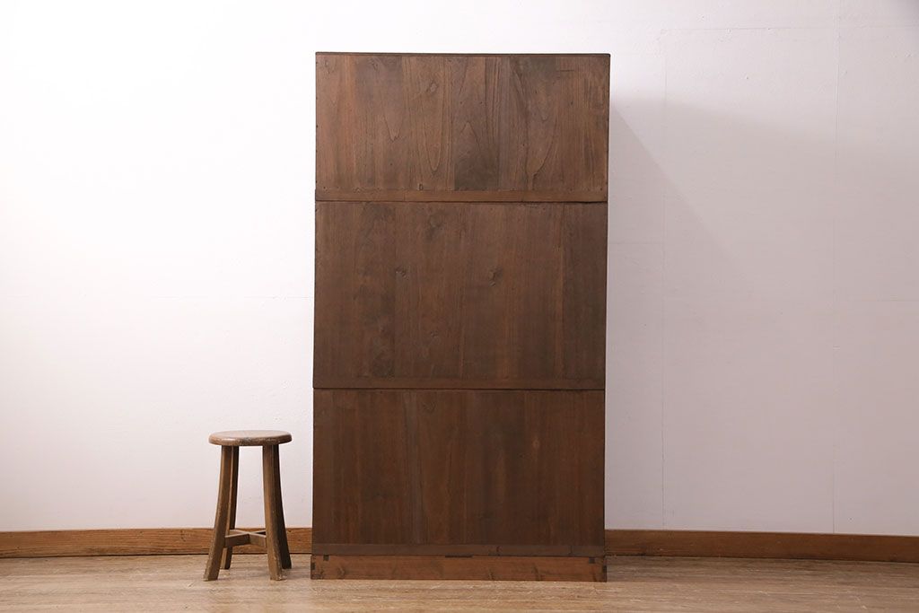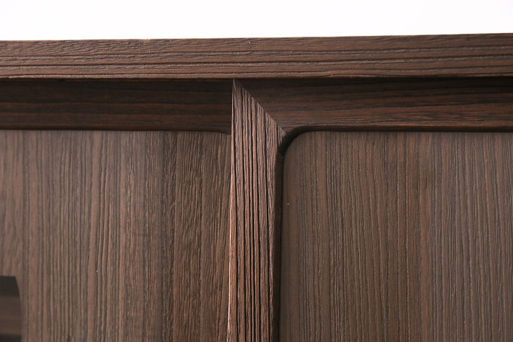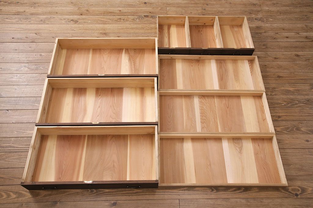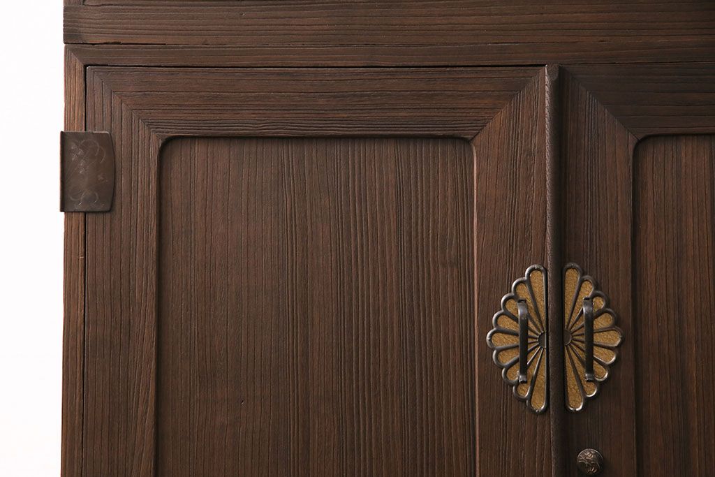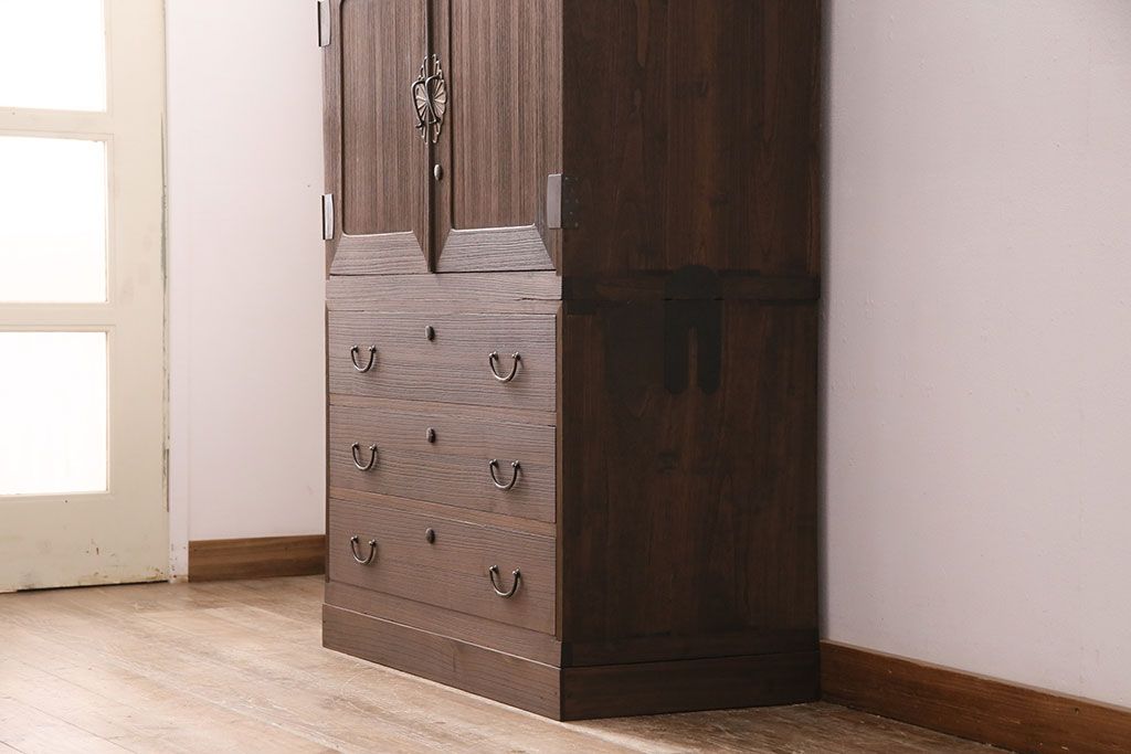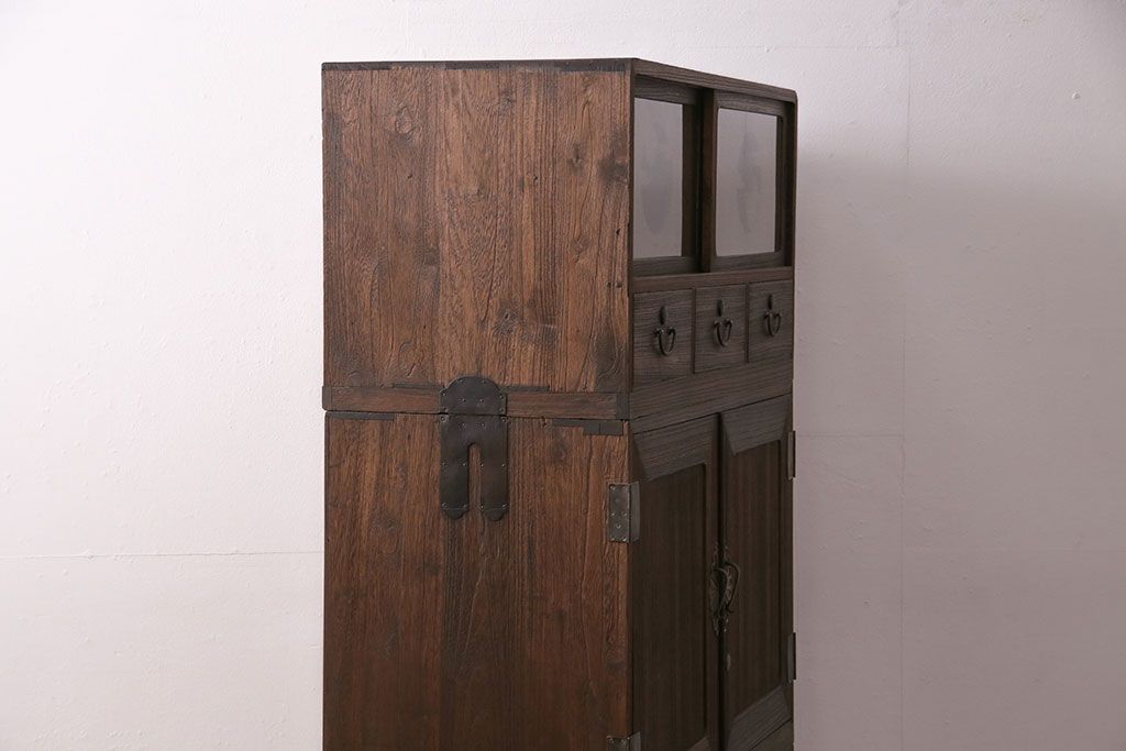 3段重ね桐箪笥をお好みのデザインにリメイク!上段の引き戸に透かし彫りとクリアガラスを追加、引手を交換。飾り棚を1枚の棚板に変更。高品質リペアを施し、着色仕上げ。