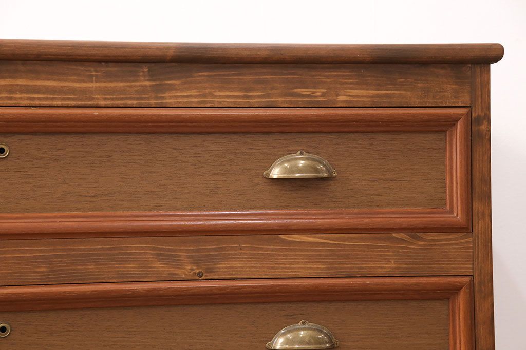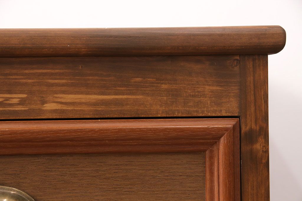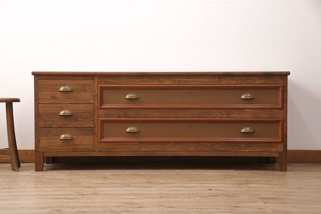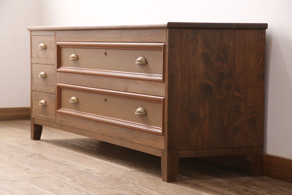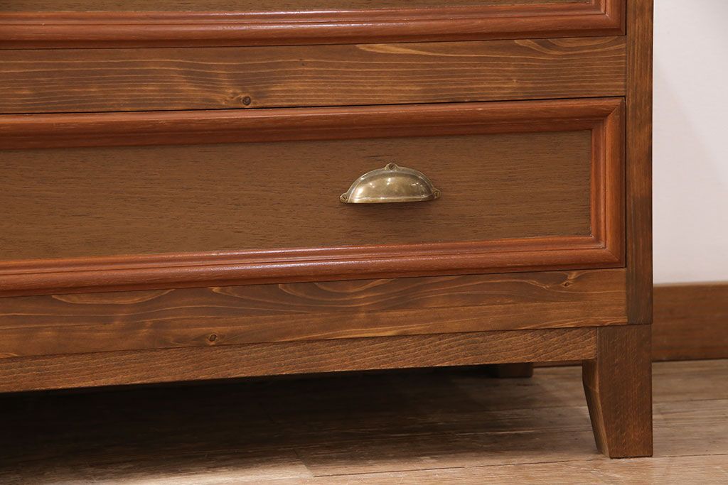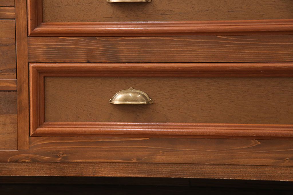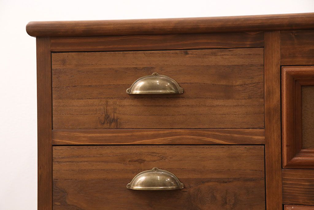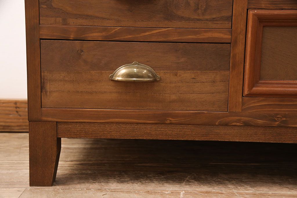 和箪笥をテレビ台にリメイク!箪笥の引き出しを利用。天板は面取りをし、引手と脚を取り付け。明るめのブラウンに着色仕上げ。