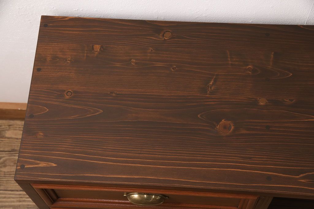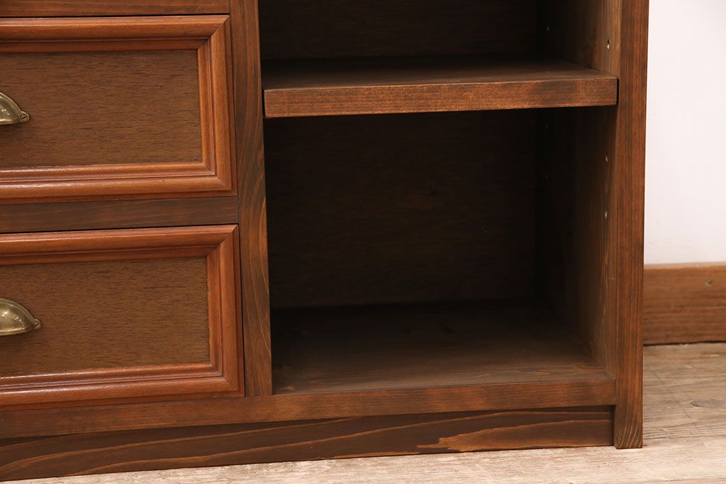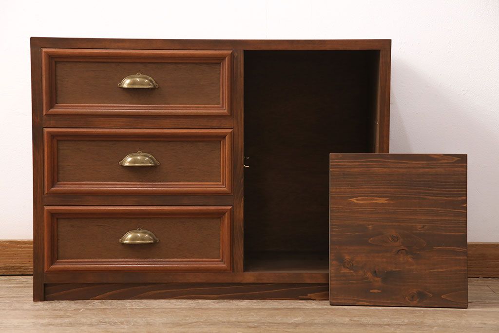 整理箪笥、洋箪笥を使ってテレビ台にリメイク!整理箪笥の右下、洋箪笥の左下の引き出しを使用。左側に引き出し3杯、右側に可動棚付きのオープンラック仕様に。引き出しに取っ手を取り付けて、オーク系に着色。