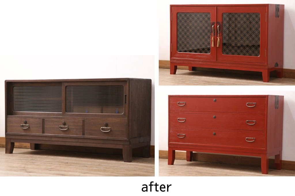 お客様持ち込みの桐箪笥を1・2・3段に分けてテレビ台とローボード2点にリメイク
