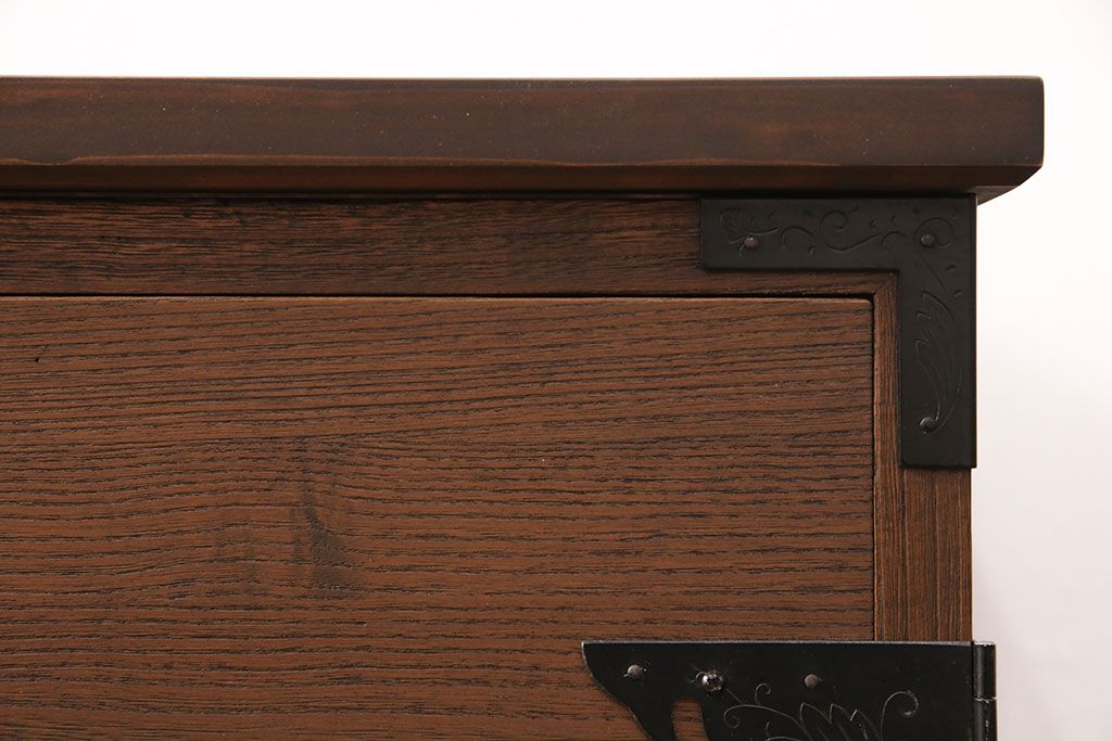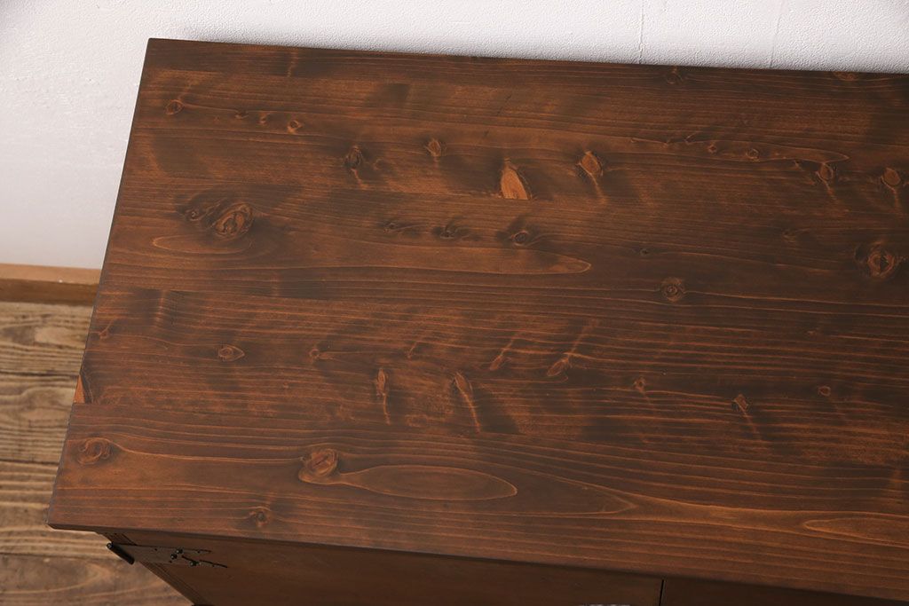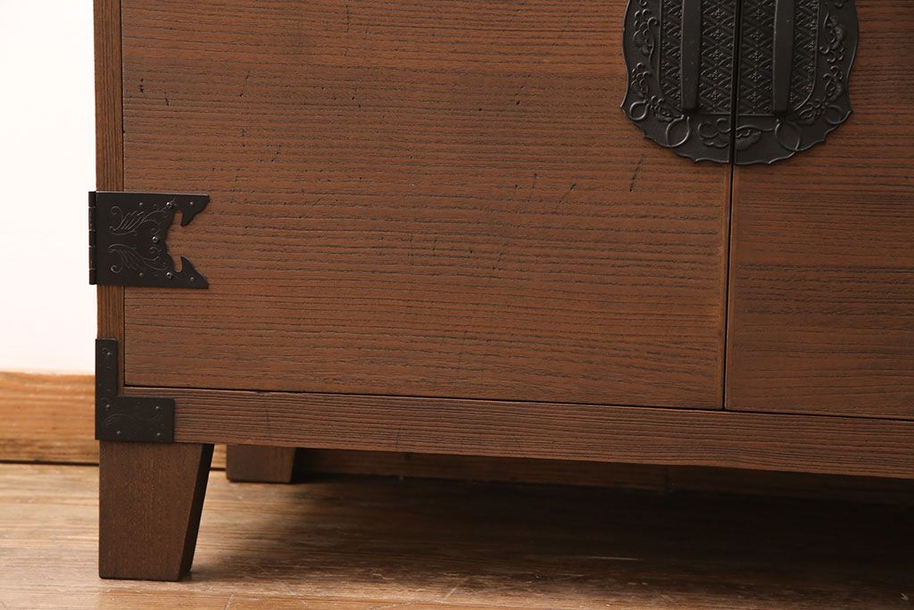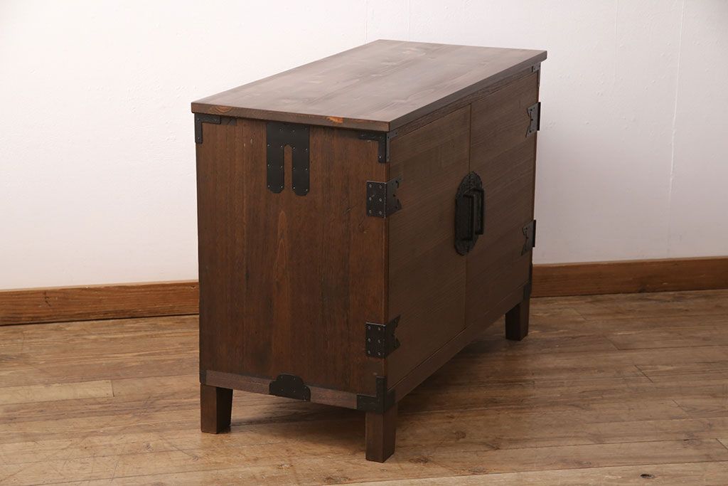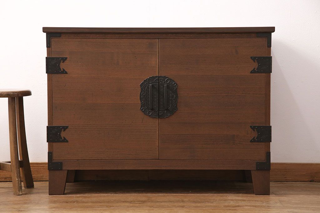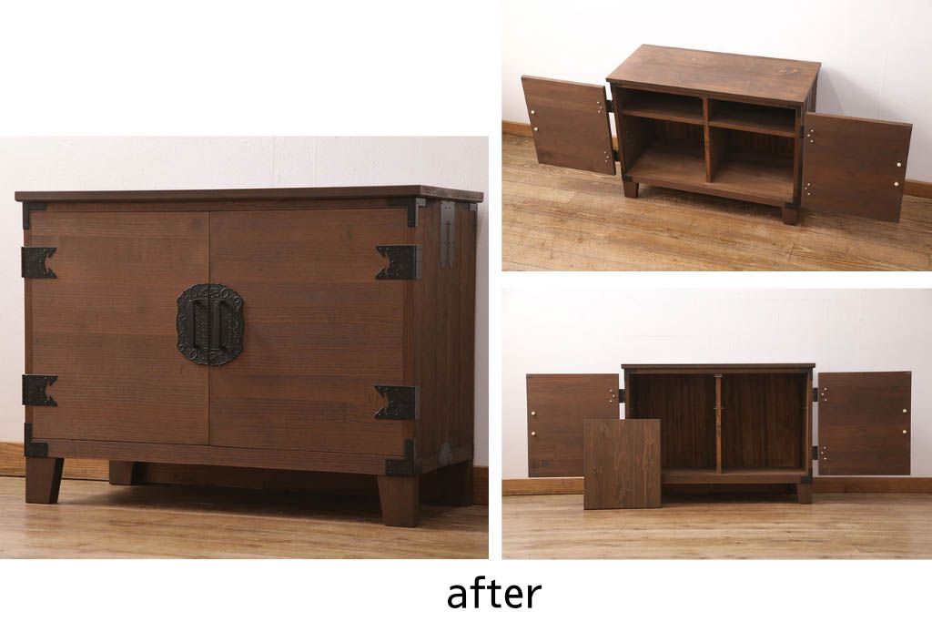 2段重ね桐箪笥の上段をローボードにリメイク!扉を左右同時に開けるように変更し、ヒノキ無垢材の天板と桐材の脚を取り付け。オーク系に着色仕上げ。
