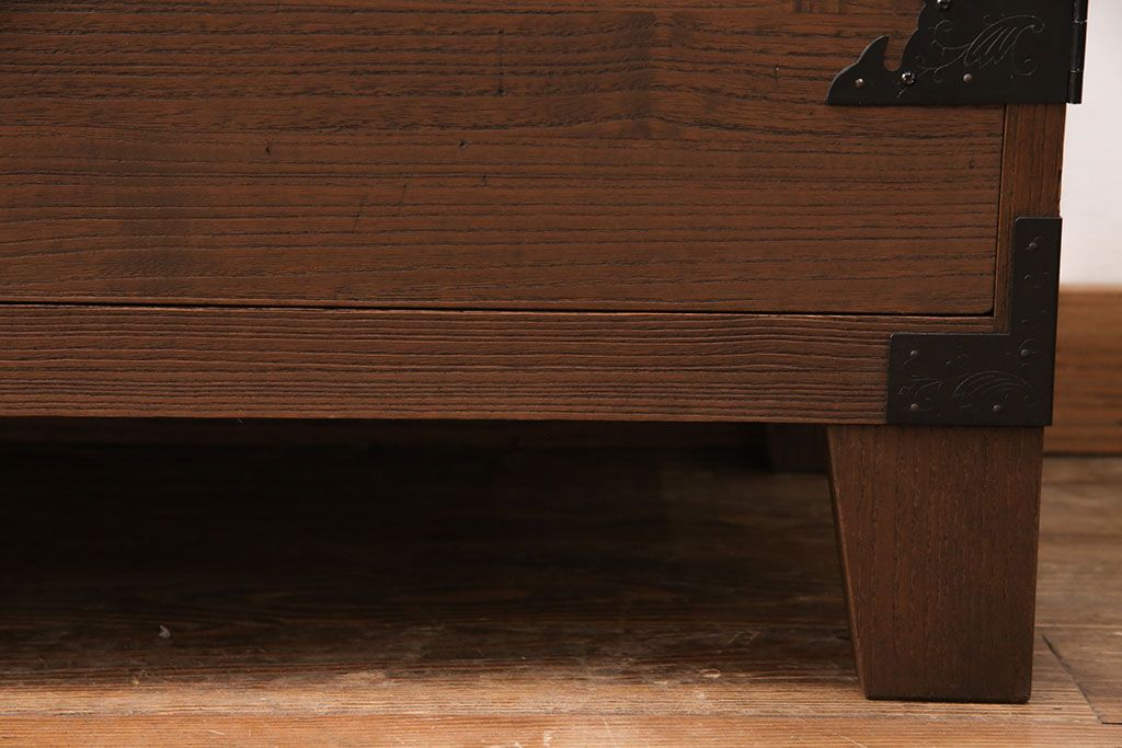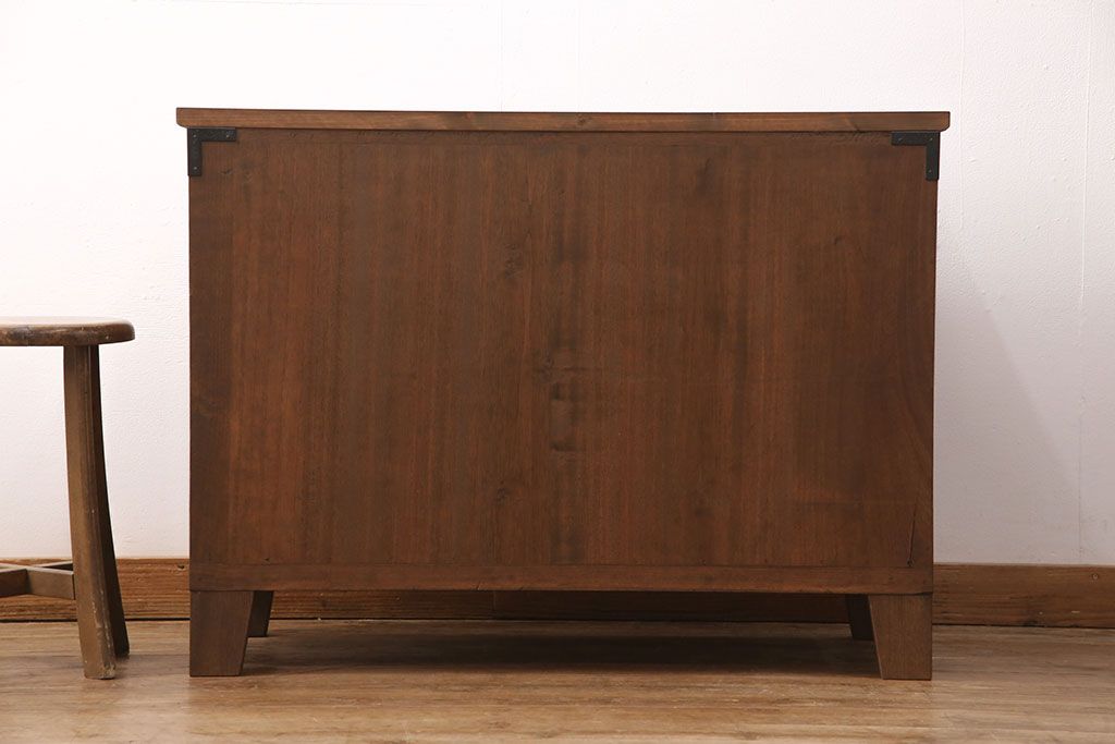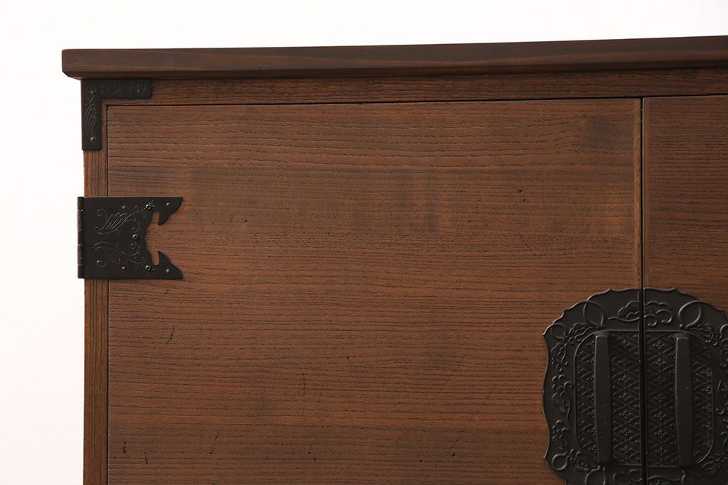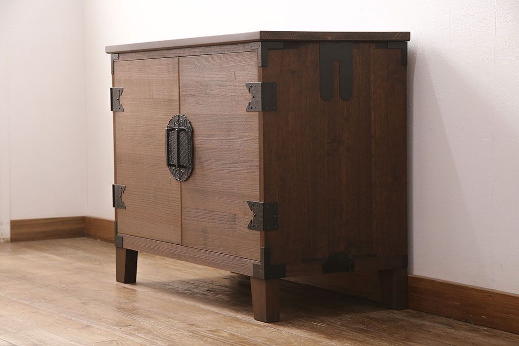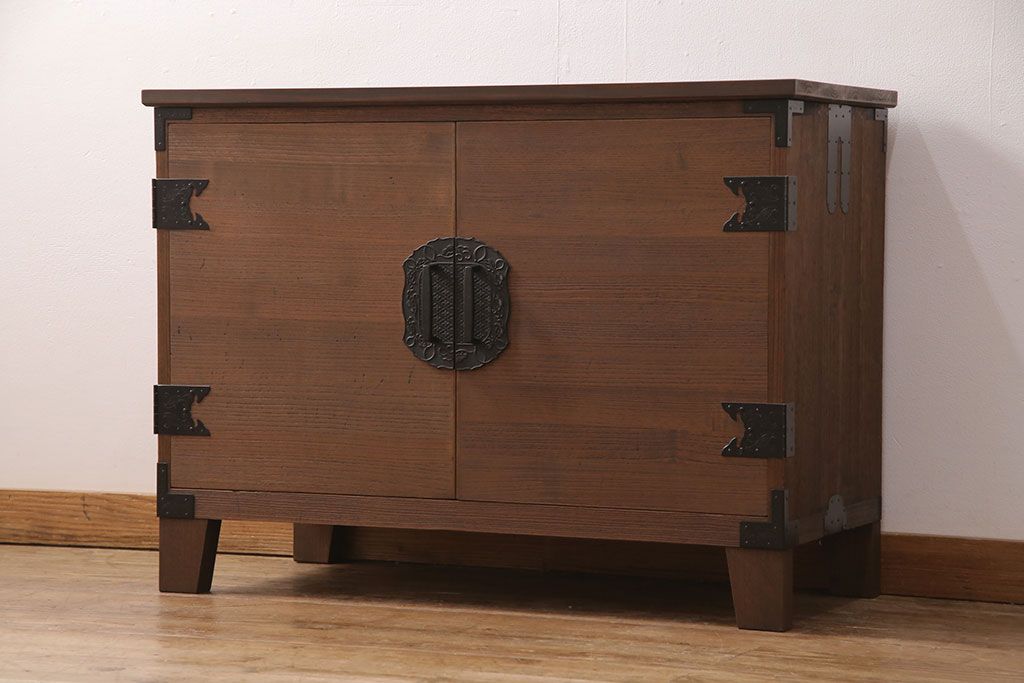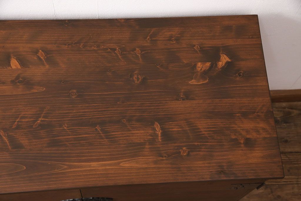 2段重ね桐箪笥の上段をローボードにリメイク!扉を左右同時に開けるように変更し、ヒノキ無垢材の天板と桐材の脚を取り付け。オーク系に着色仕上げ。