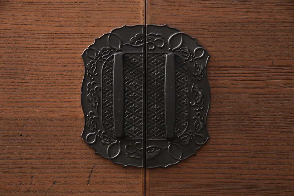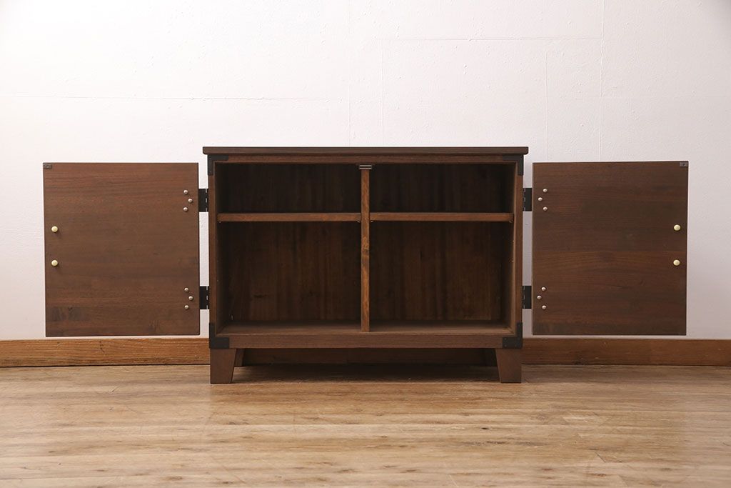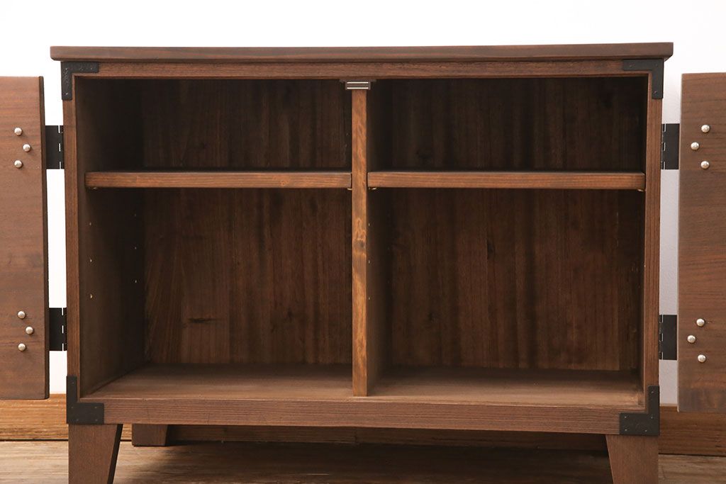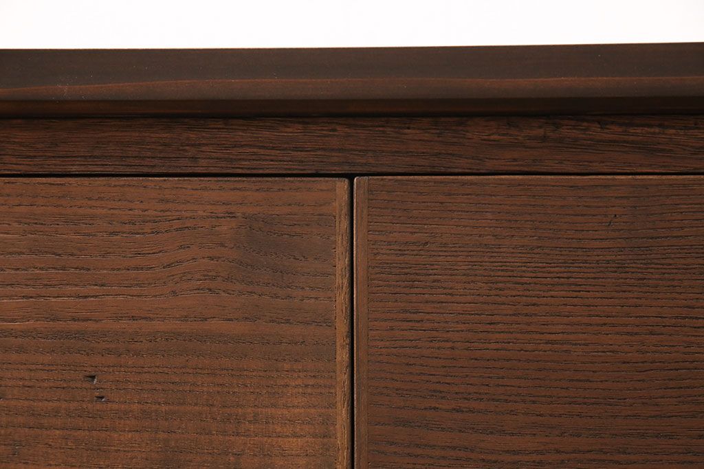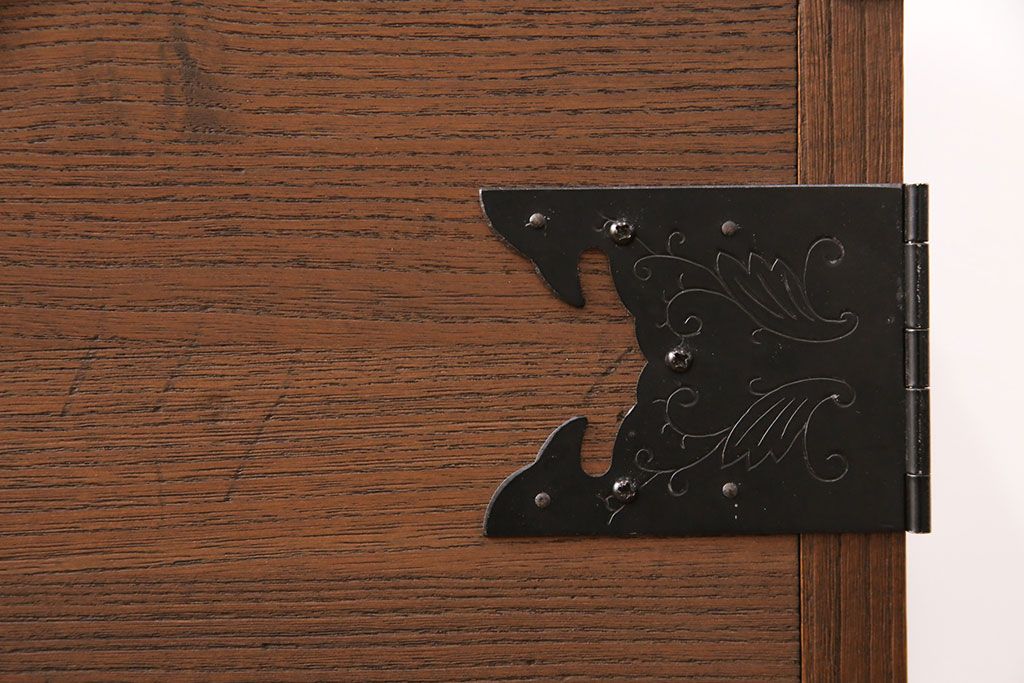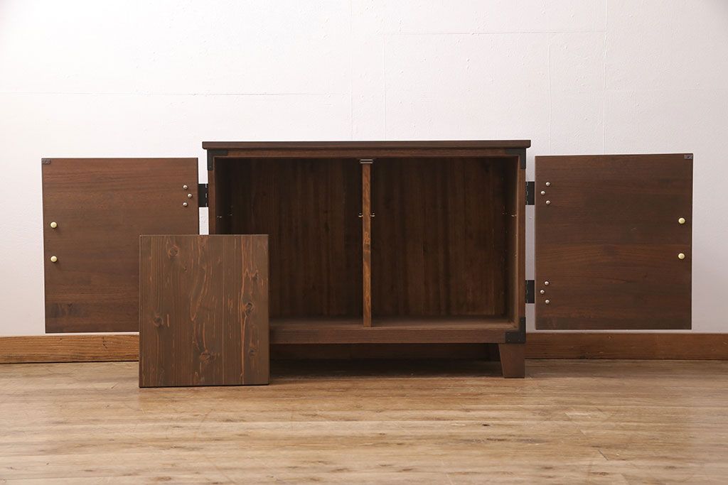 2段重ね桐箪笥の上段をローボードにリメイク!扉を左右同時に開けるように変更し、ヒノキ無垢材の天板と桐材の脚を取り付け。オーク系に着色仕上げ。