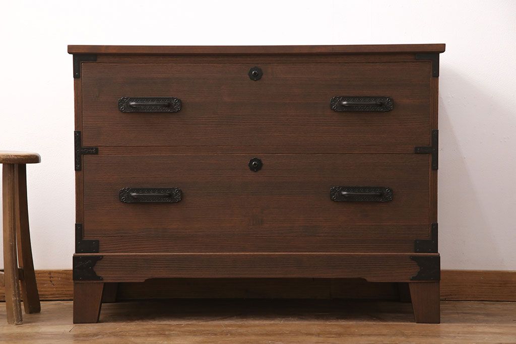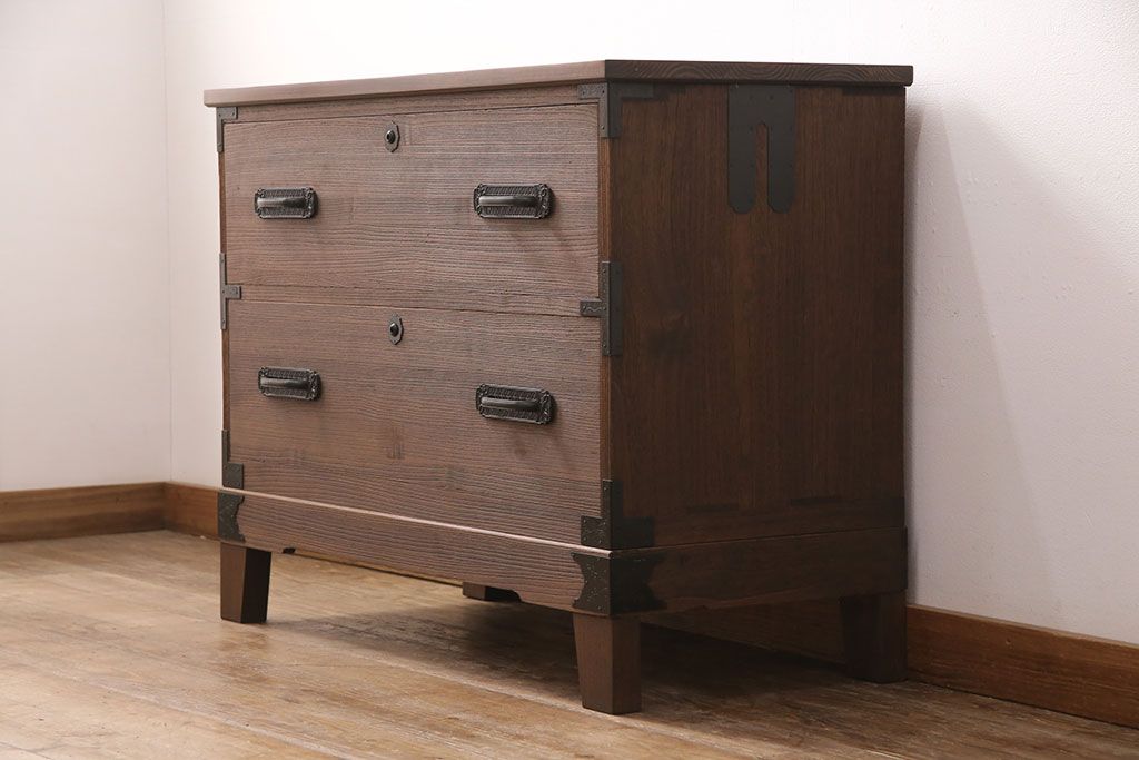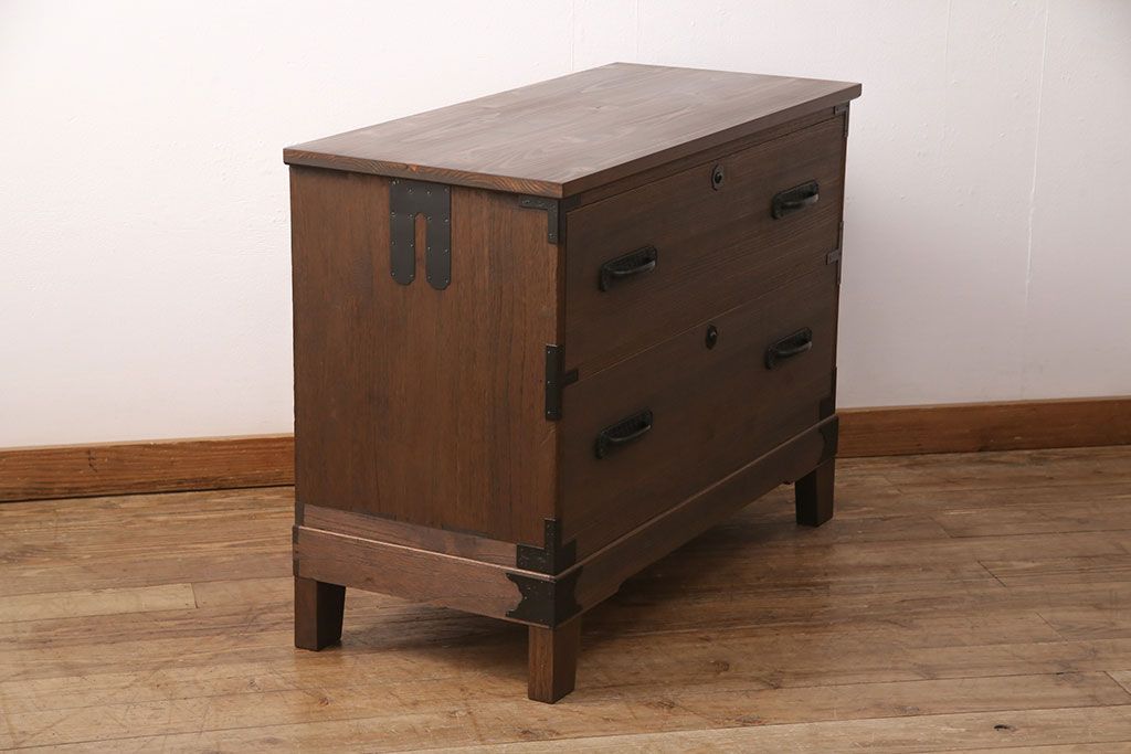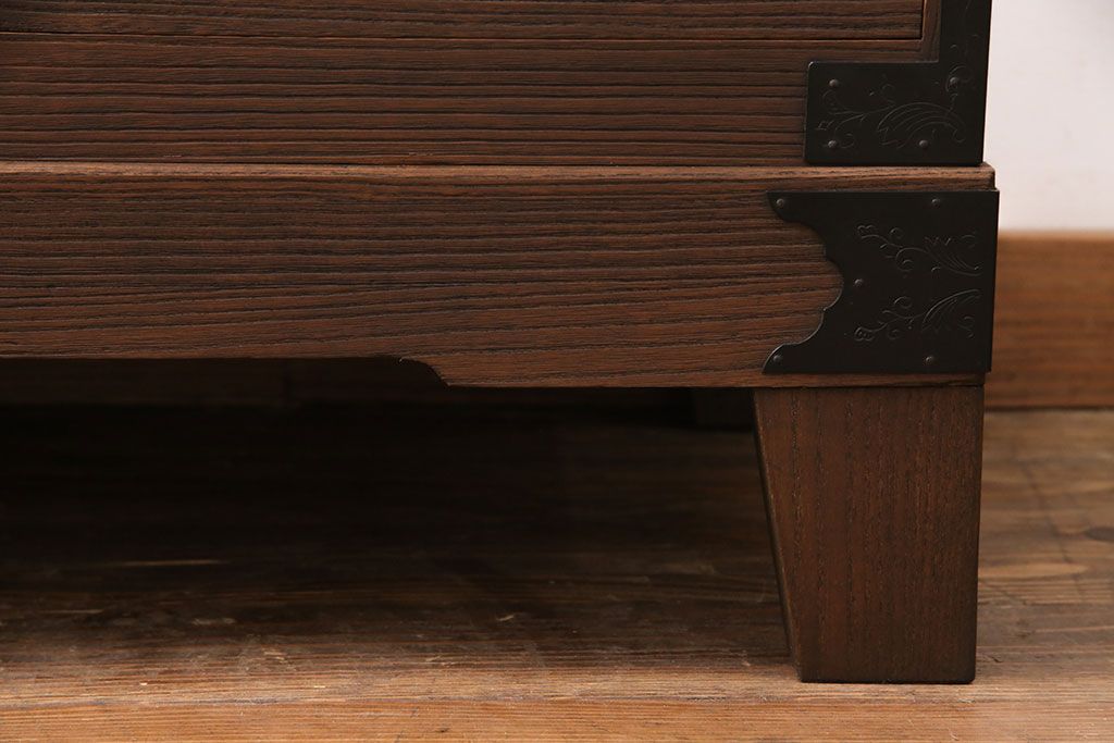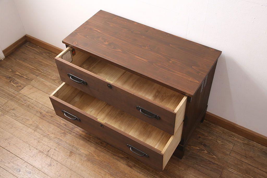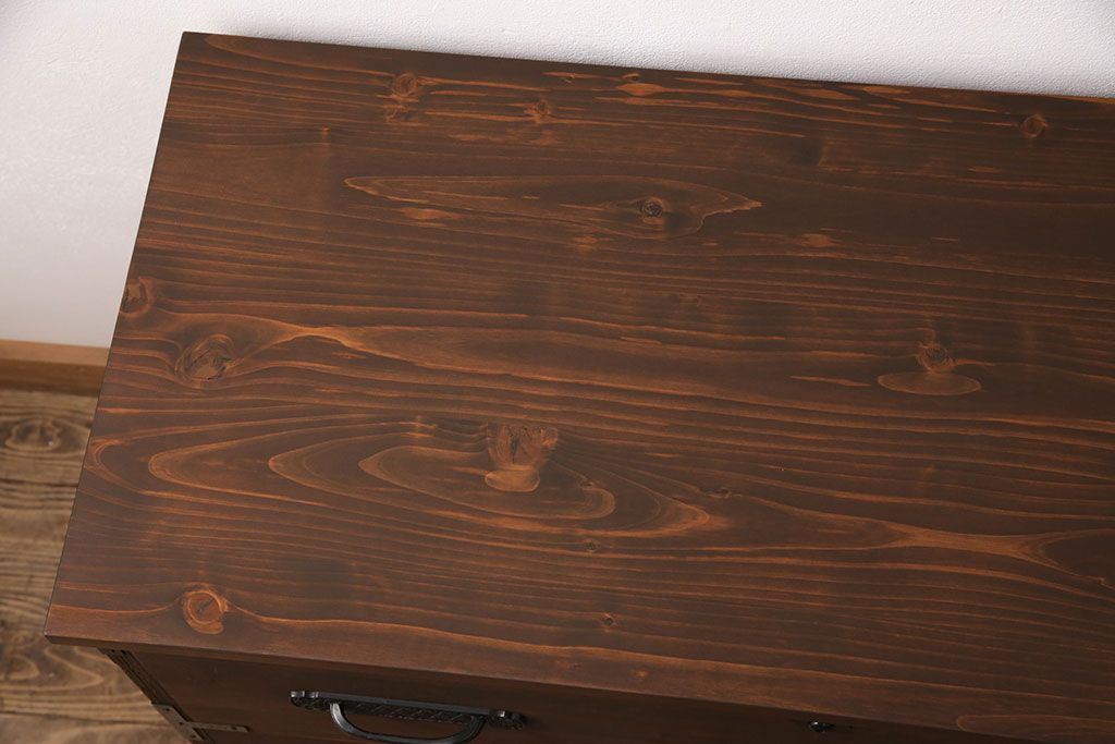 2段重ね桐箪笥の下段をローボードにリメイク!ヒノキ無垢材の天板と、桐材の脚を取り付け。オーク系に着色仕上げ。