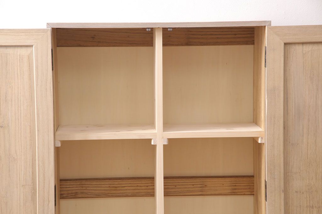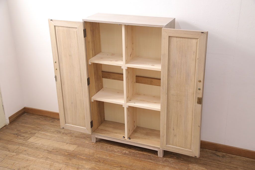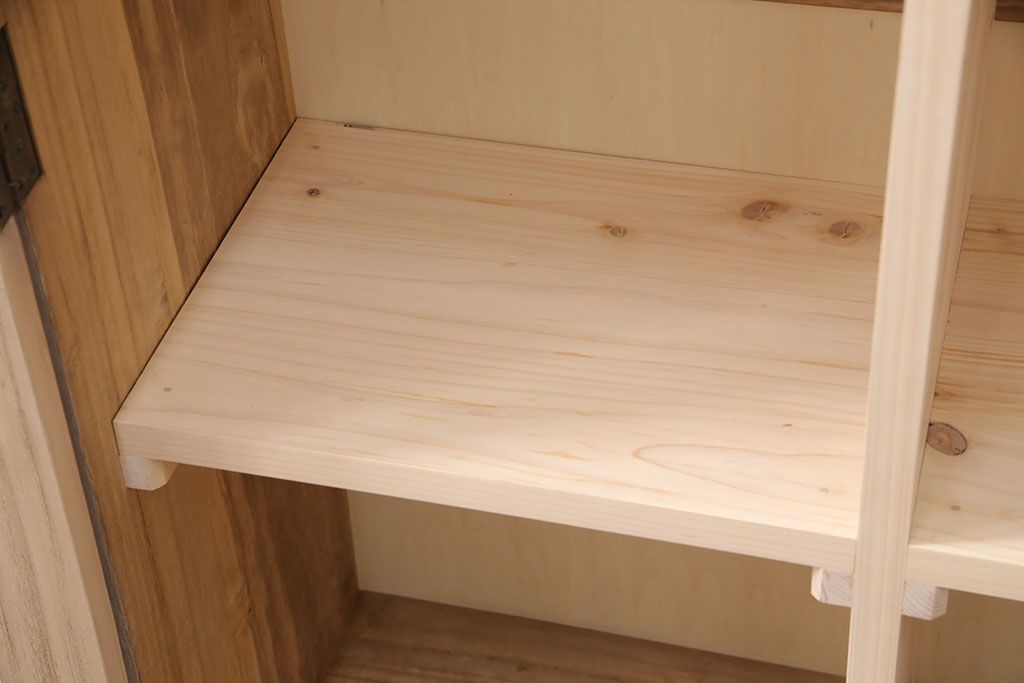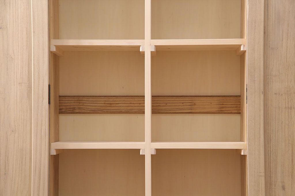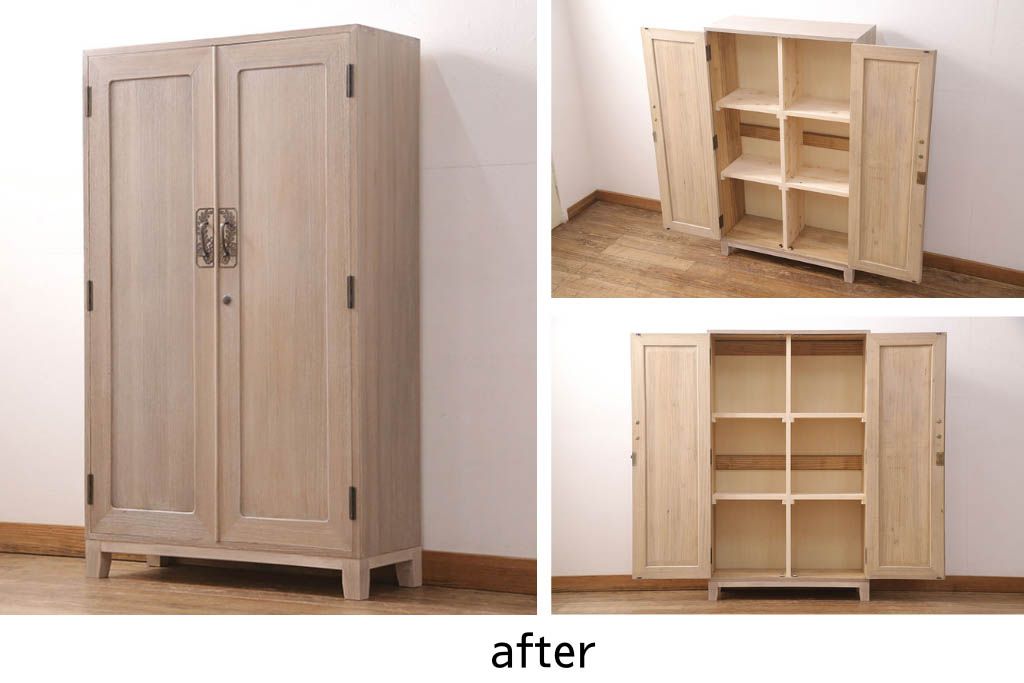 桐箪笥を収納棚にリメイク!扉の鏡とネクタイ収納を取り外し、内部中央に仕切りを入れて6枚の棚を設置。脚を取り付けて、木地色仕上げに。