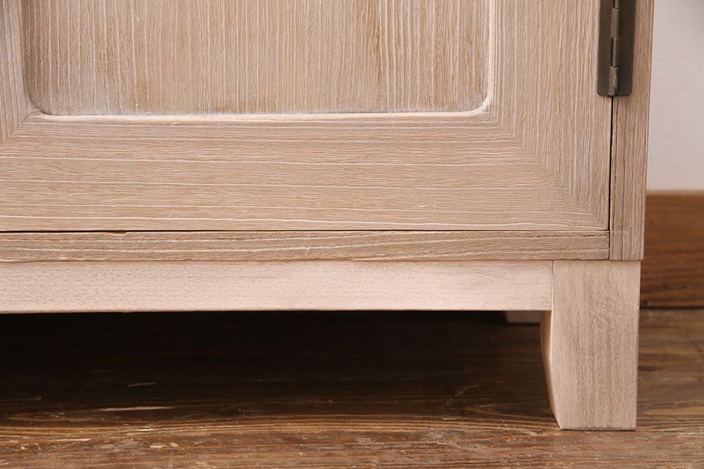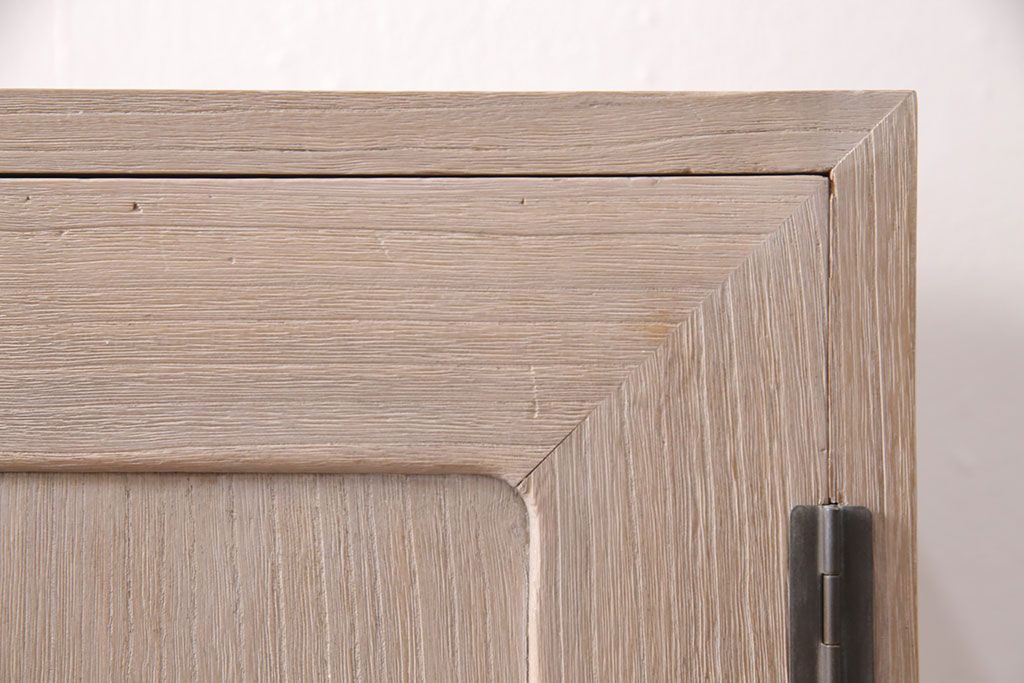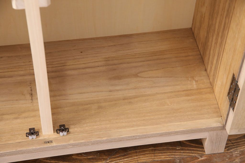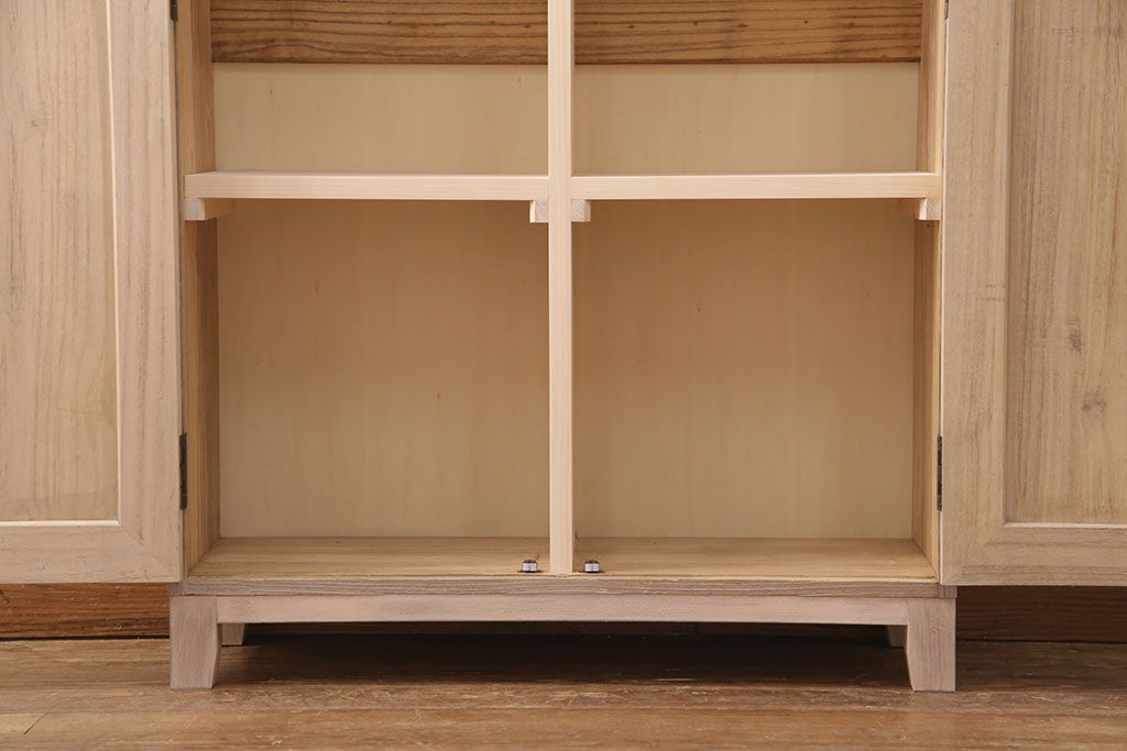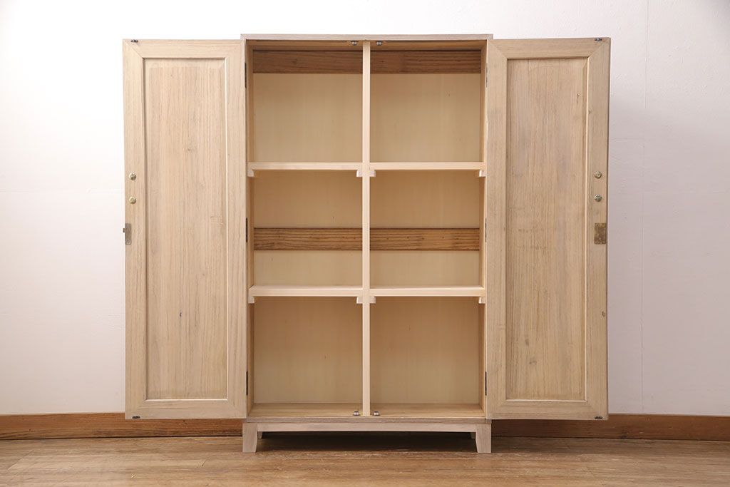 桐箪笥を収納棚にリメイク!扉の鏡とネクタイ収納を取り外し、内部中央に仕切りを入れて6枚の棚を設置。脚を取り付けて、木地色仕上げに。