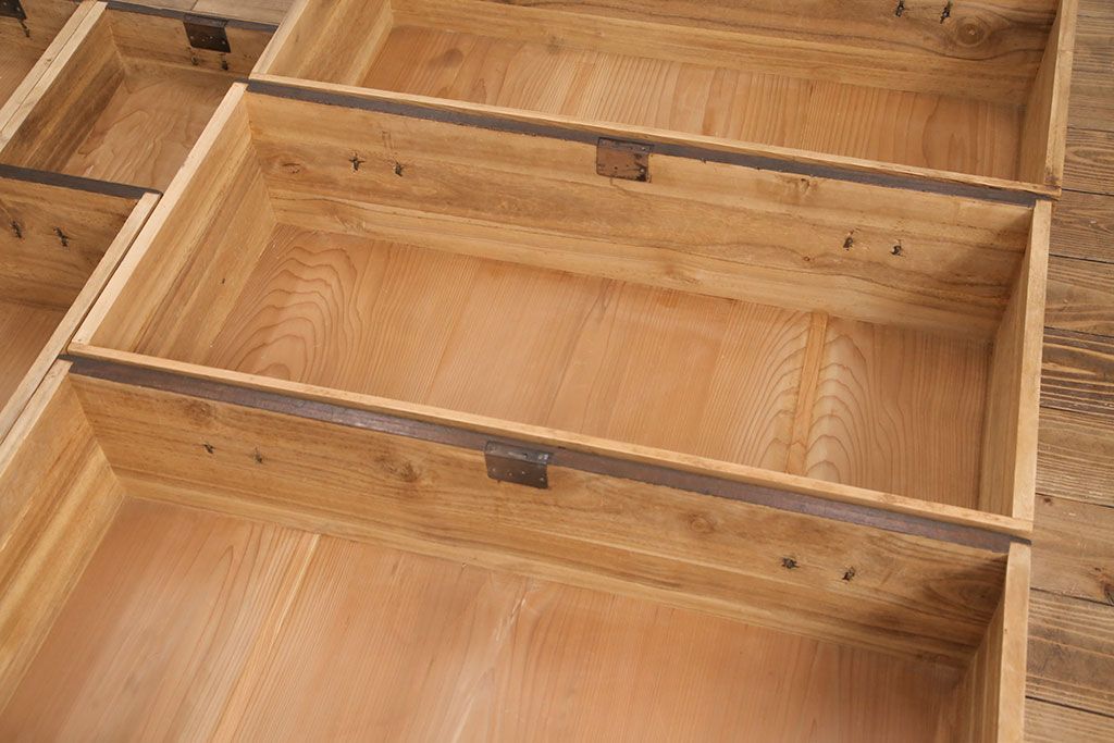 ◆引き出し前板(虫食い跡が目立つ1杯):専用のパテで穴埋めを行い、着色で馴染ませる仕上げ
