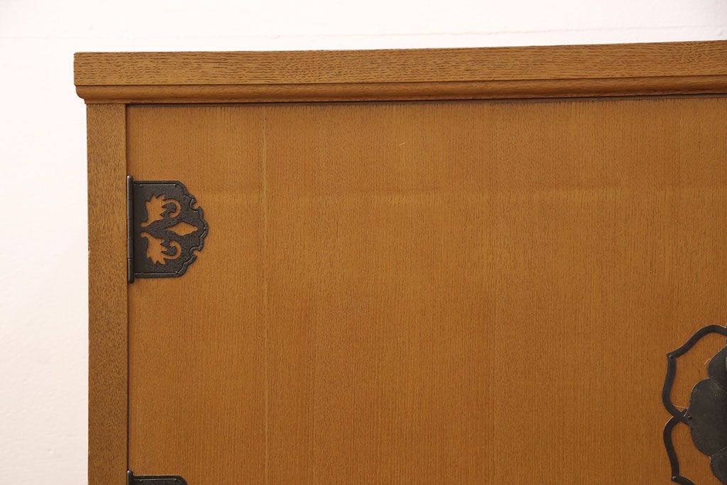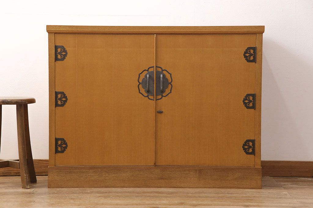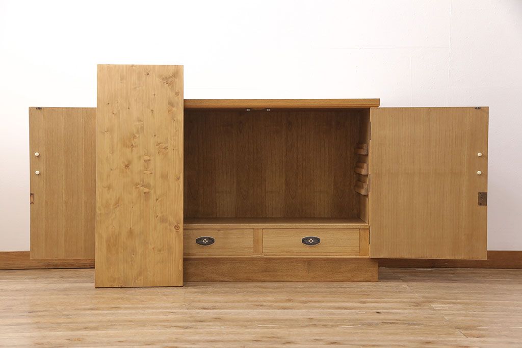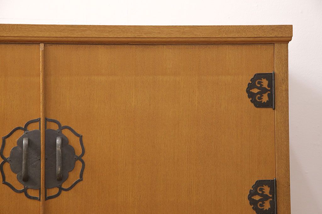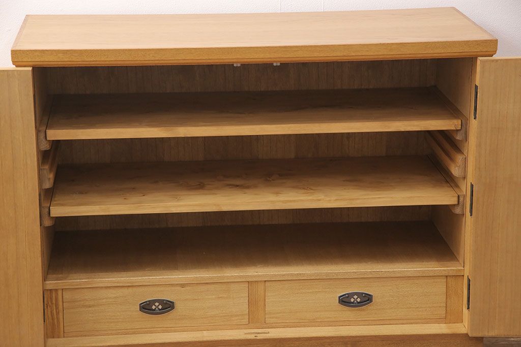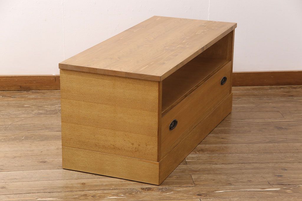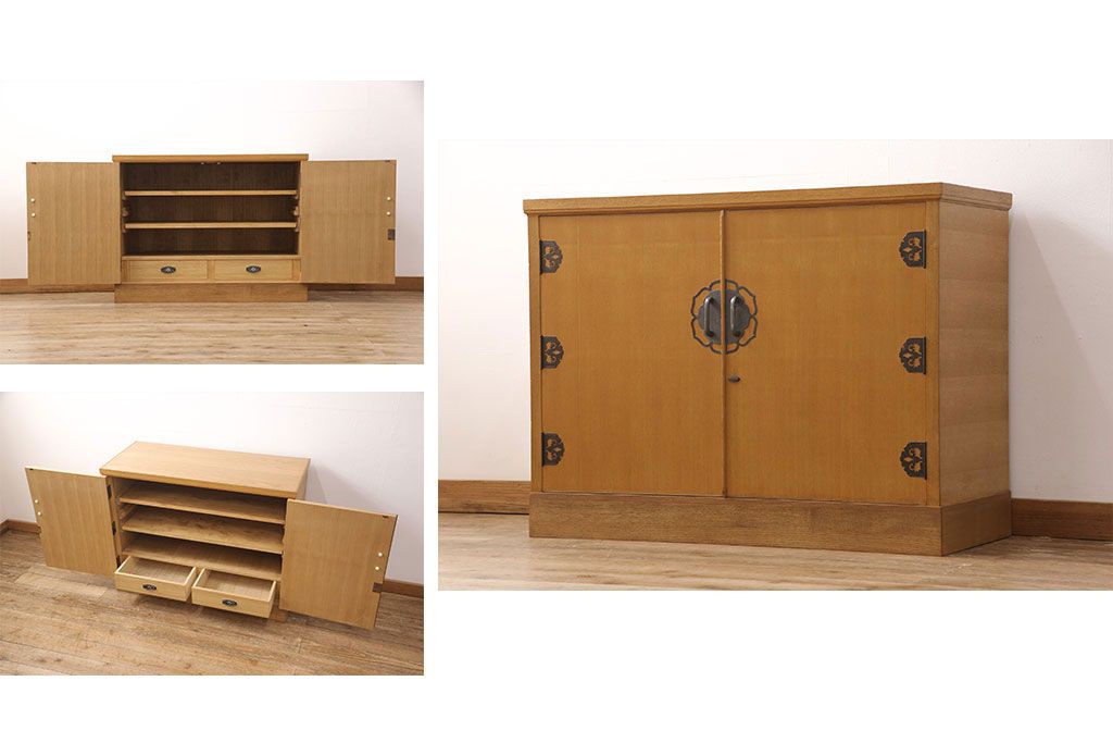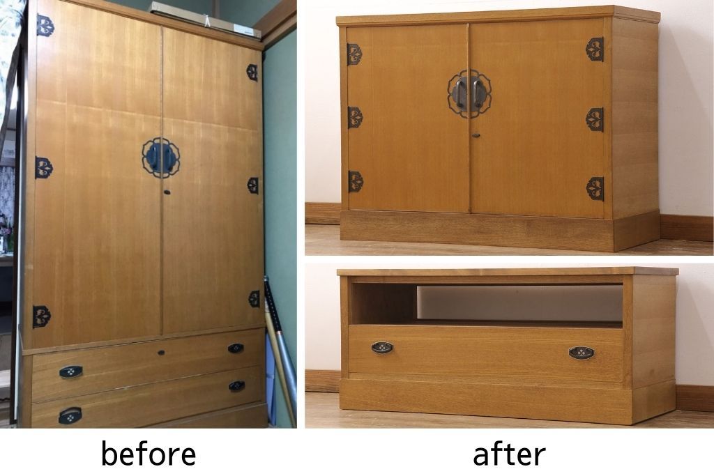 ラフジュ工房> お手持ちの家具・建具リメイク実績> 婚礼家具リメイク実績 > 和箪笥をキャビネットとテレビボードにリメイク!上段は高さを低くリサイズ。内部を取り外し、棚板を設置。台輪を取り付けてキャビネットに。下段の引き出しは、1段目の引き出しを撤去し、オープン仕様に。天板を取り付けてテレビボードに加工。