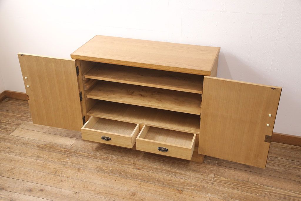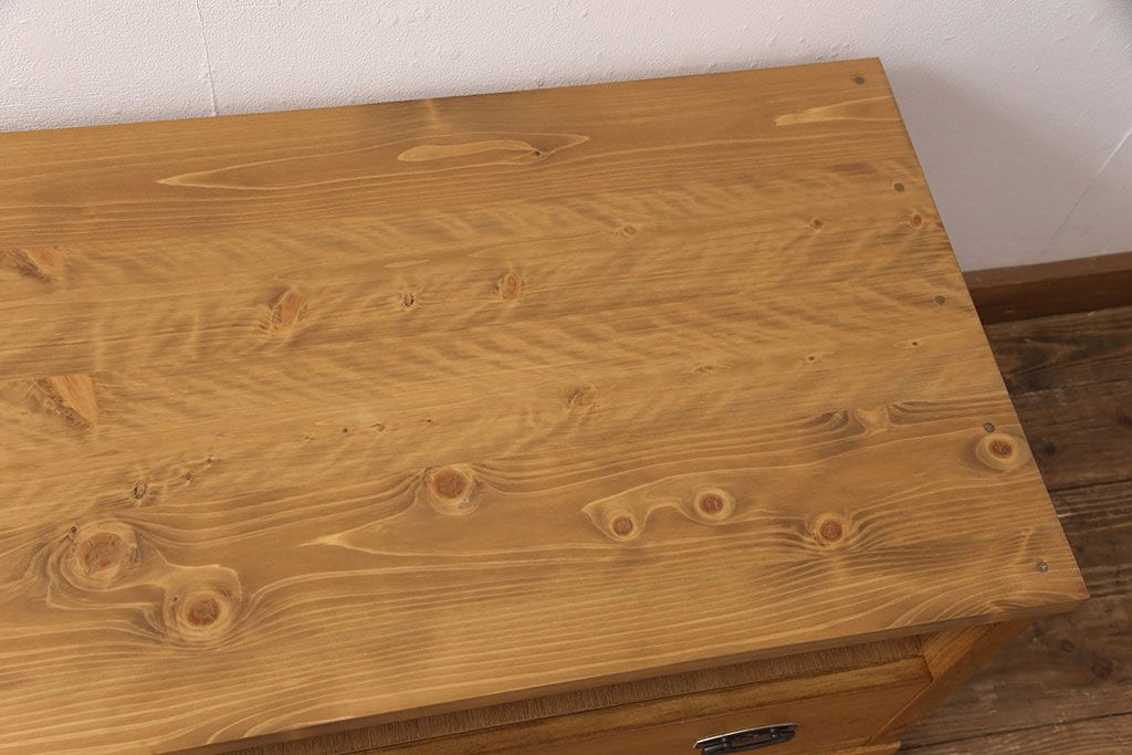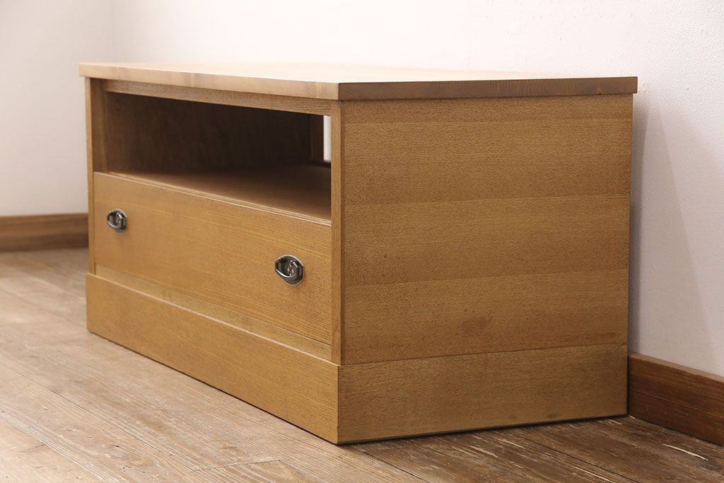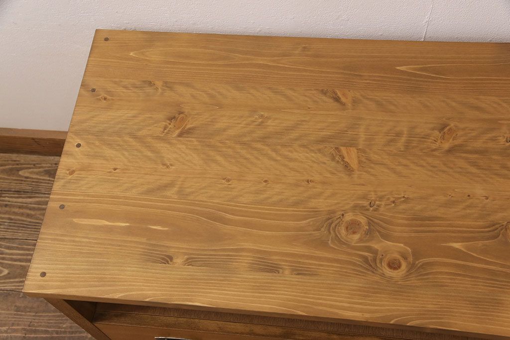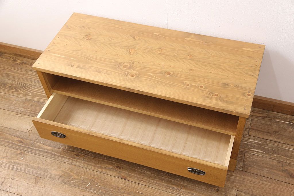 和箪笥をキャビネットとテレビボードにリメイク!上段は高さを低くリサイズ。内部を取り外し、棚板を設置。台輪を取り付けてキャビネットに。下段の引き出しは、1段目の引き出しを撤去し、オープン仕様に。天板を取り付けてテレビボードに加工。