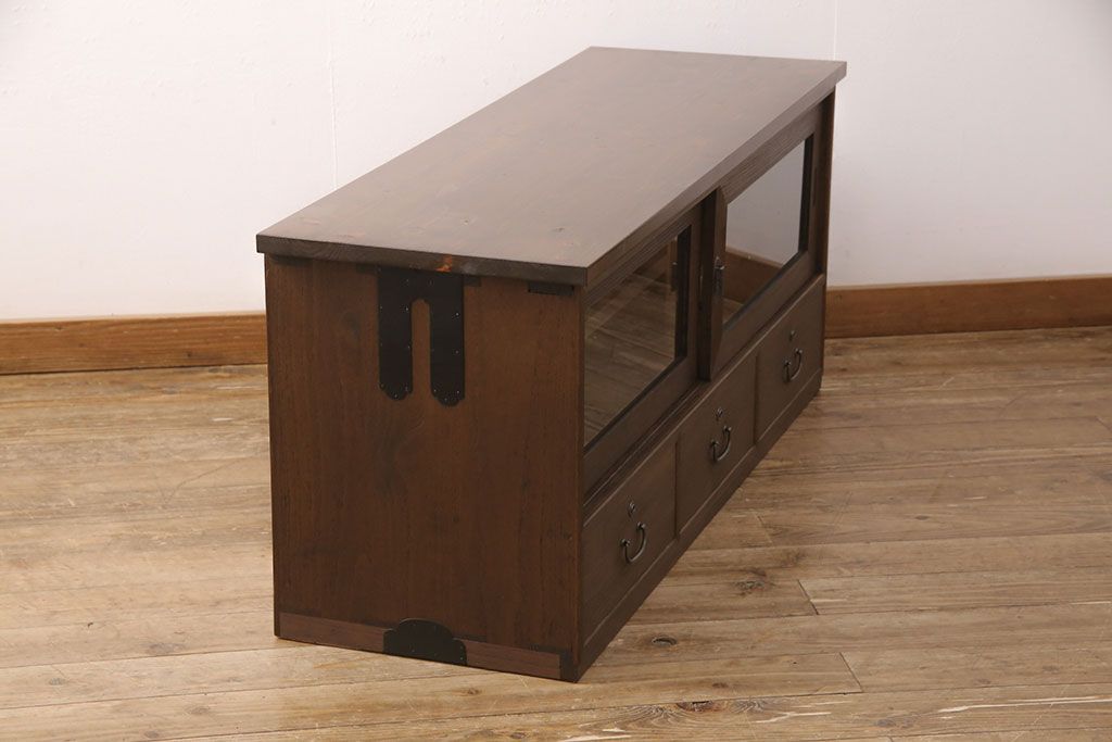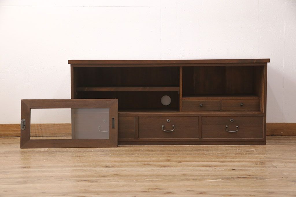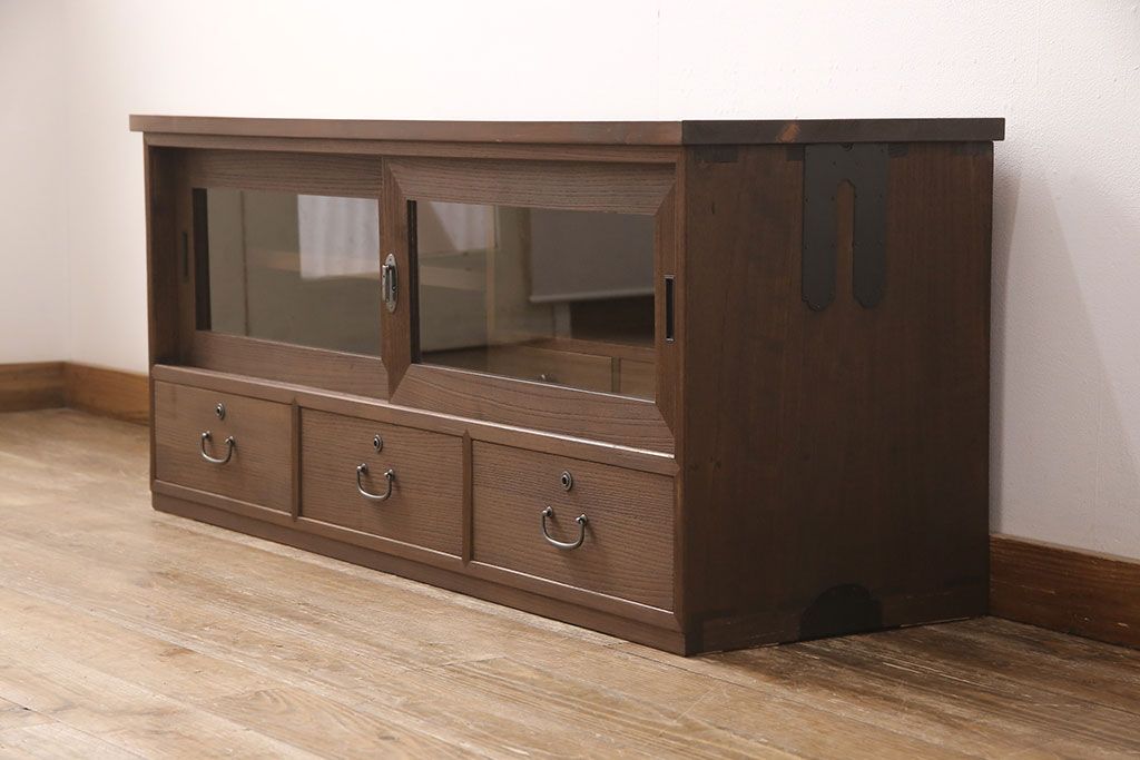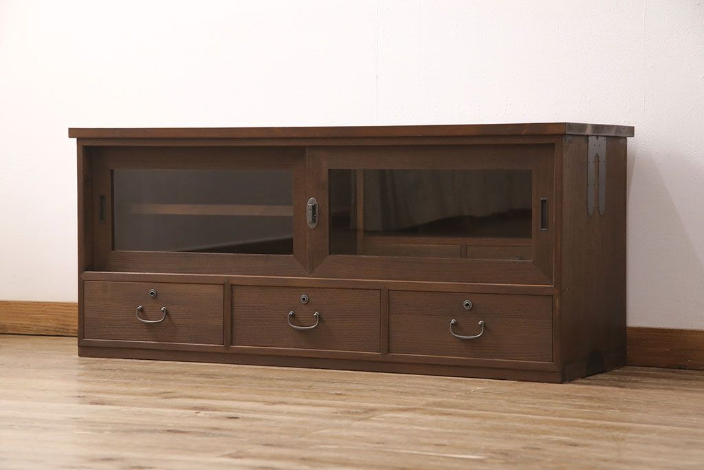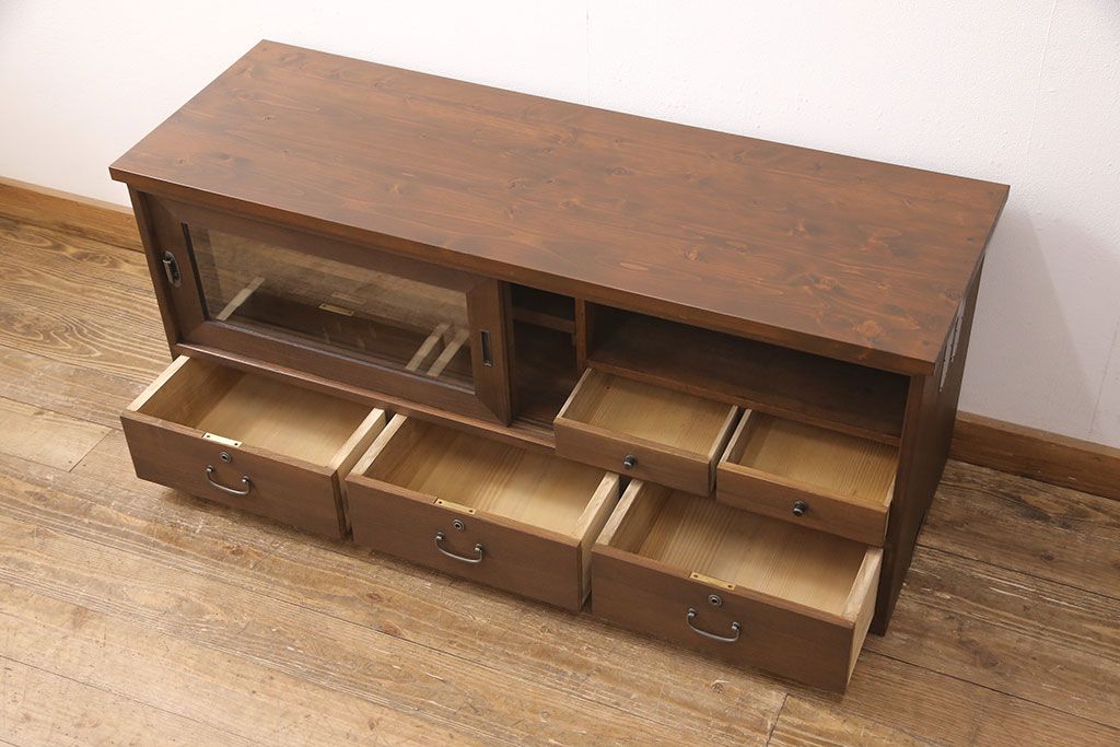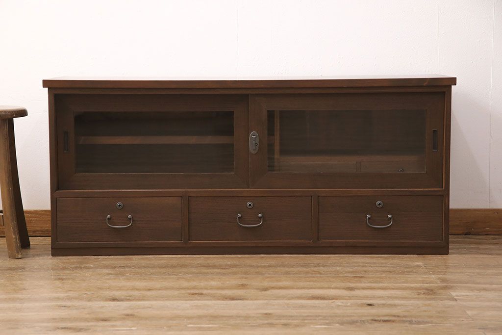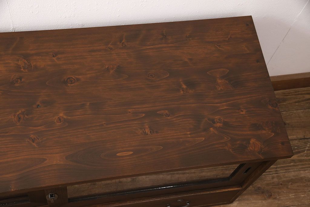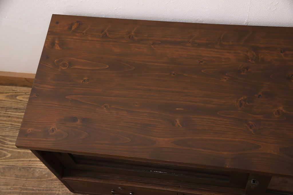 重ね桐箪笥の上段をローボードにリメイク!引き戸にはクリアガラスをはめ込み、引手を交換。内部の左側に棚板を製作。ヒノキ材で天板を取り付け、オーク系に着色仕上げ。