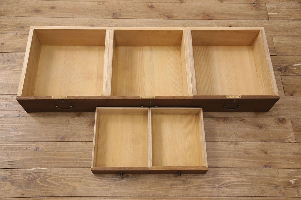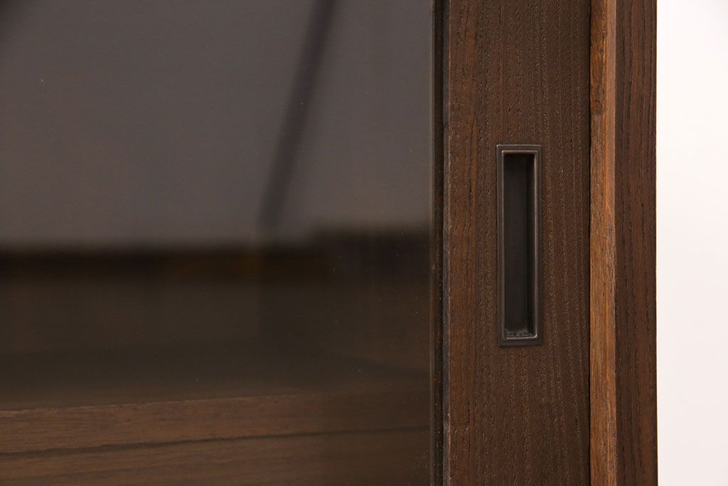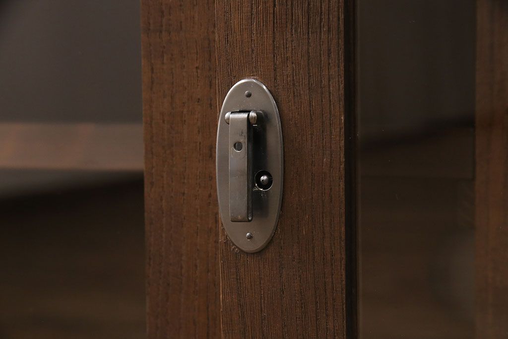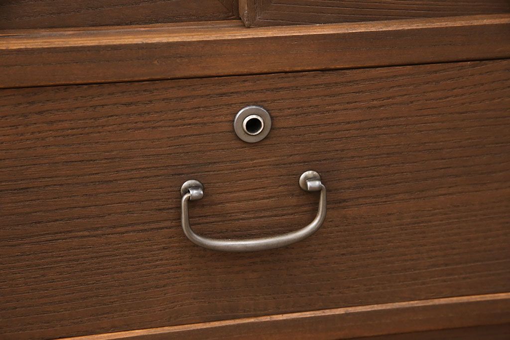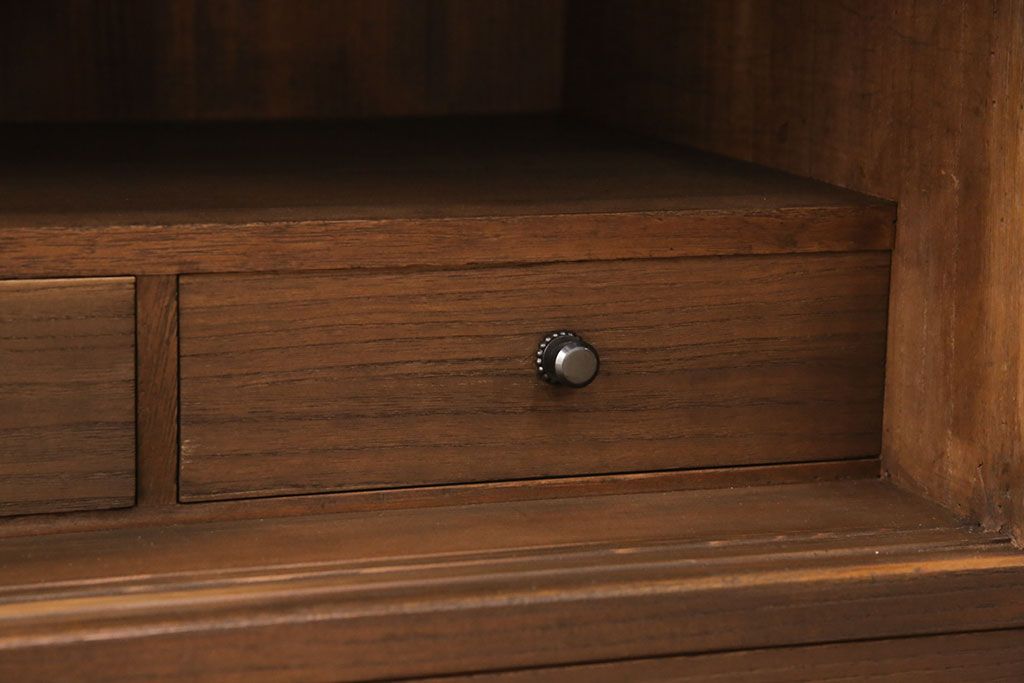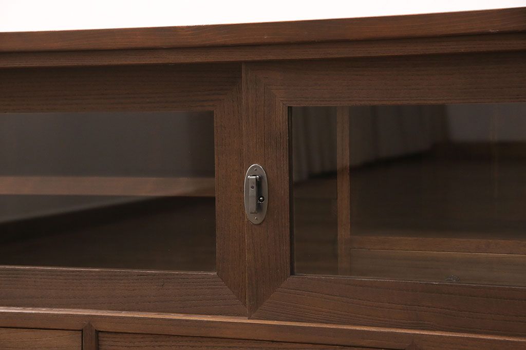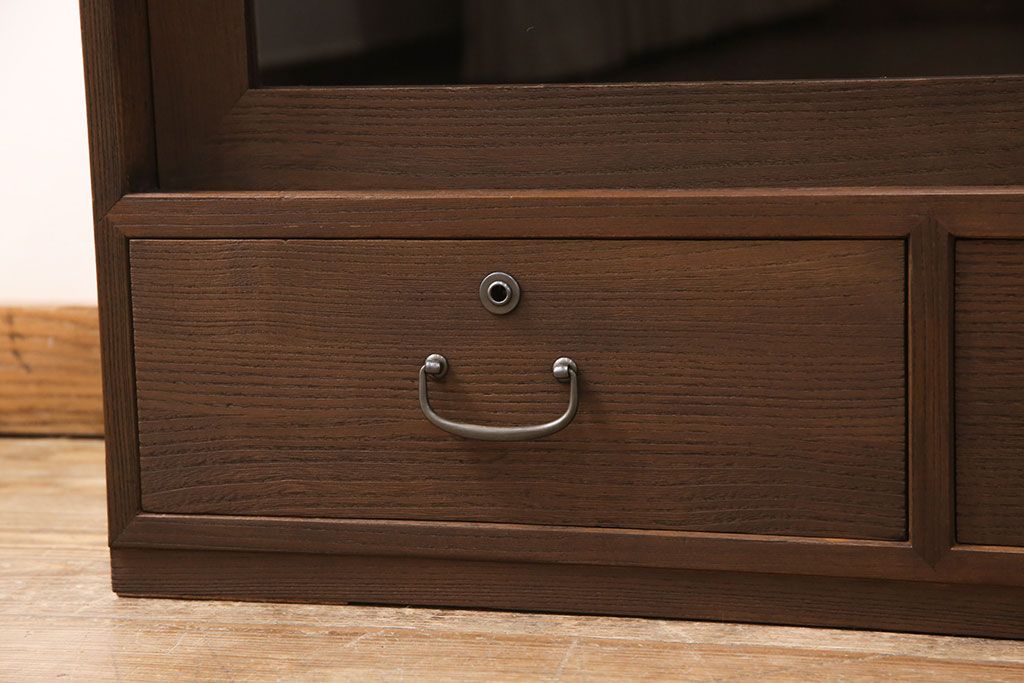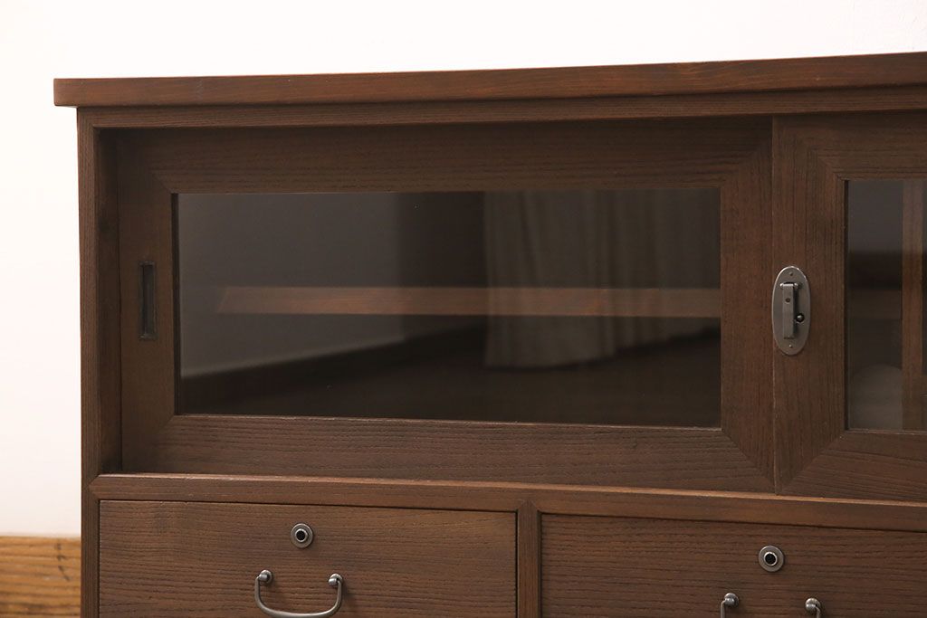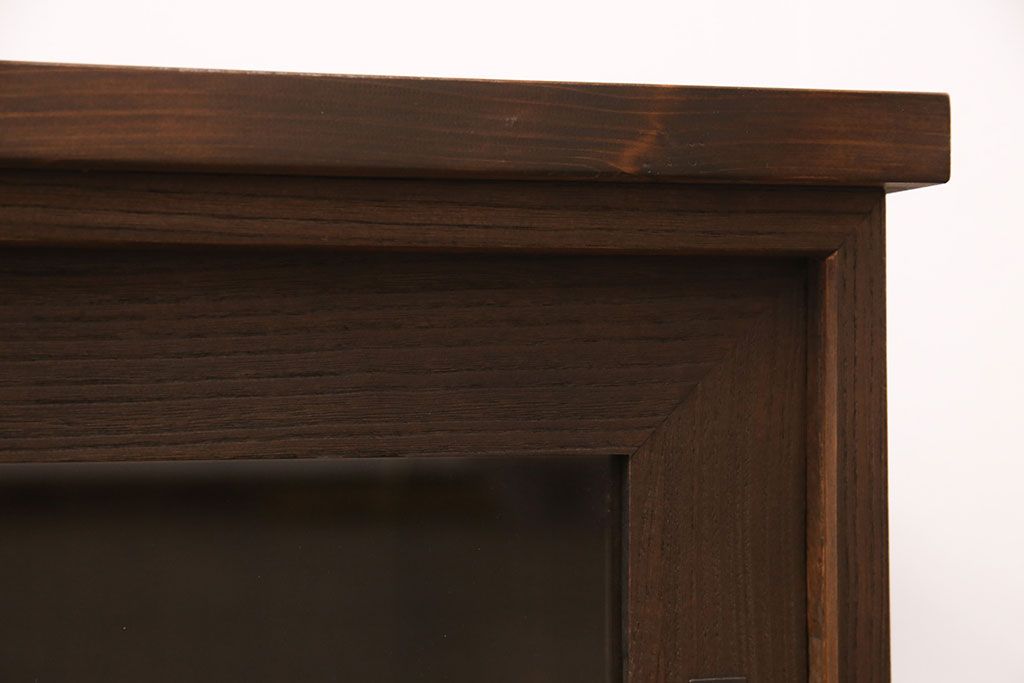 重ね桐箪笥の上段をローボードにリメイク!引き戸にはクリアガラスをはめ込み、引手を交換。内部の左側に棚板を製作。ヒノキ材で天板を取り付け、オーク系に着色仕上げ。