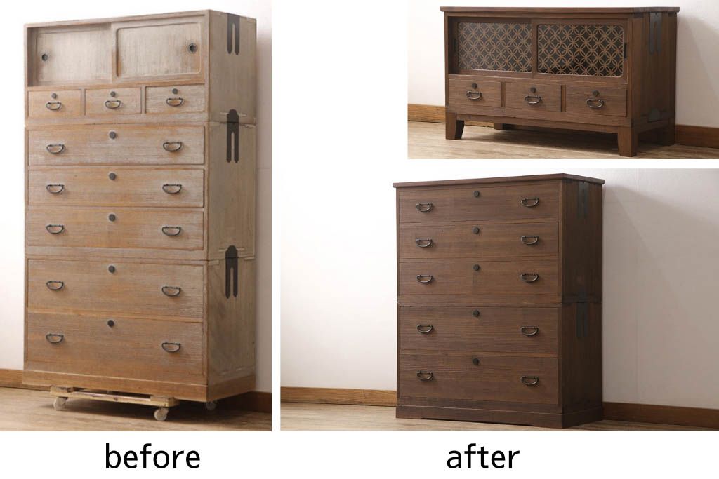 お客様持ち込みの桐箪笥を上段はローボードに、中段・下段はチェストにリメイク