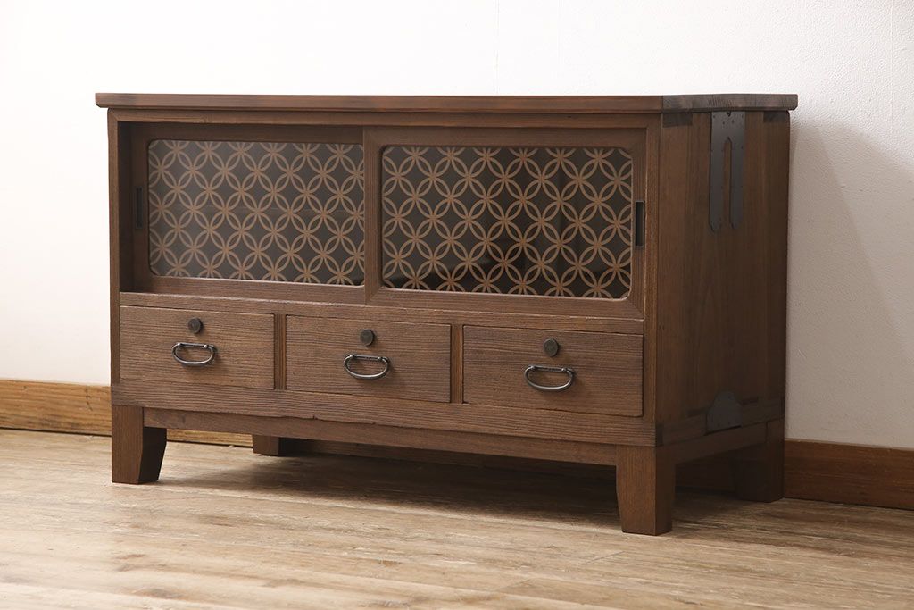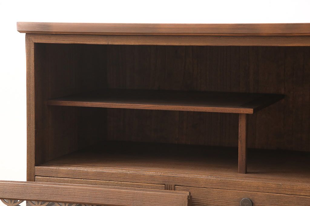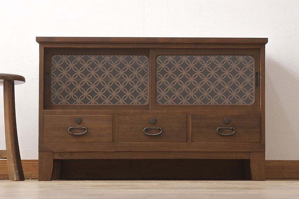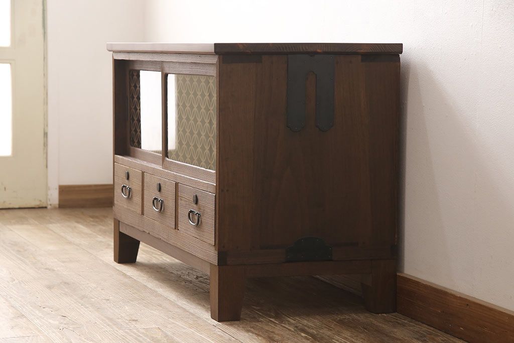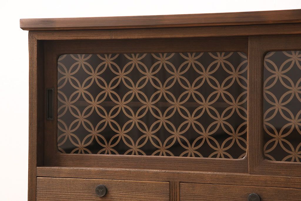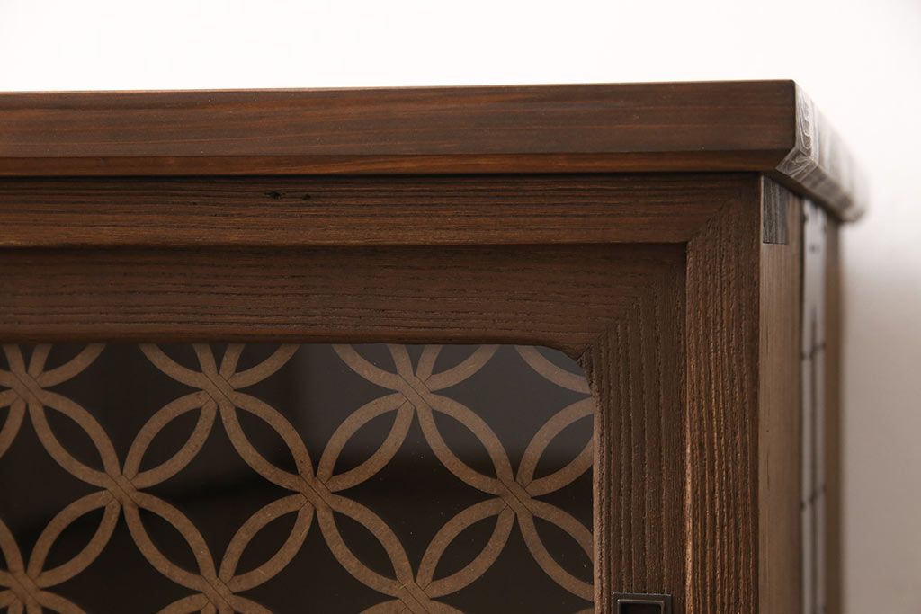 3段重ね桐箪笥をローボードとチェストにリメイク!上段は引き戸に組子ガラスをはめ込み、木製脚を取り付け。中段・下段は合わせてチェストに。いずれも天板を取り付けてオーク系着色仕上げ。