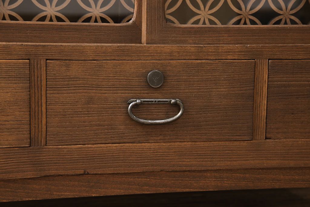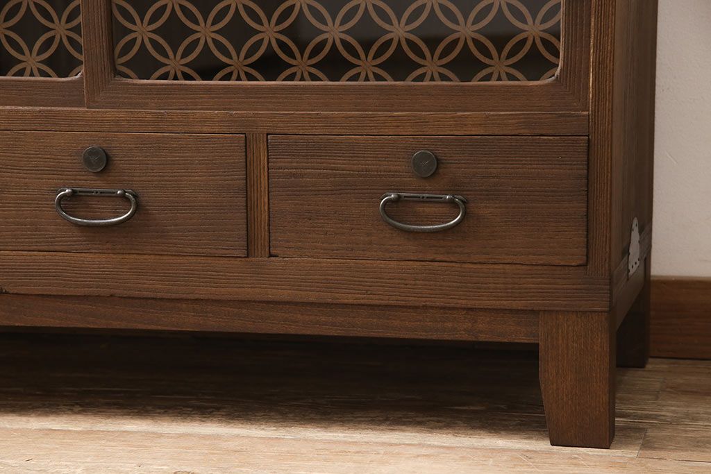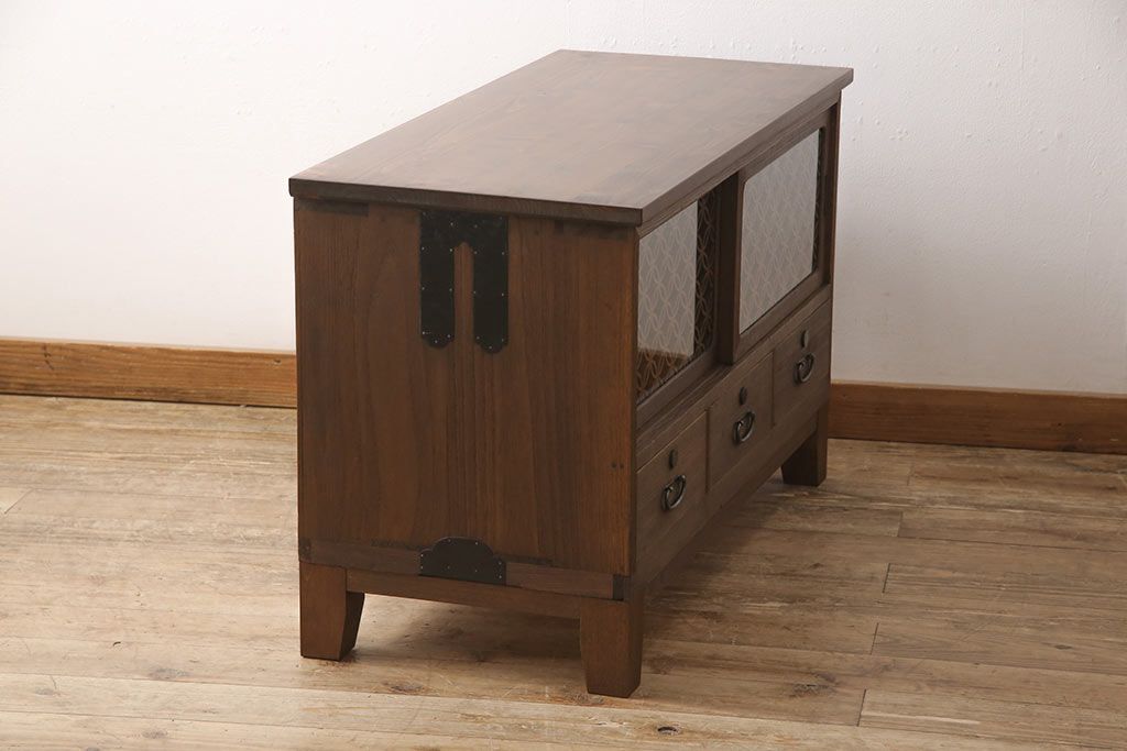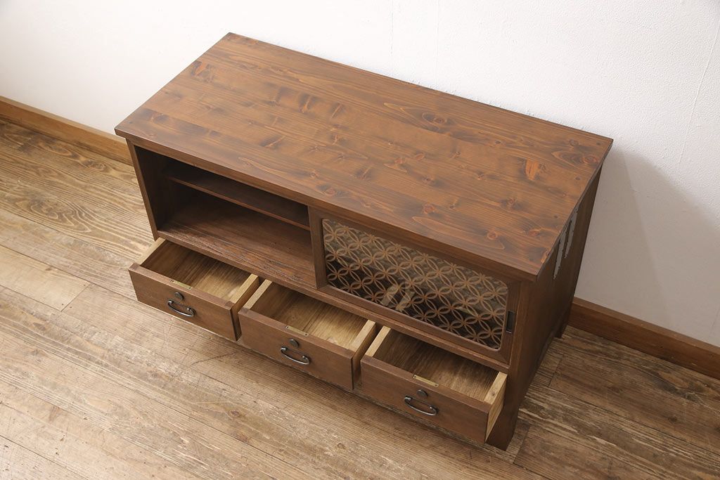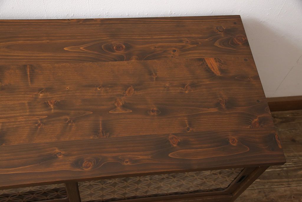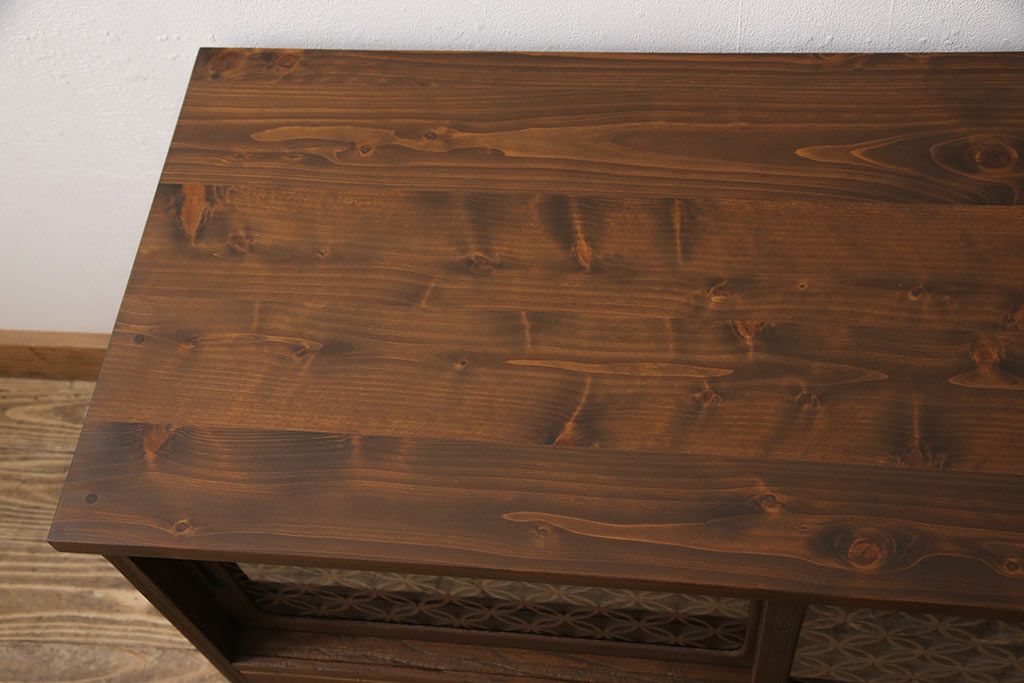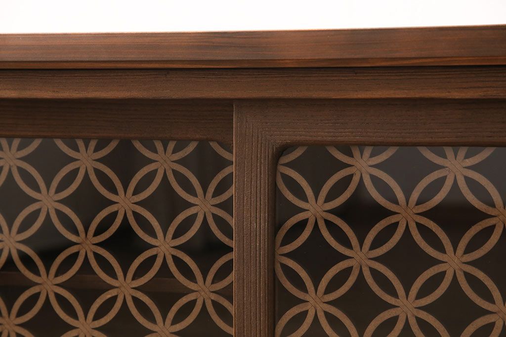 3段重ね桐箪笥をローボードとチェストにリメイク!上段は引き戸に組子ガラスをはめ込み、木製脚を取り付け。中段・下段は合わせてチェストに。いずれも天板を取り付けてオーク系着色仕上げ。