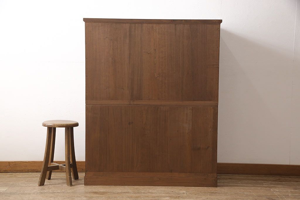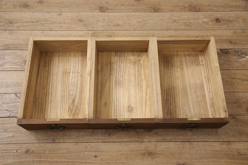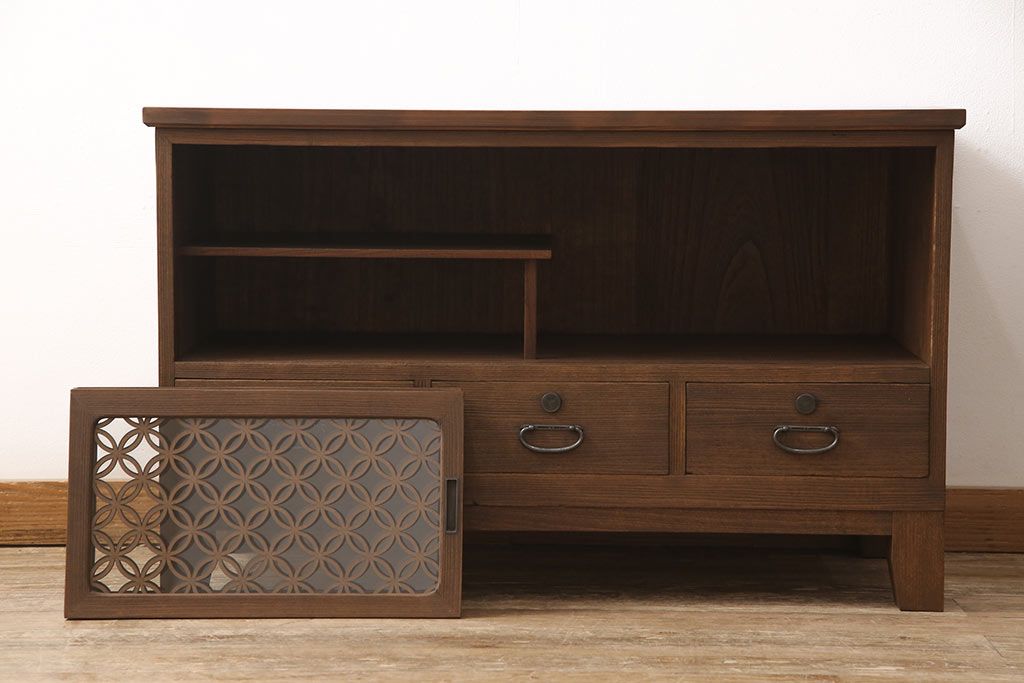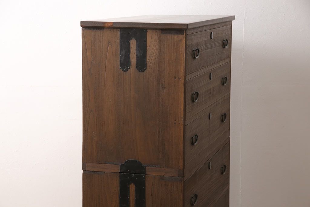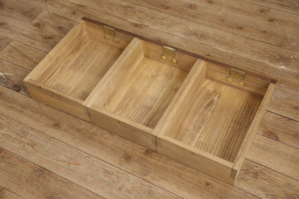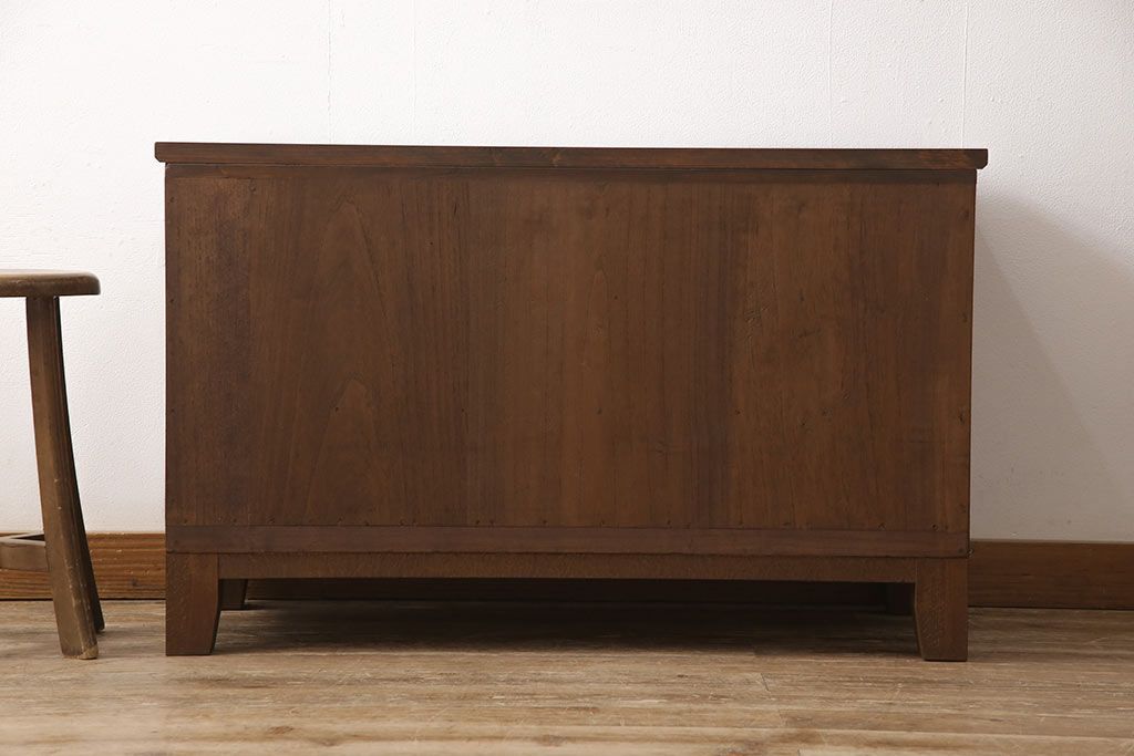 3段重ね桐箪笥をローボードとチェストにリメイク!上段は引き戸に組子ガラスをはめ込み、木製脚を取り付け。中段・下段は合わせてチェストに。いずれも天板を取り付けてオーク系着色仕上げ。