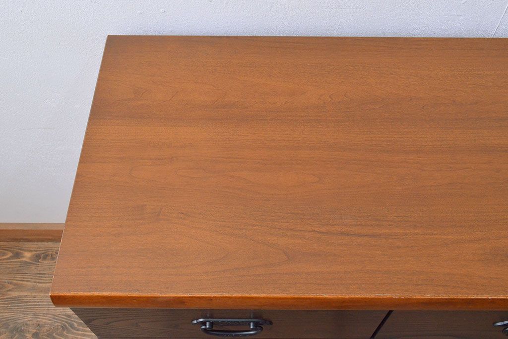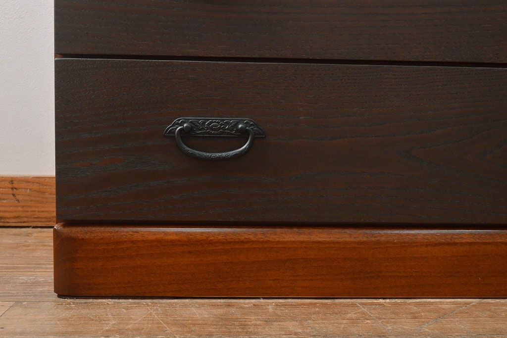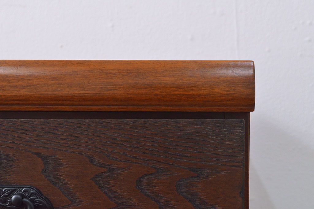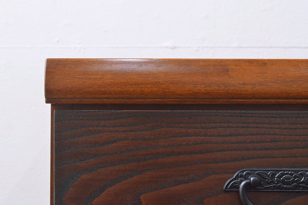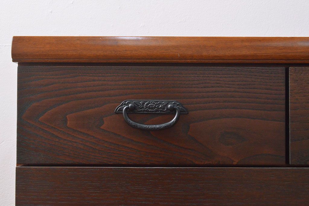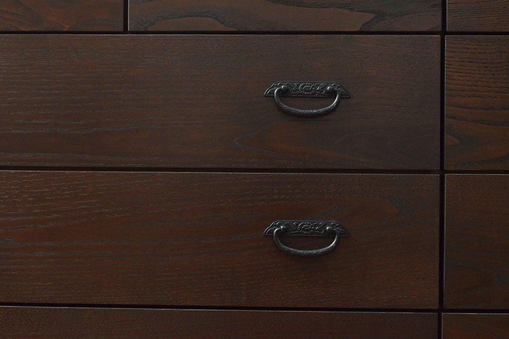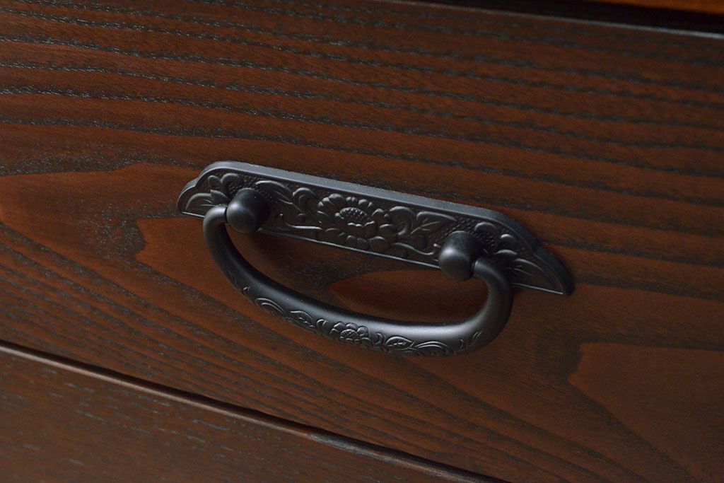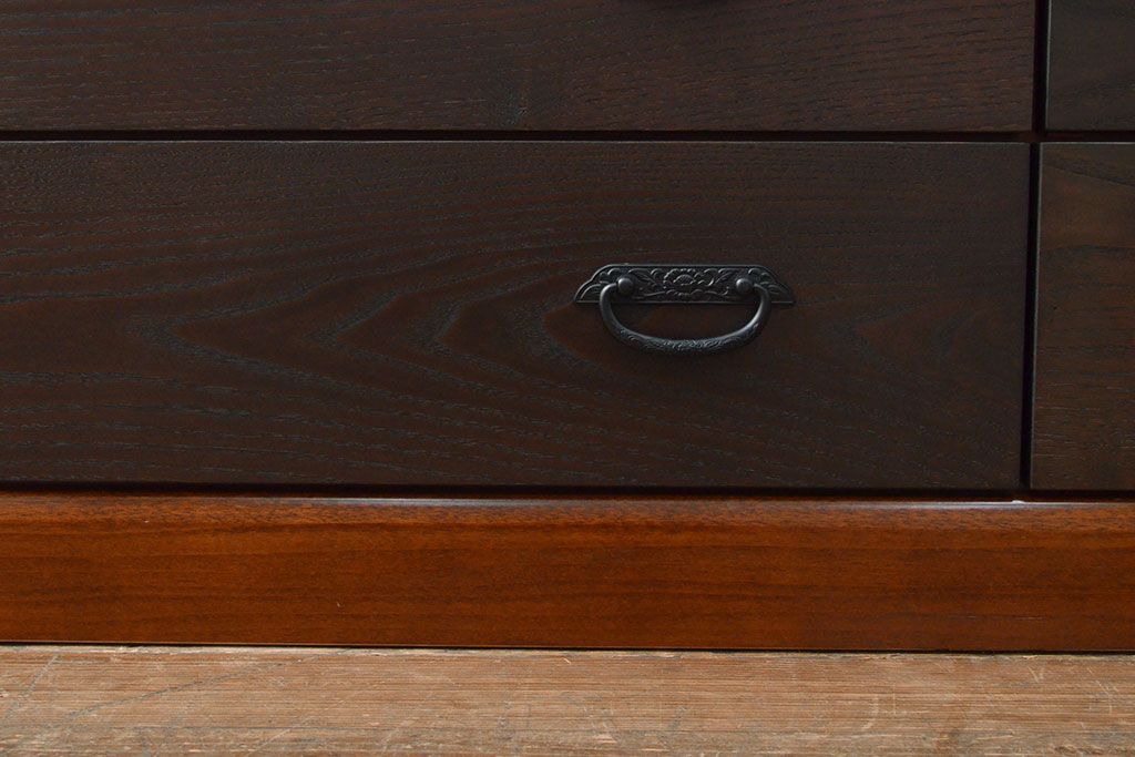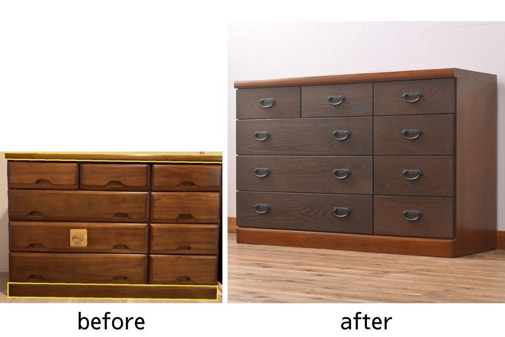 ローボードを使いやすくリメイク!高品質リペアを施し、引き出しの前板を交換。取っ手を取り付けて、前板部分を濃茶に着色仕上げ。