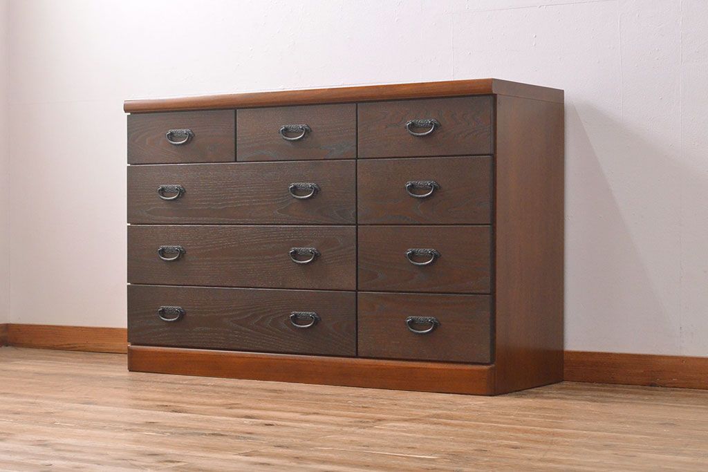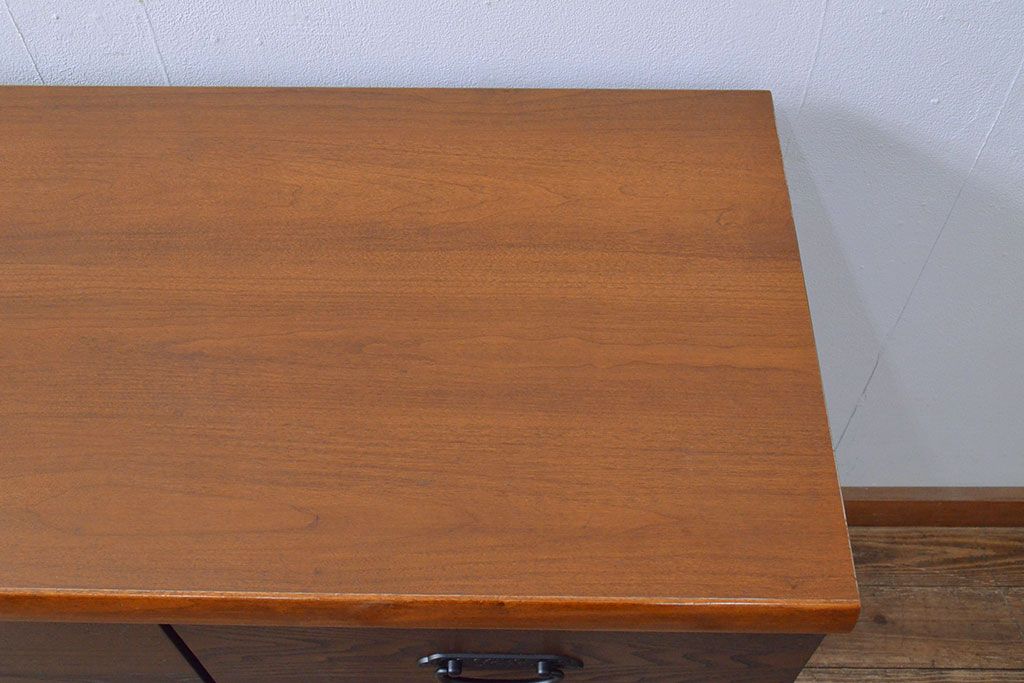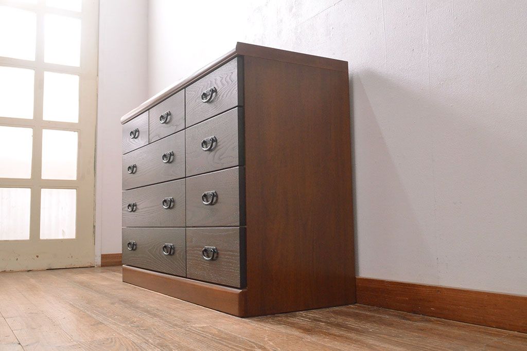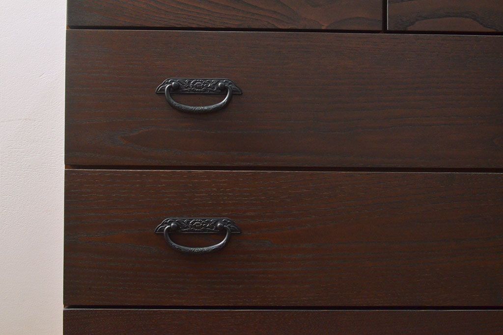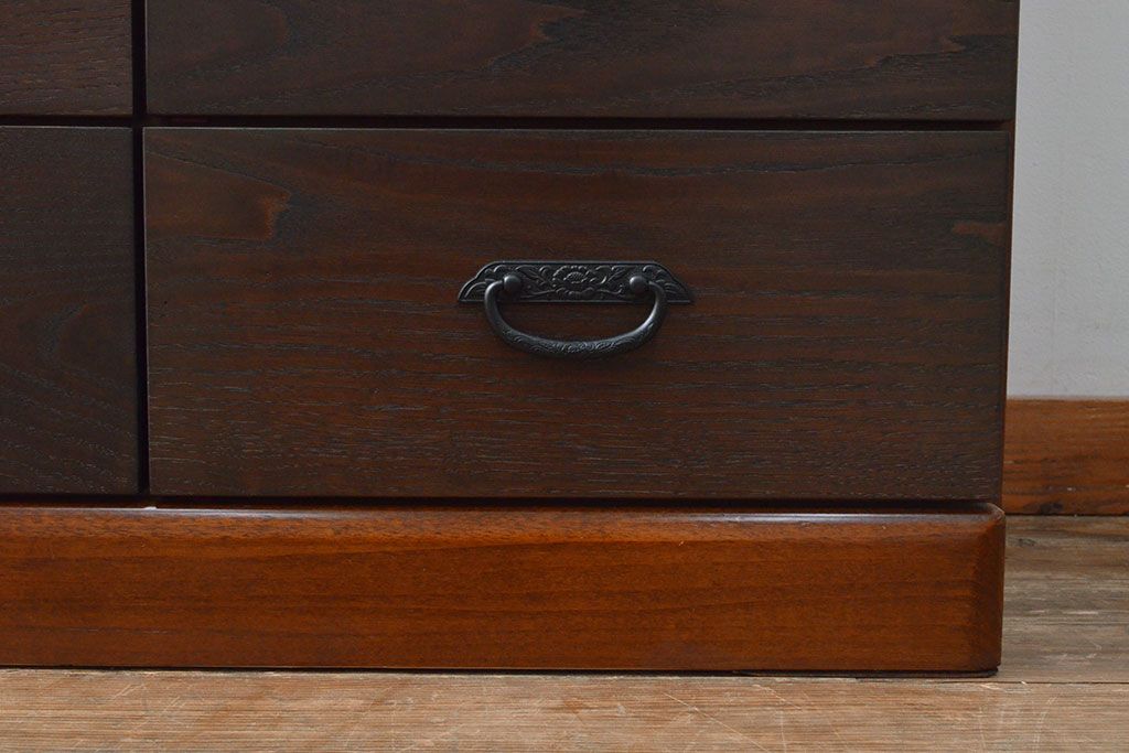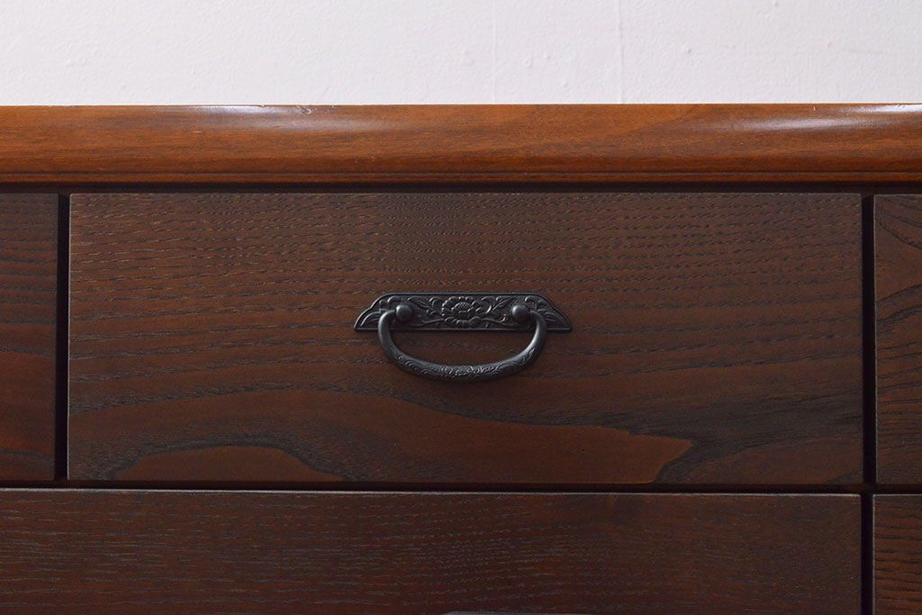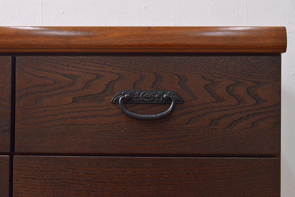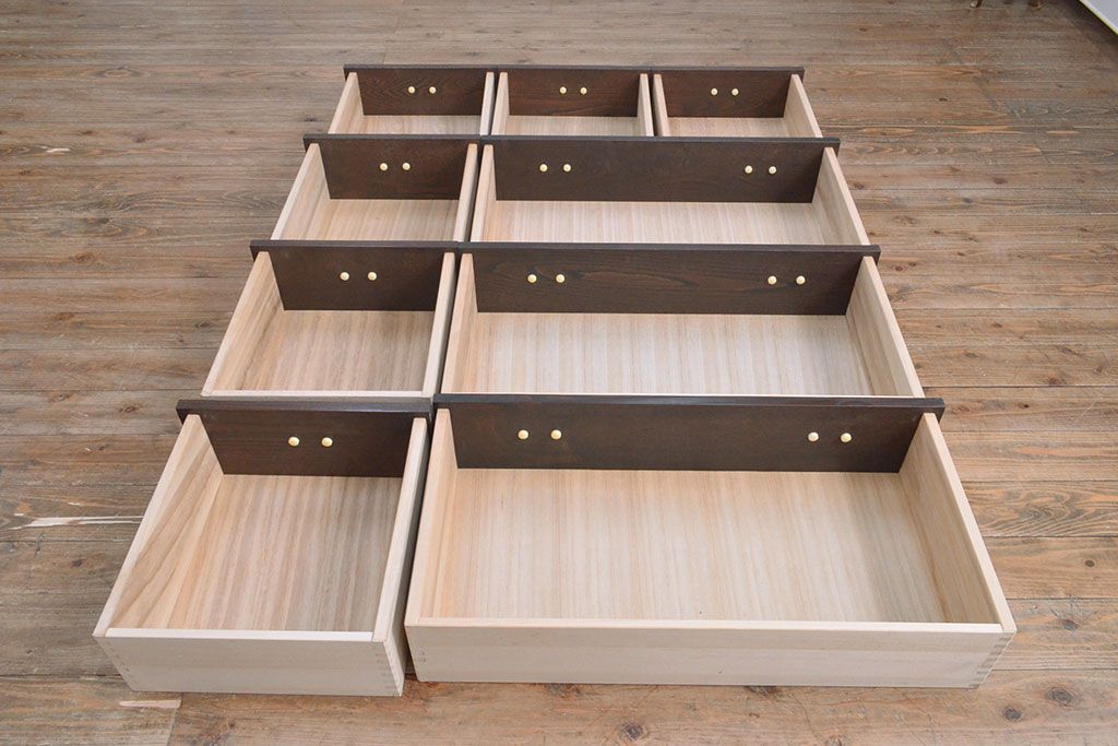 ローボードを使いやすくリメイク!高品質リペアを施し、引き出しの前板を交換。取っ手を取り付けて、前板部分を濃茶に着色仕上げ。