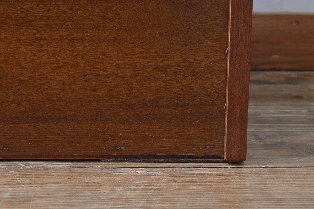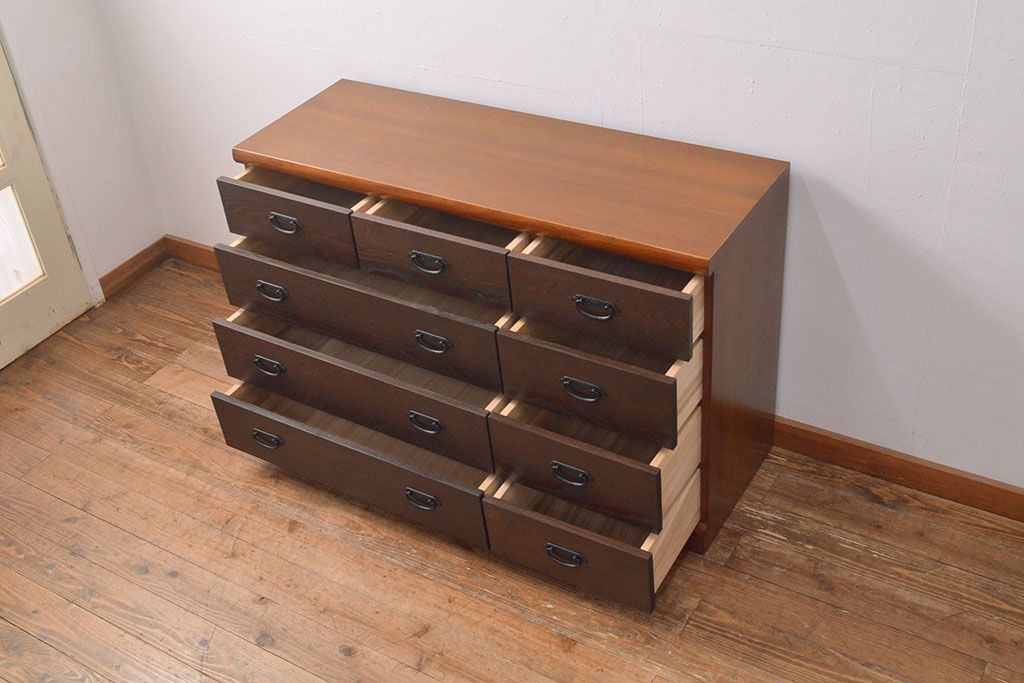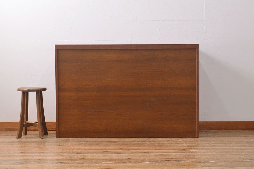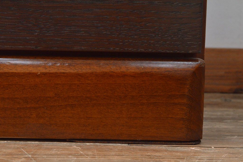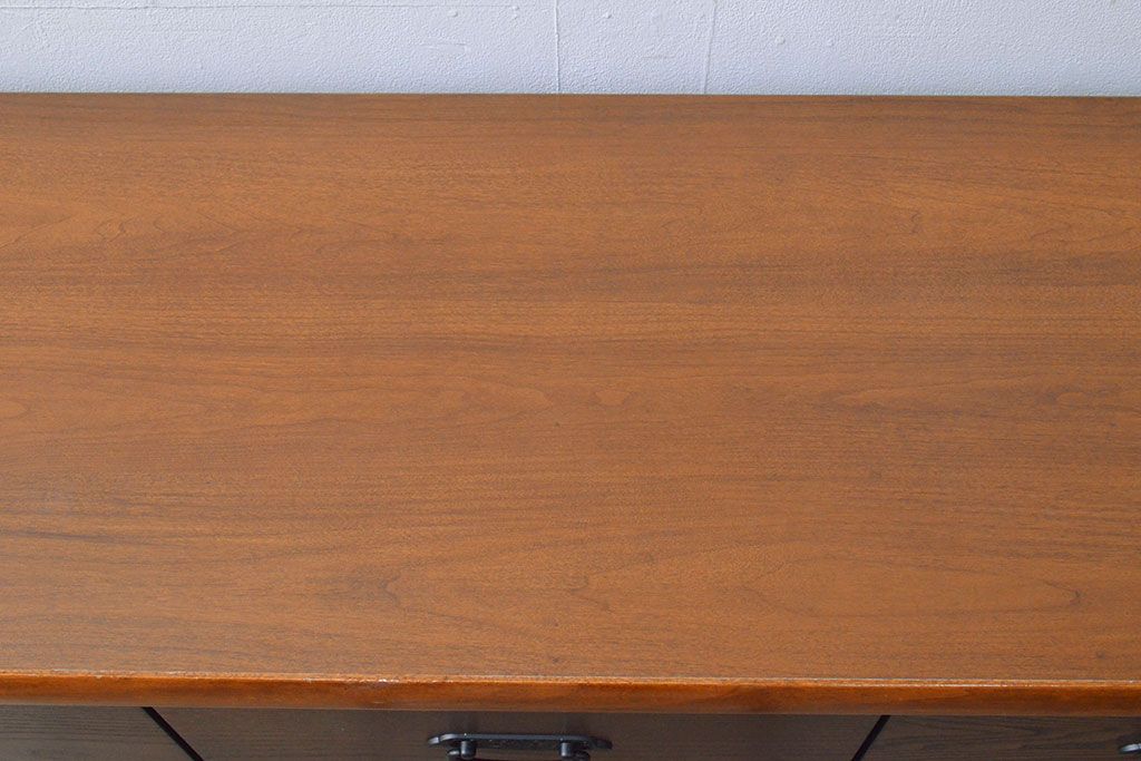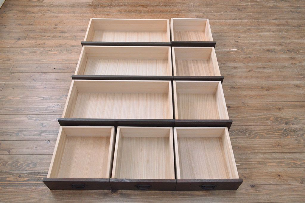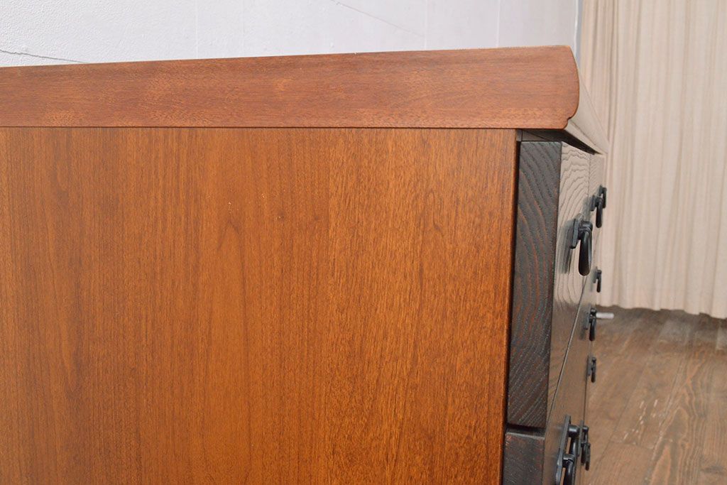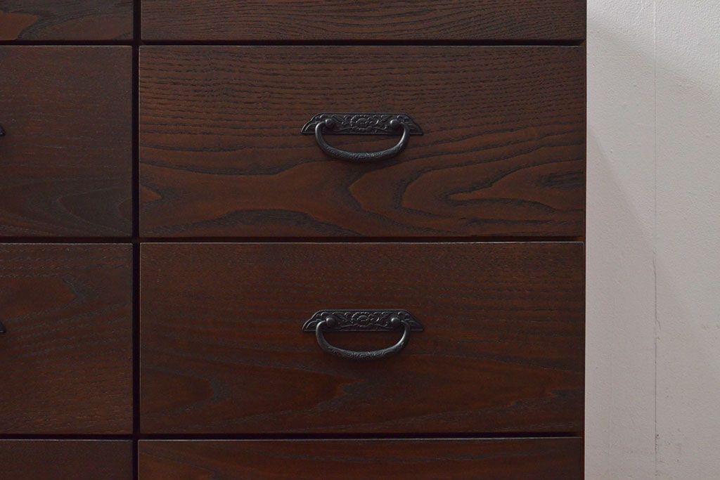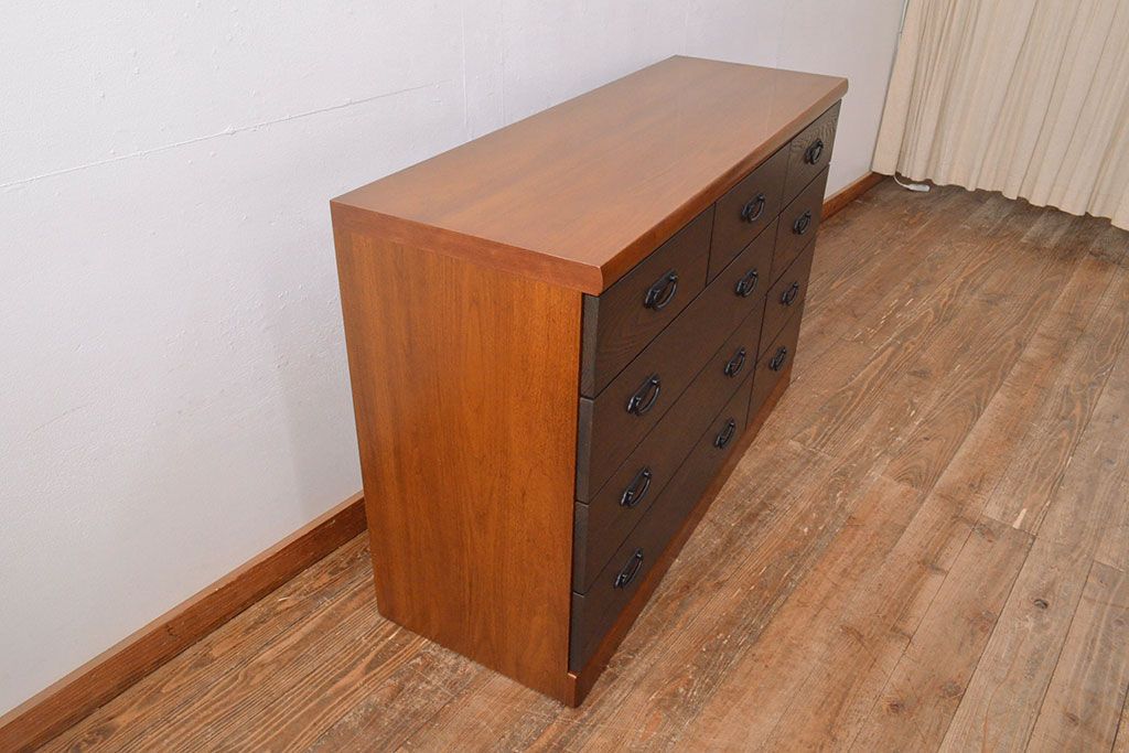 ローボードを使いやすくリメイク!高品質リペアを施し、引き出しの前板を交換。取っ手を取り付けて、前板部分を濃茶に着色仕上げ。