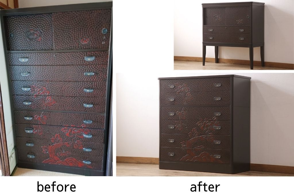 お客様持ち込みの婚礼箪笥を脚付チェストと脚なしチェストにリメイク
