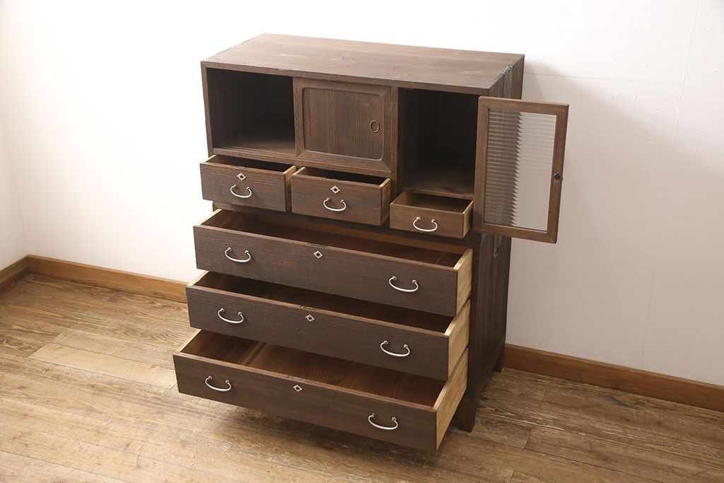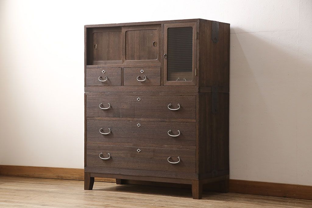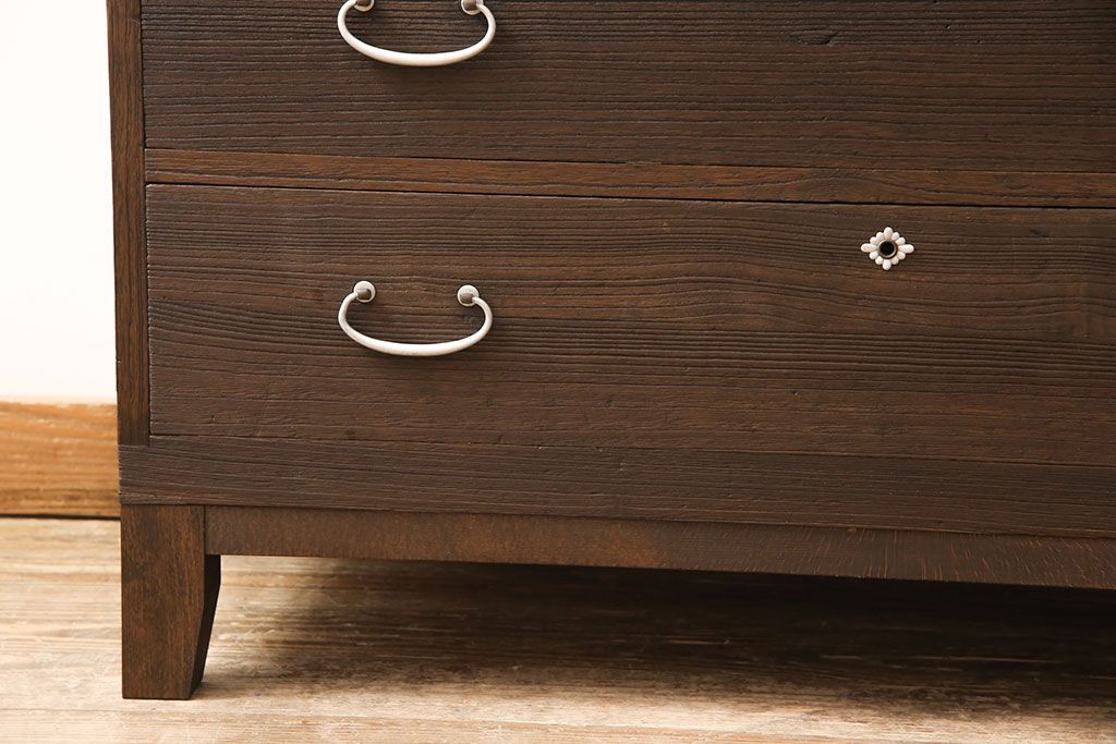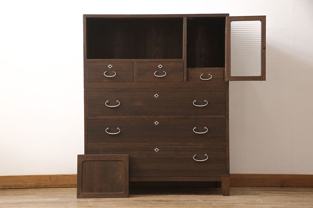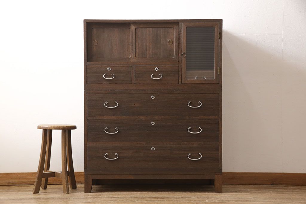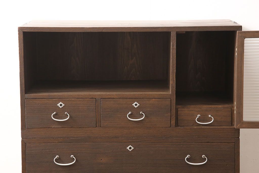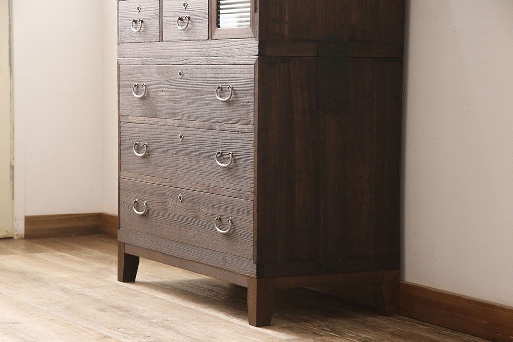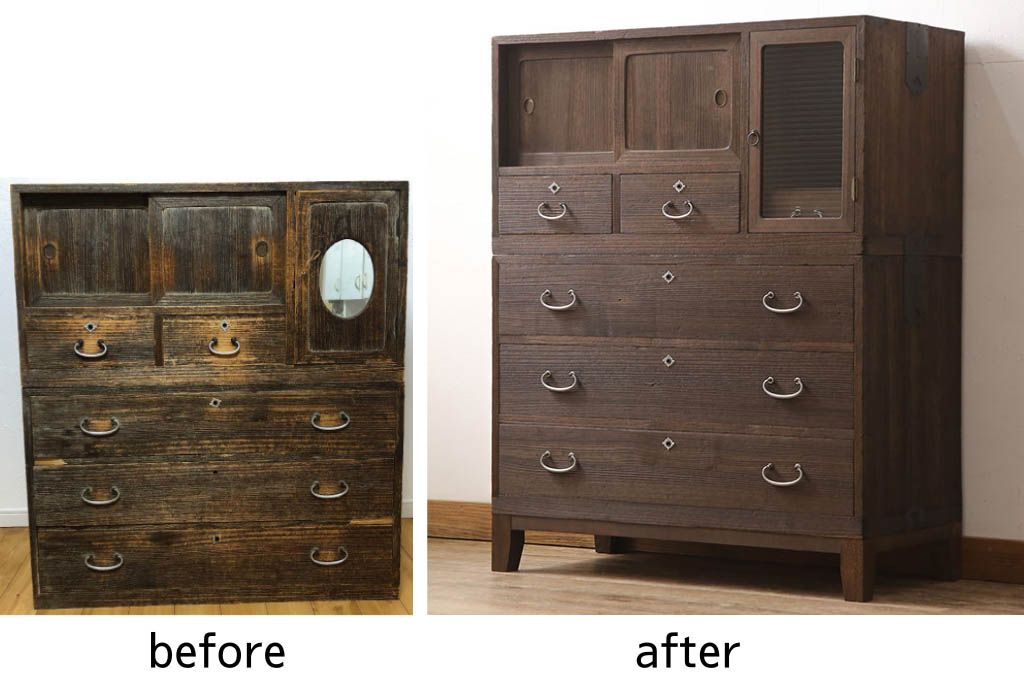 桐箪笥を脚付き箪笥にリメイク!開き戸にはモールガラスをはめ込み取っ手を追加。木製脚の取り付けと、鍵穴の欠損部分に新しい部品の取り付け。ご希望の色に着色仕上げ。