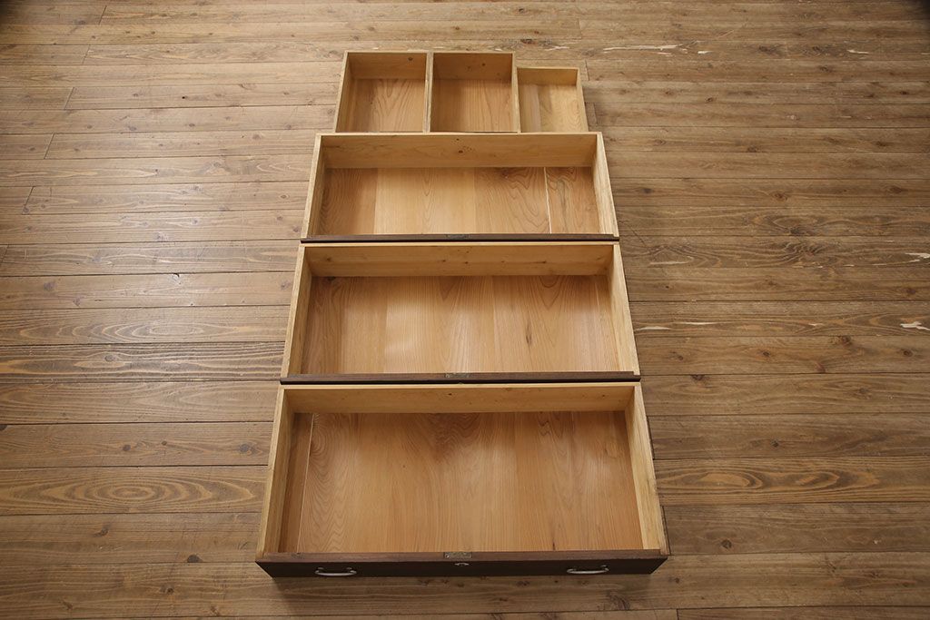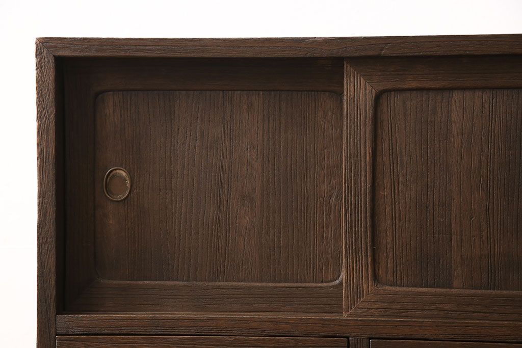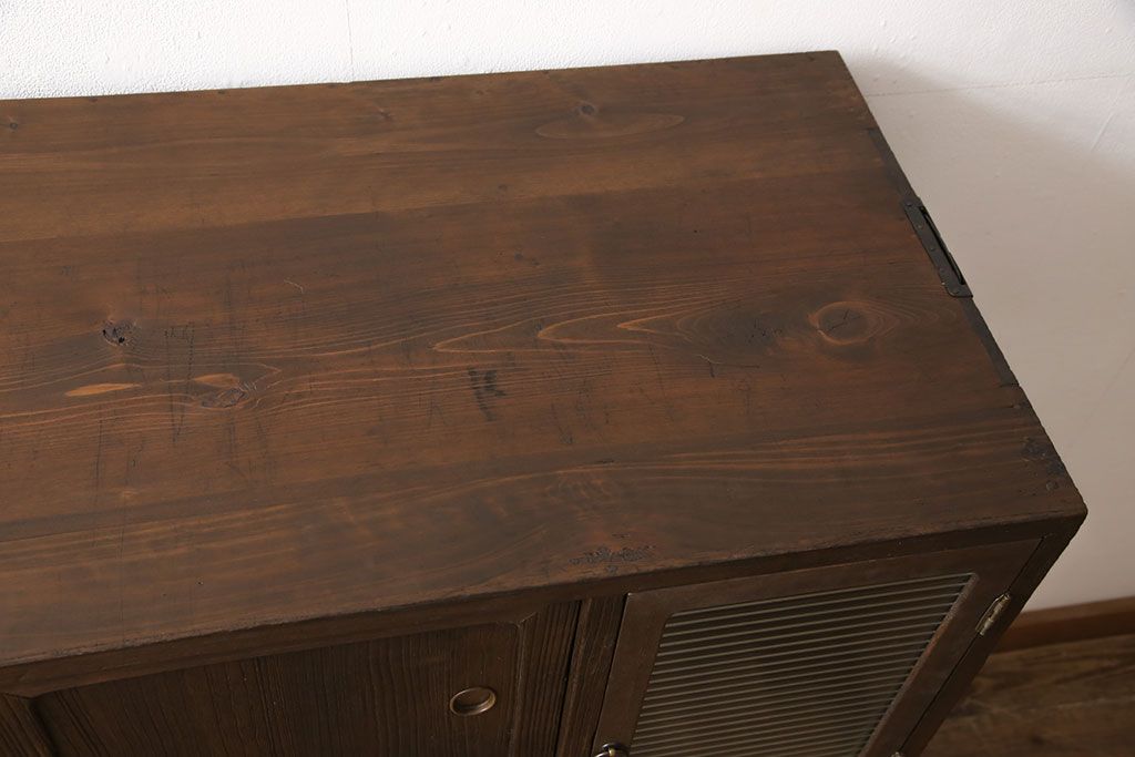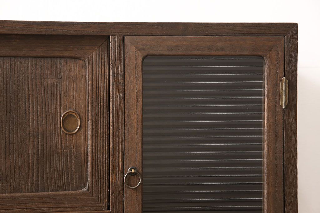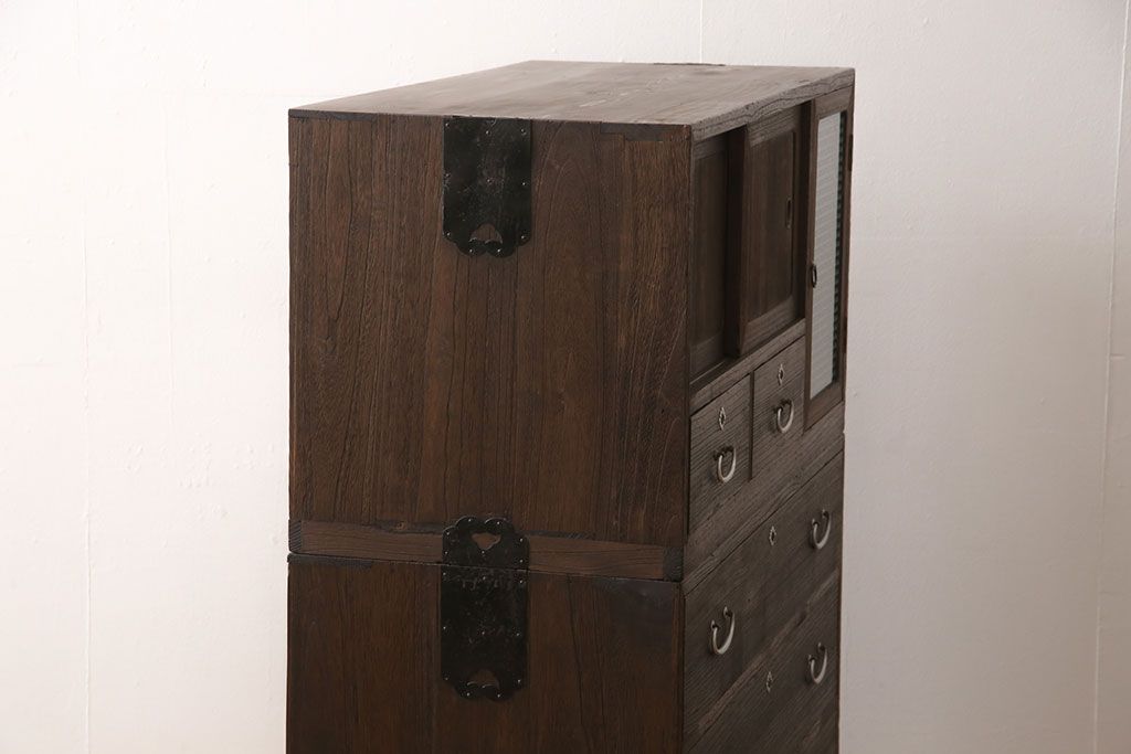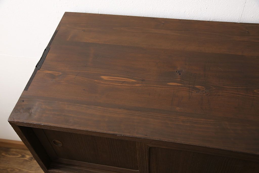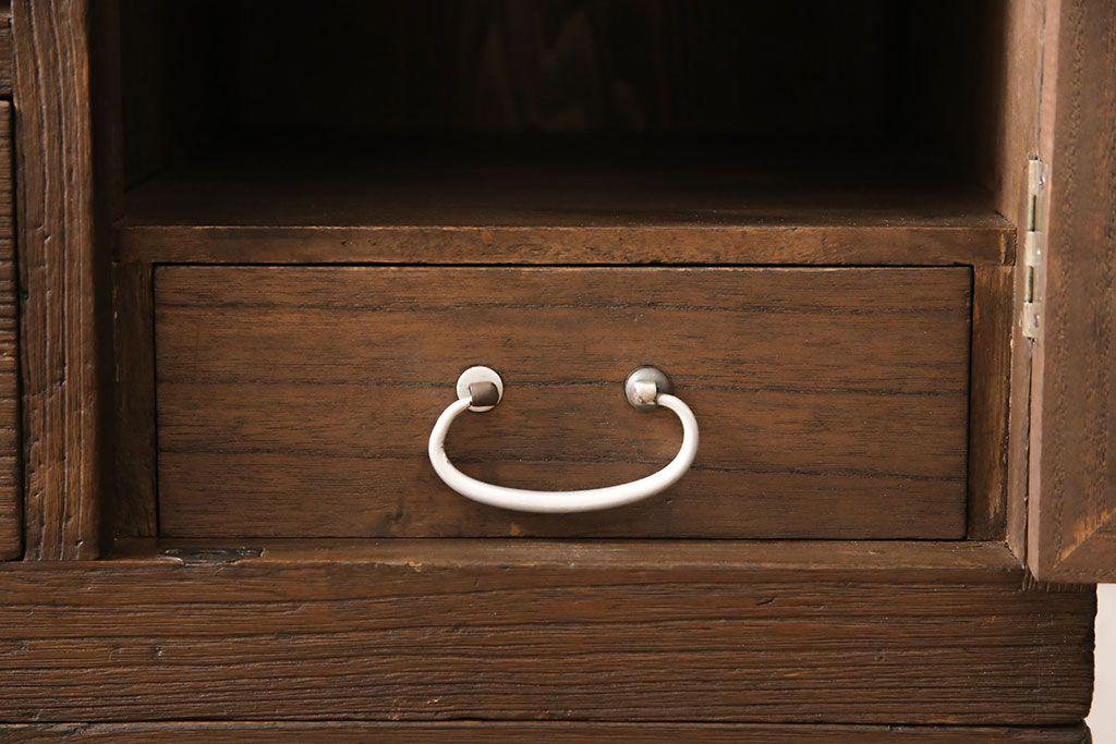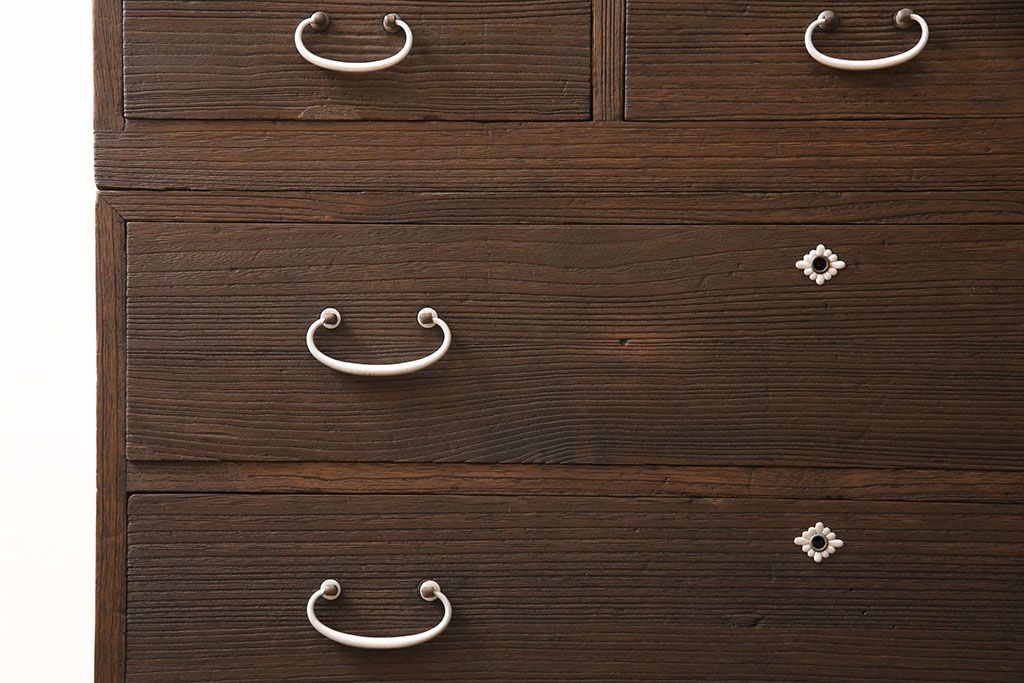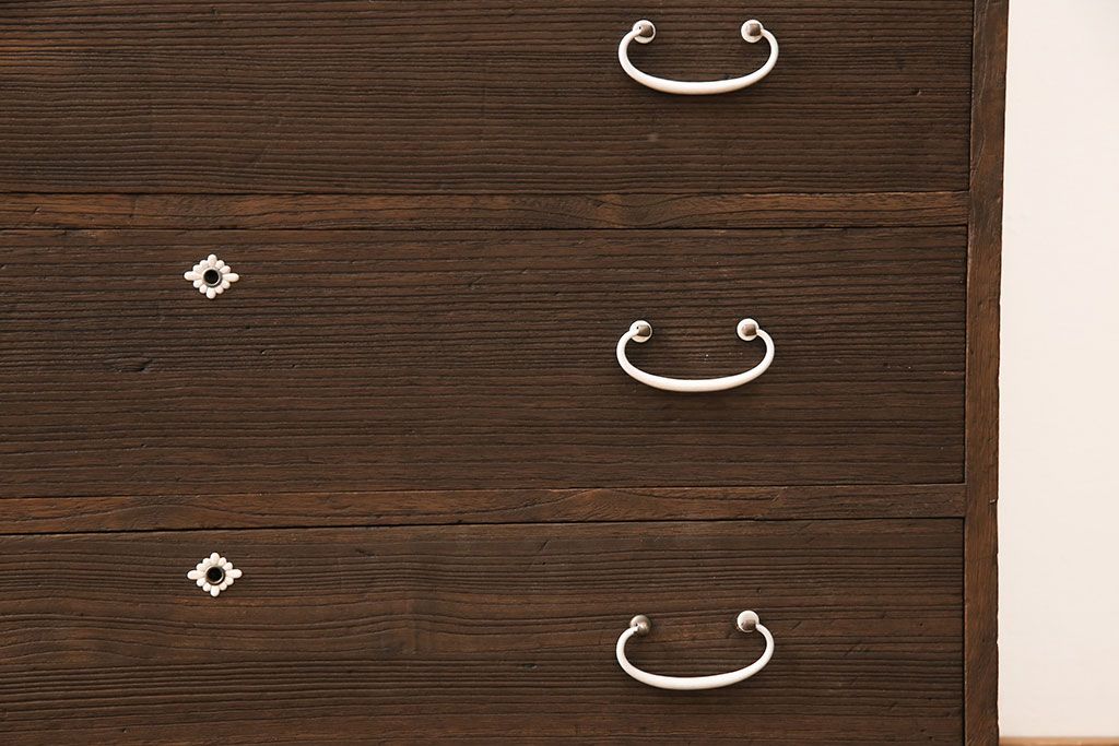 桐箪笥を脚付き箪笥にリメイク!開き戸にはモールガラスをはめ込み取っ手を追加。木製脚の取り付けと、鍵穴の欠損部分に新しい部品の取り付け。ご希望の色に着色仕上げ。