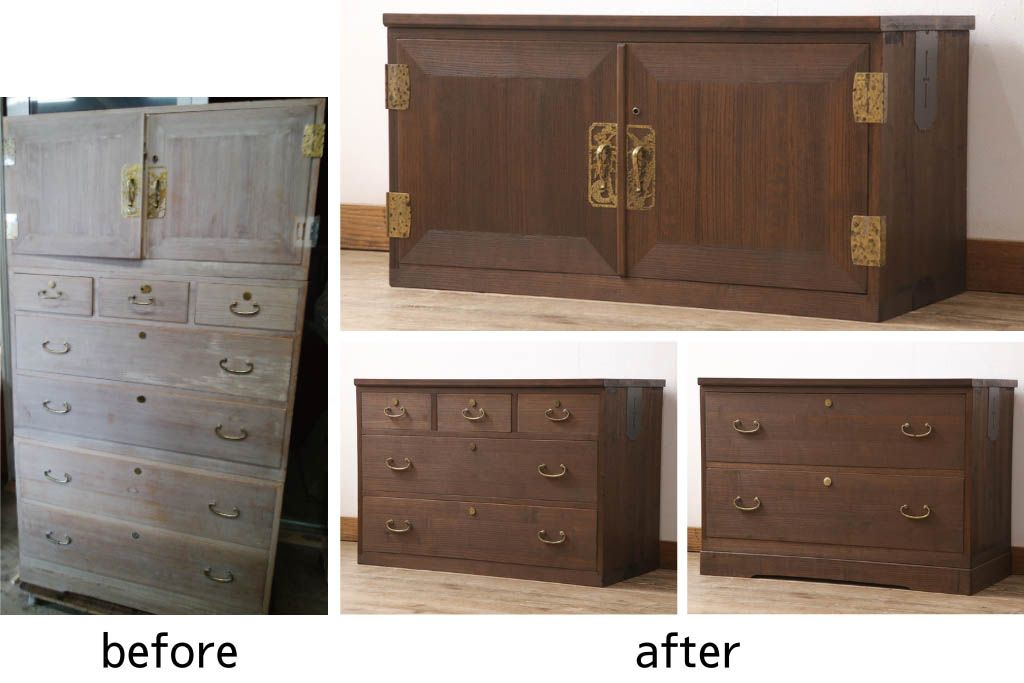 お客様持ち込みの桐箪笥をテレビボード・チェスト2点にリメイク