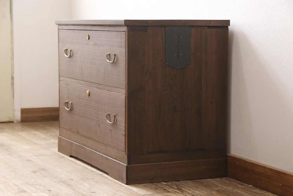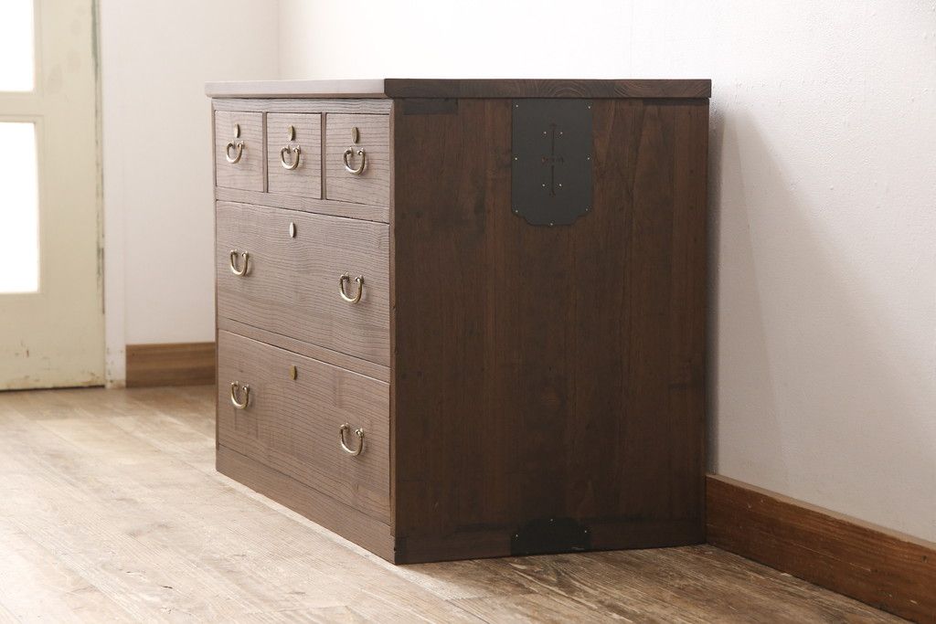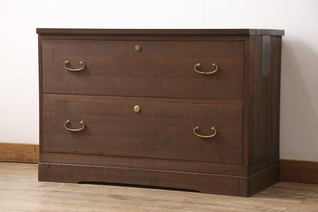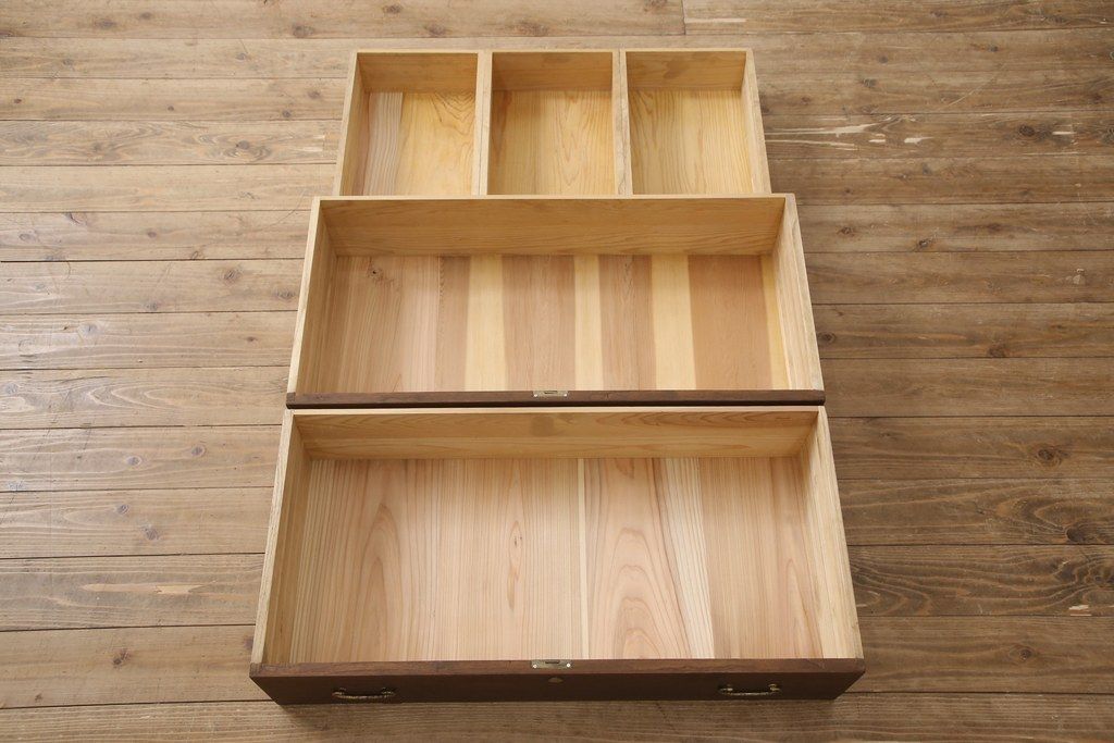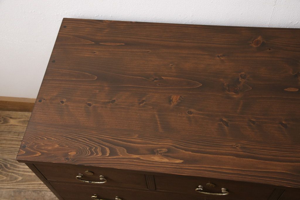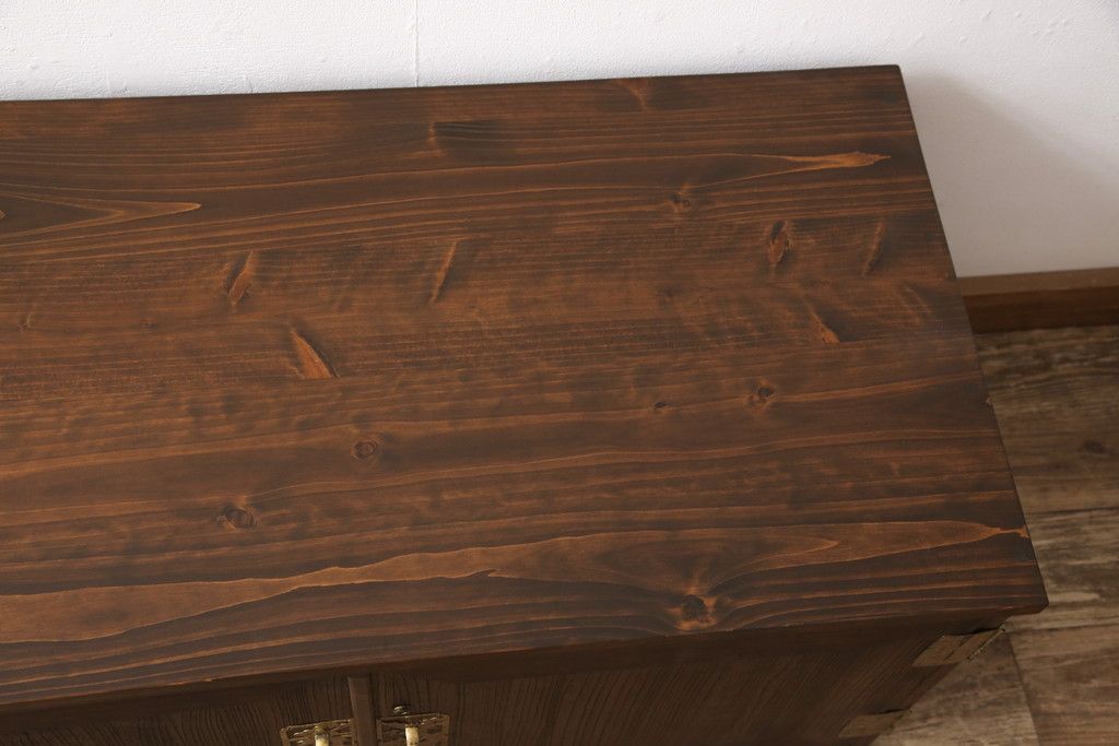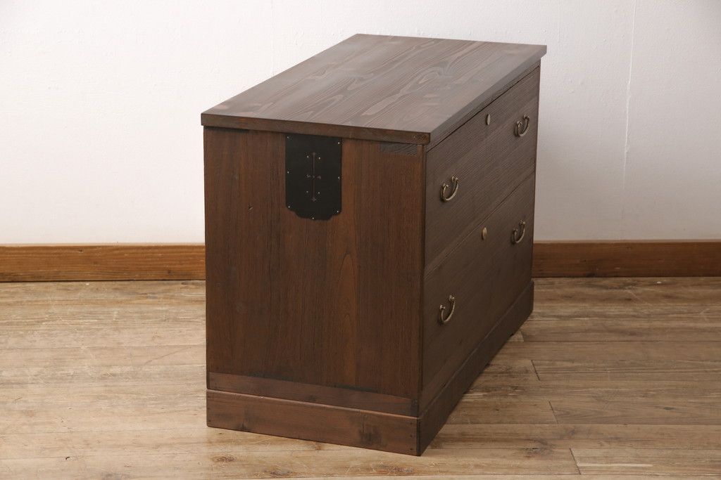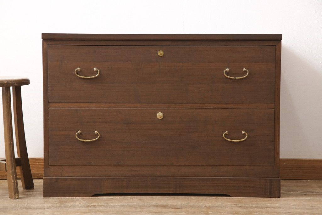 3段重ね桐箪笥をテレビボードと2つのチェストにリメイク!上段は引き出しを撤去し、棚板に変更してテレビボードに。下段は鍵穴隠しを交換。全て天板を追加し、オーク系に着色仕上げ。