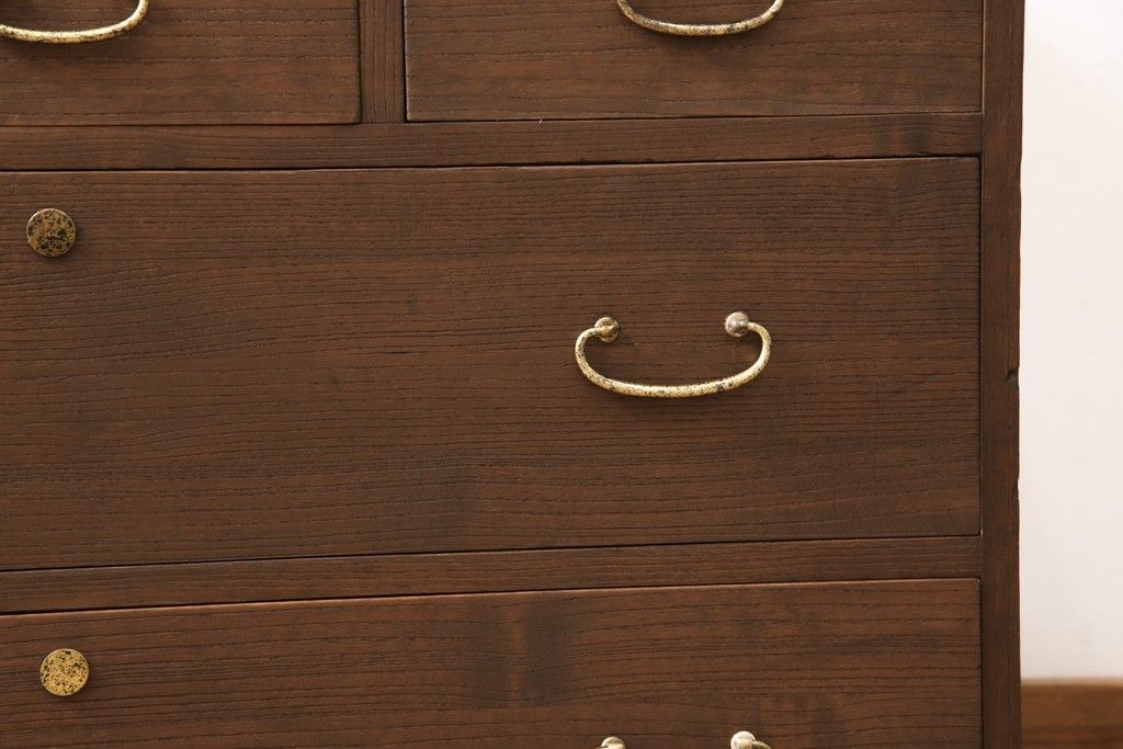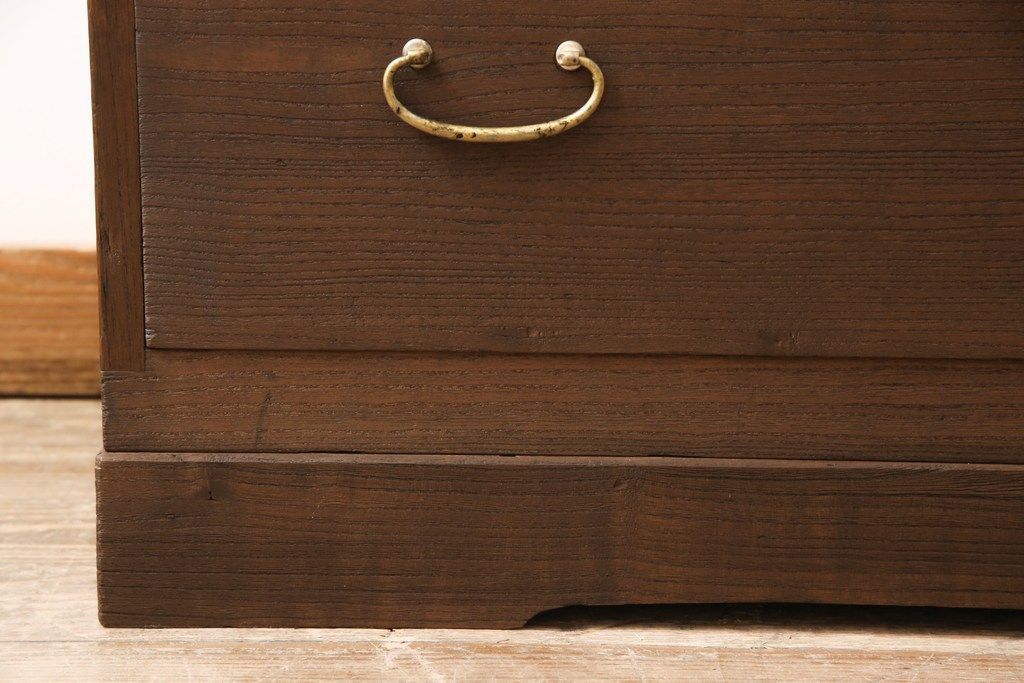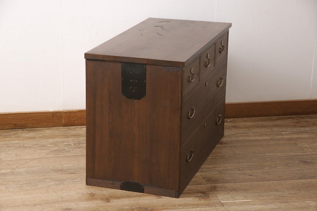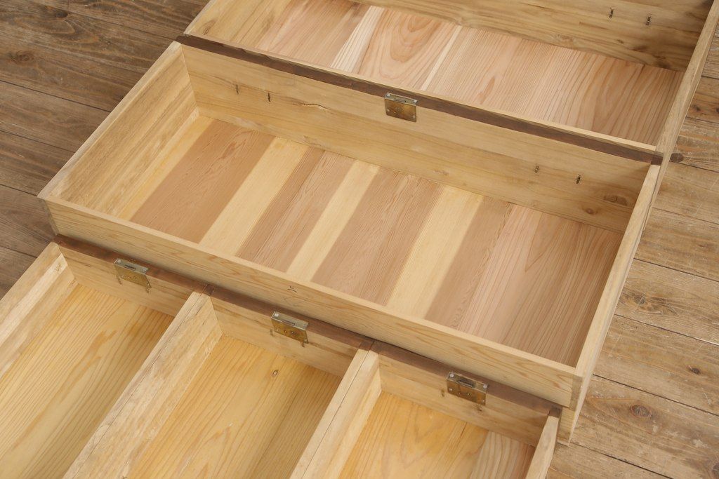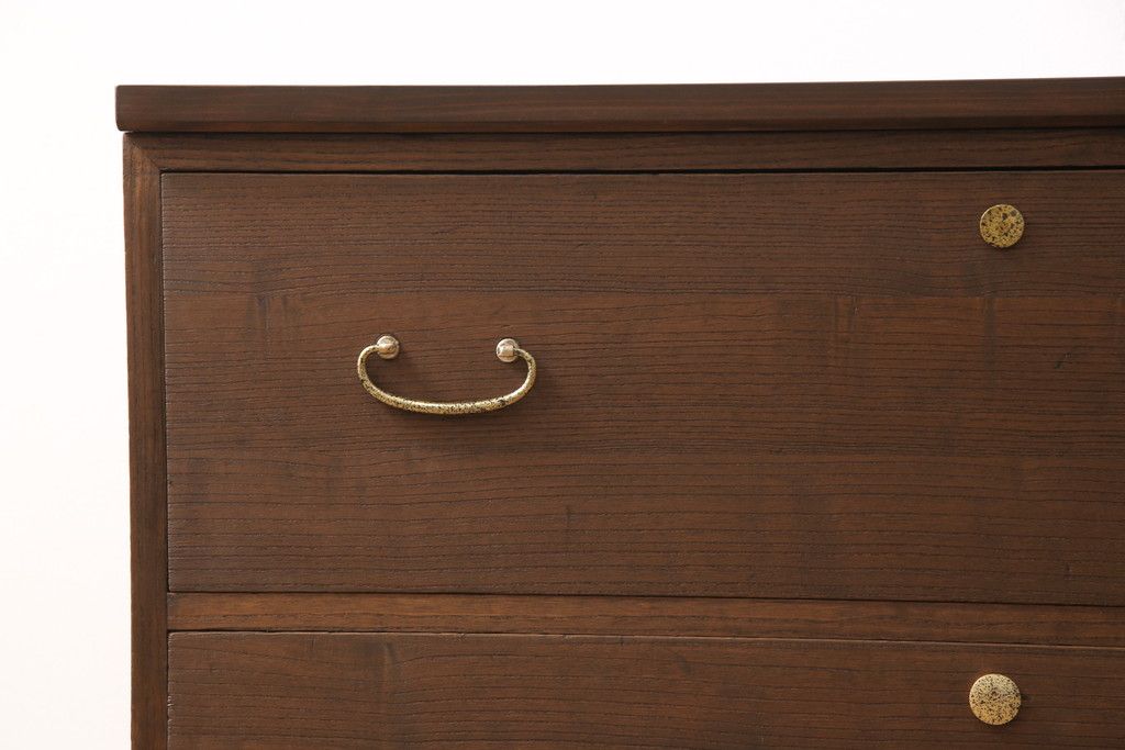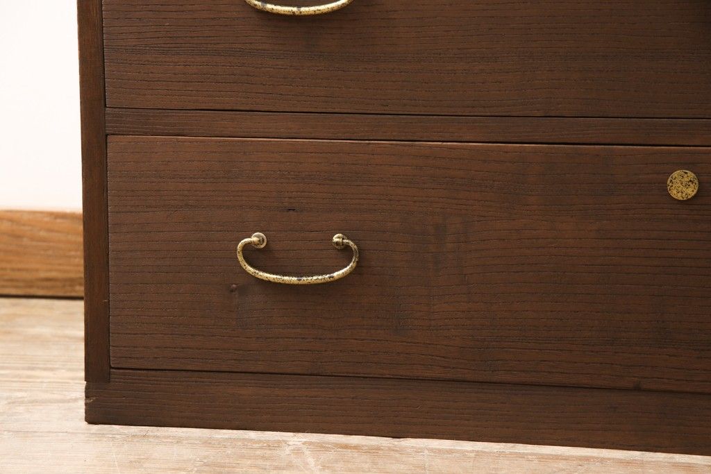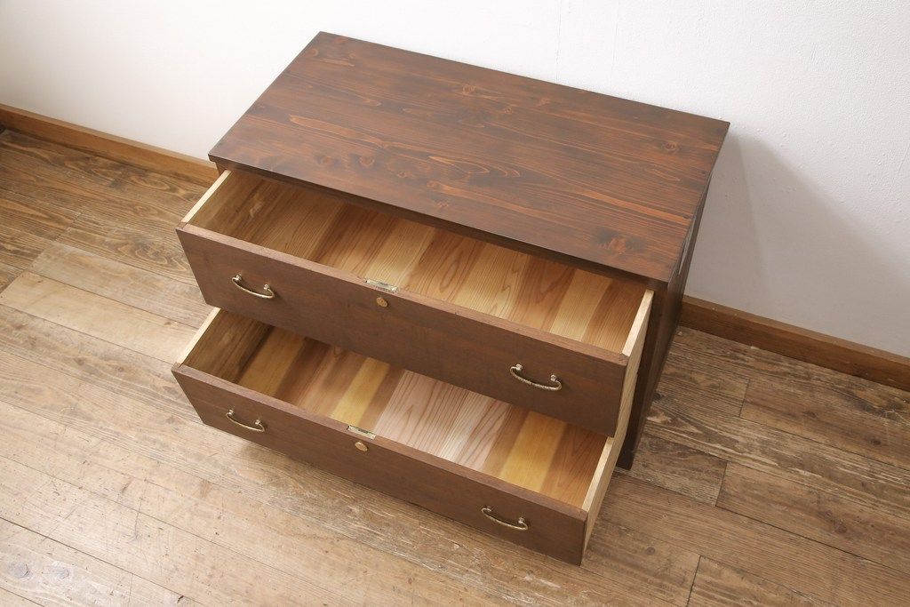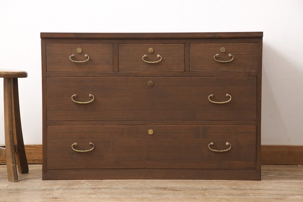 3段重ね桐箪笥をテレビボードと2つのチェストにリメイク!上段は引き出しを撤去し、棚板に変更してテレビボードに。下段は鍵穴隠しを交換。全て天板を追加し、オーク系に着色仕上げ。