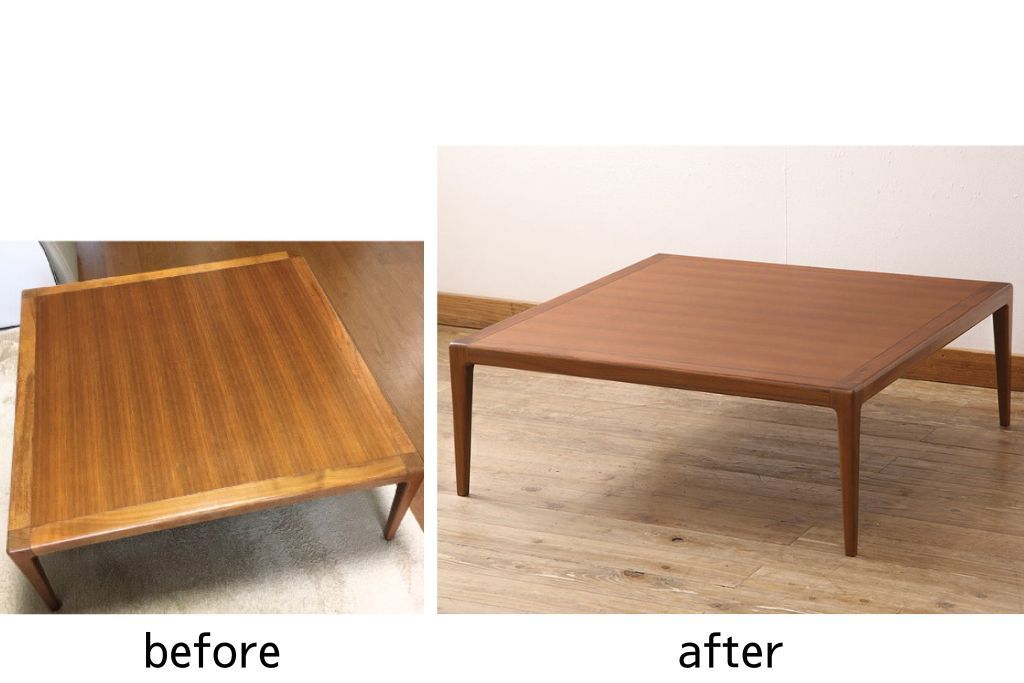 座卓を綺麗に再生!高品質リペアを施し、折れた脚1本を修復。天板の傷みを修理し、再塗装して仕上げ。