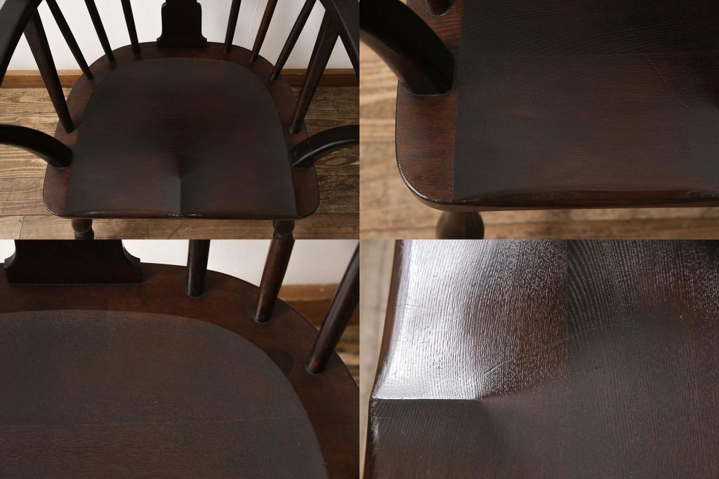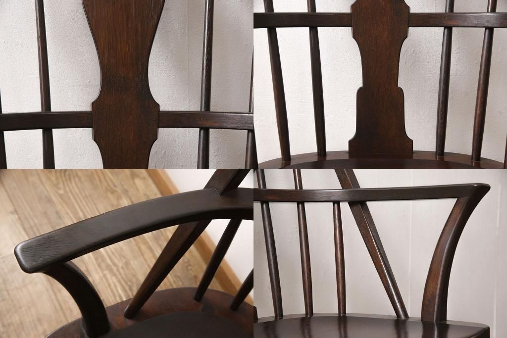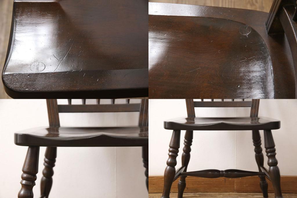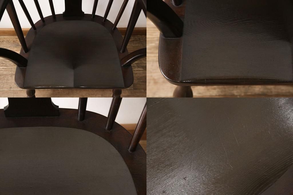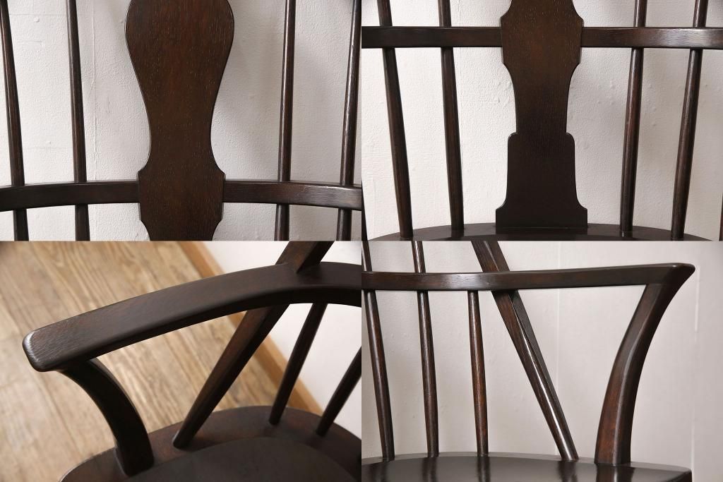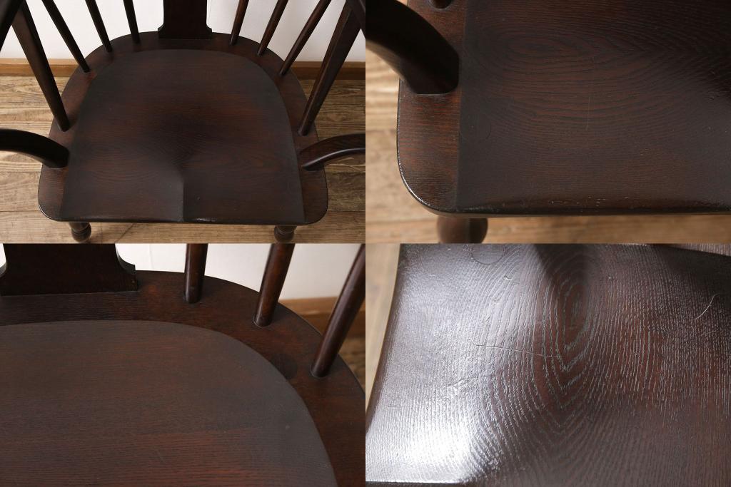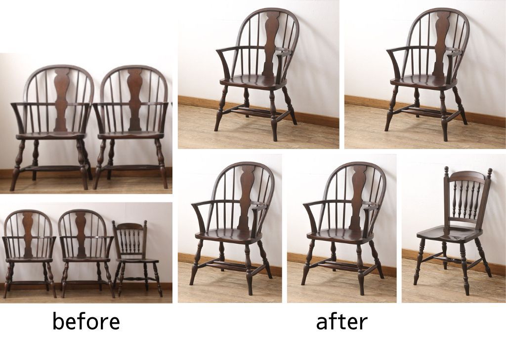 松本民芸家具のアームチェア4脚、スピンドルチェア1脚を綺麗に再生!高品質リペアを施し、スピンドルチェアのみペイントを剥離。キズが馴染むよう、必要に応じて着色・ワックス仕上げに。