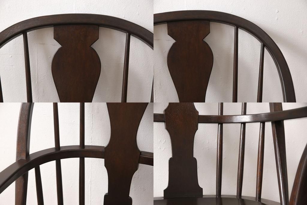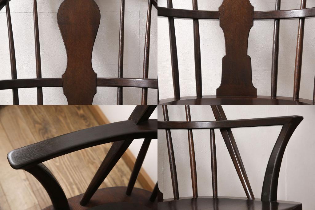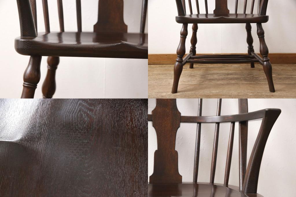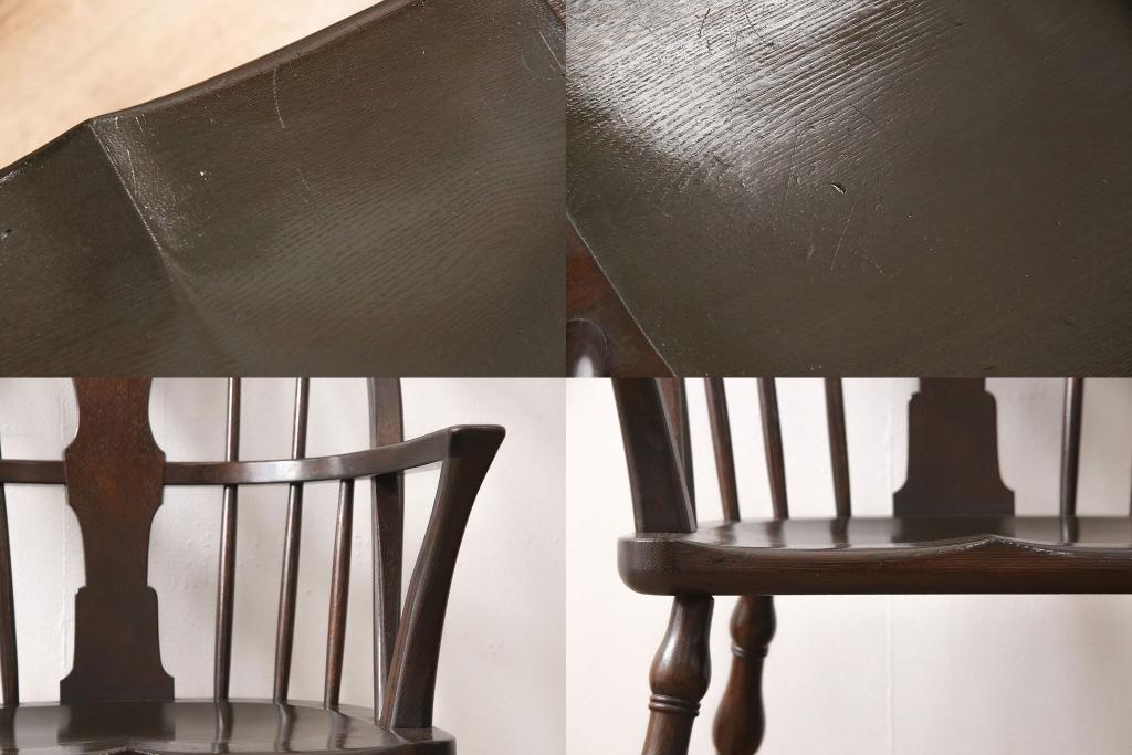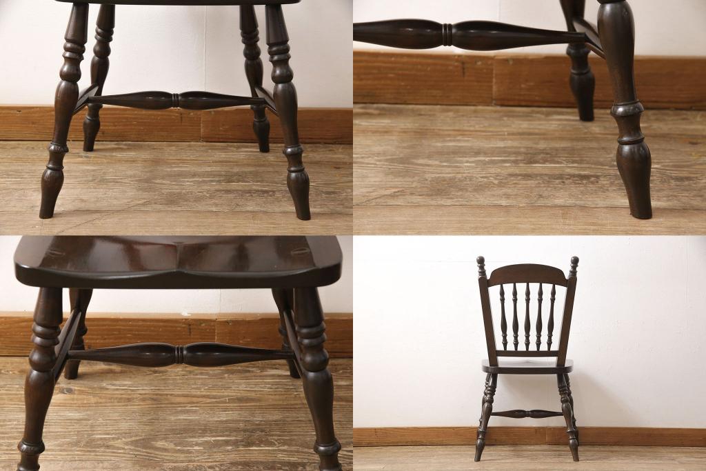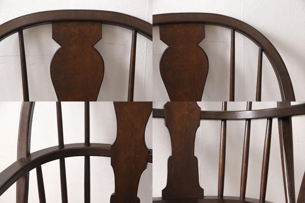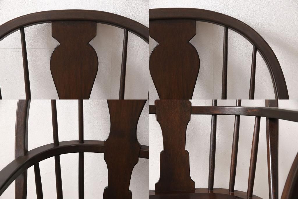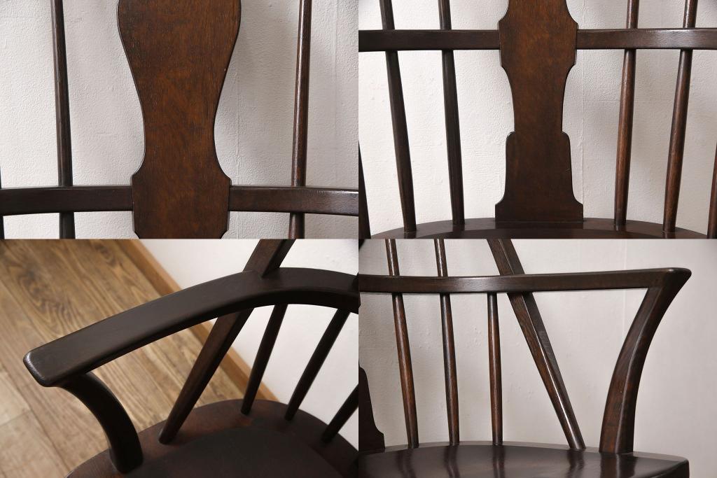 松本民芸家具のアームチェア4脚、スピンドルチェア1脚を綺麗に再生!高品質リペアを施し、スピンドルチェアのみペイントを剥離。キズが馴染むよう、必要に応じて着色・ワックス仕上げに。