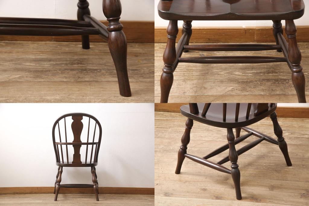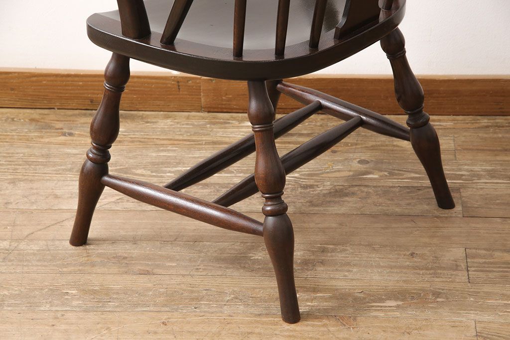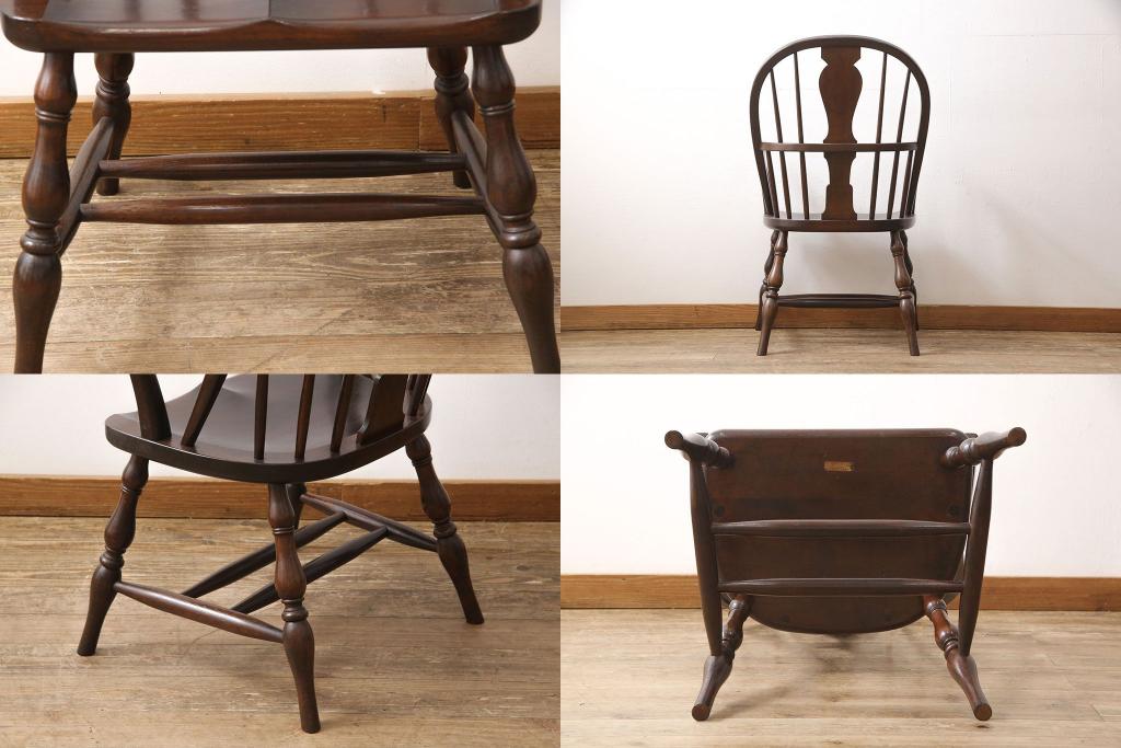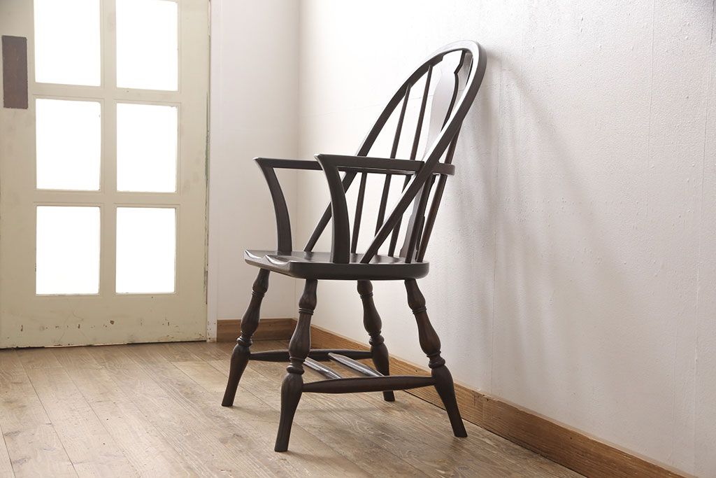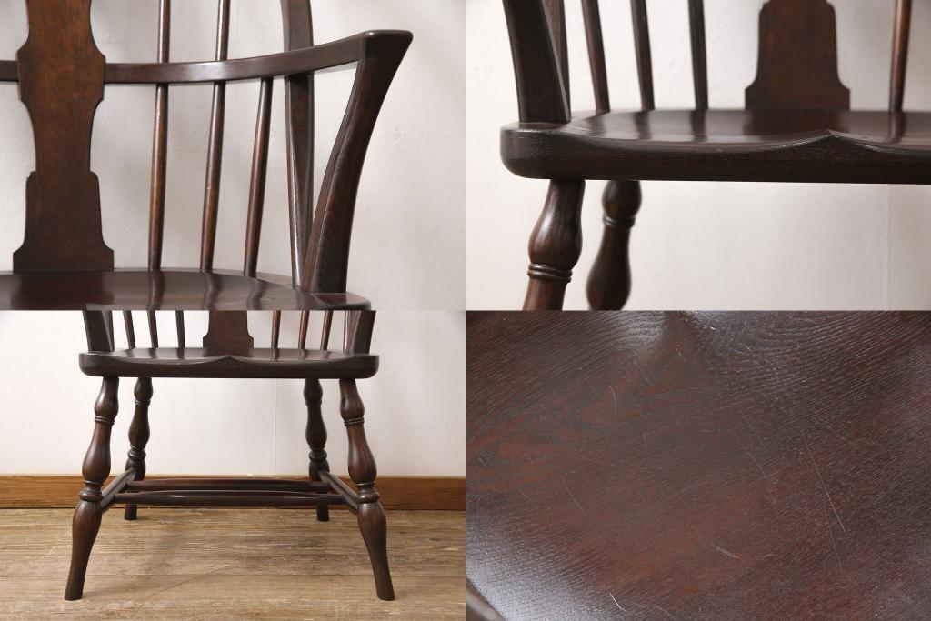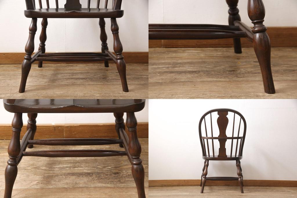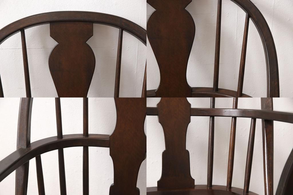 松本民芸家具のアームチェア4脚、スピンドルチェア1脚を綺麗に再生!高品質リペアを施し、スピンドルチェアのみペイントを剥離。キズが馴染むよう、必要に応じて着色・ワックス仕上げに。