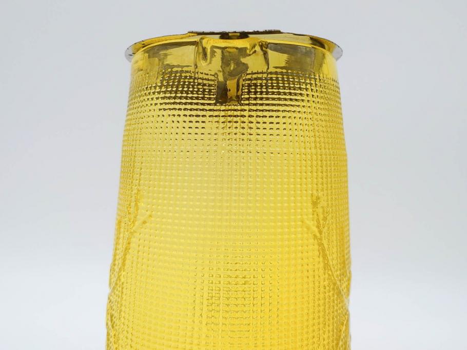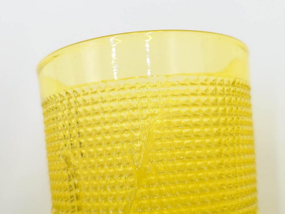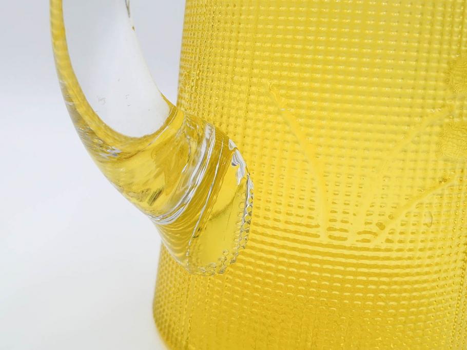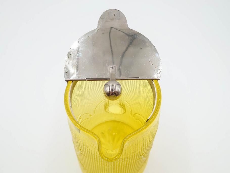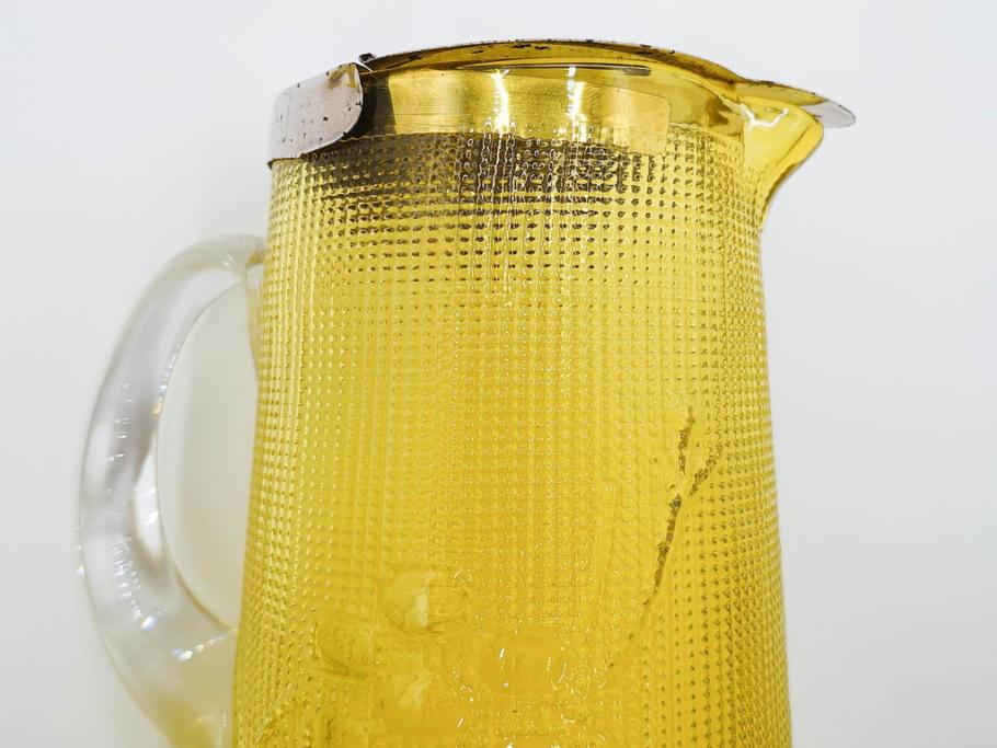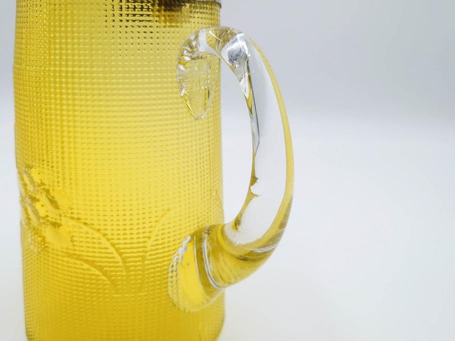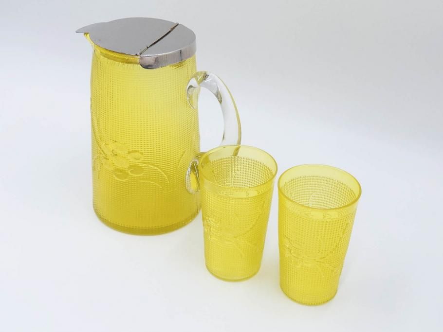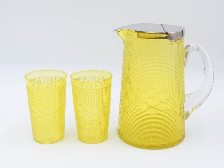 大正〜昭和初期 花文 黄色 ガラス 鮮やかな色合いが食卓に明るさと個性を添える水差し&コップ2客セット(硝子、ジャグ、蓋付き、魚子、ピッチャー、グラス、和ガラス)(R-083565)