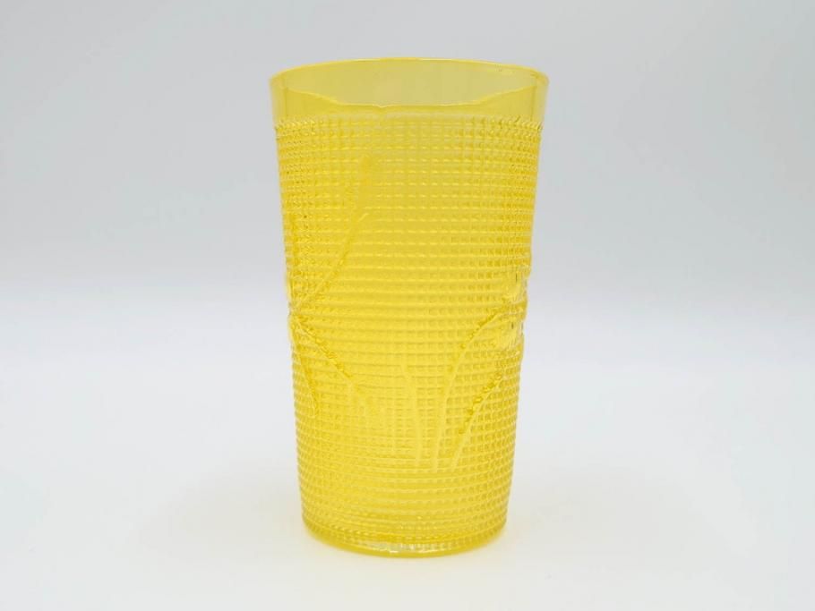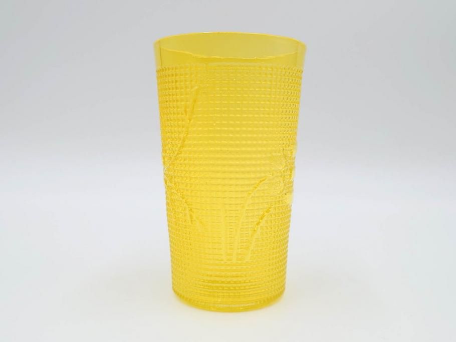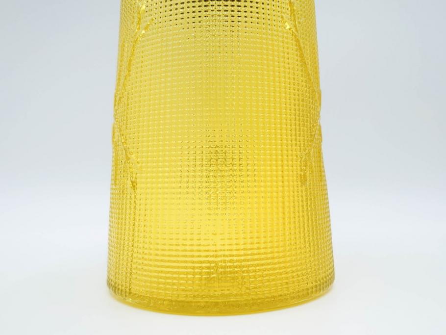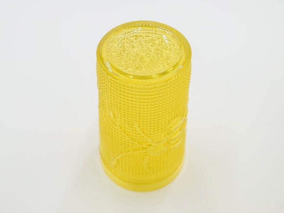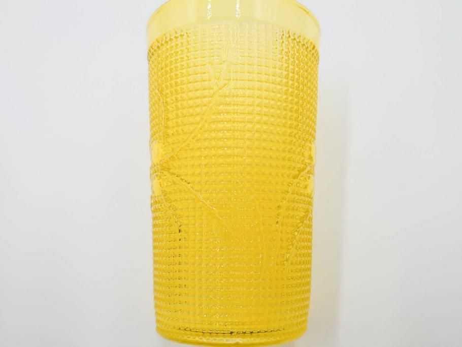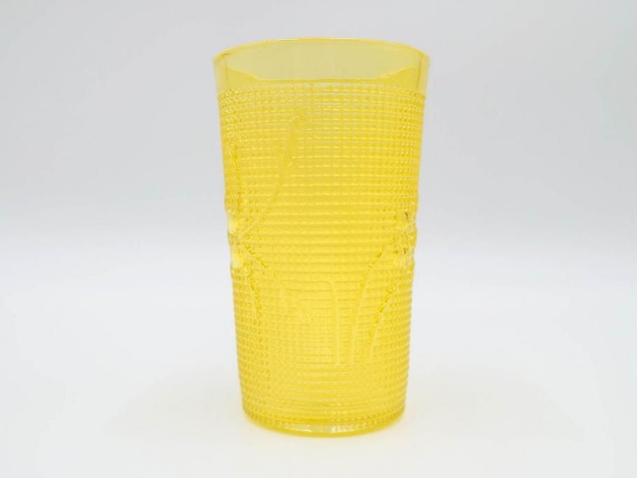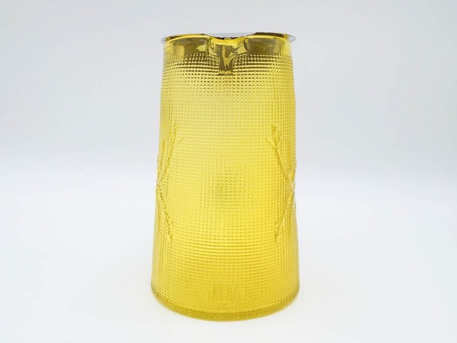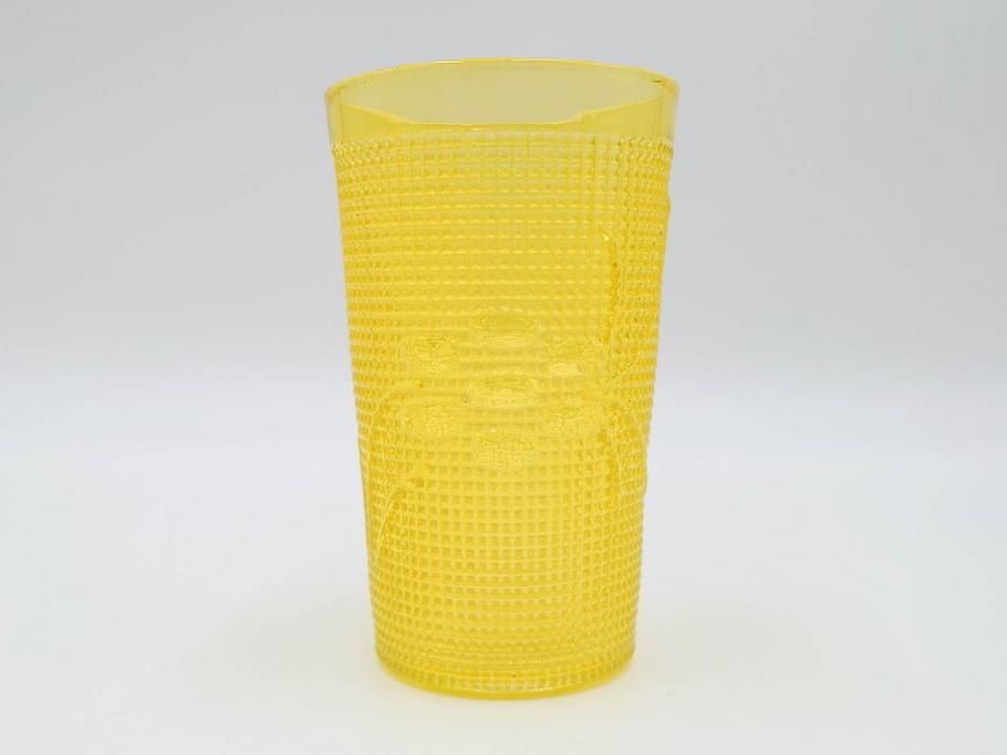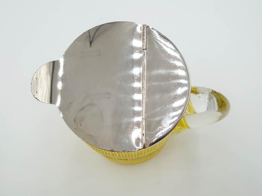 大正〜昭和初期 花文 黄色 ガラス 鮮やかな色合いが食卓に明るさと個性を添える水差し&コップ2客セット(硝子、ジャグ、蓋付き、魚子、ピッチャー、グラス、和ガラス)(R-083565)